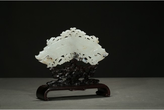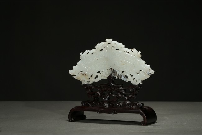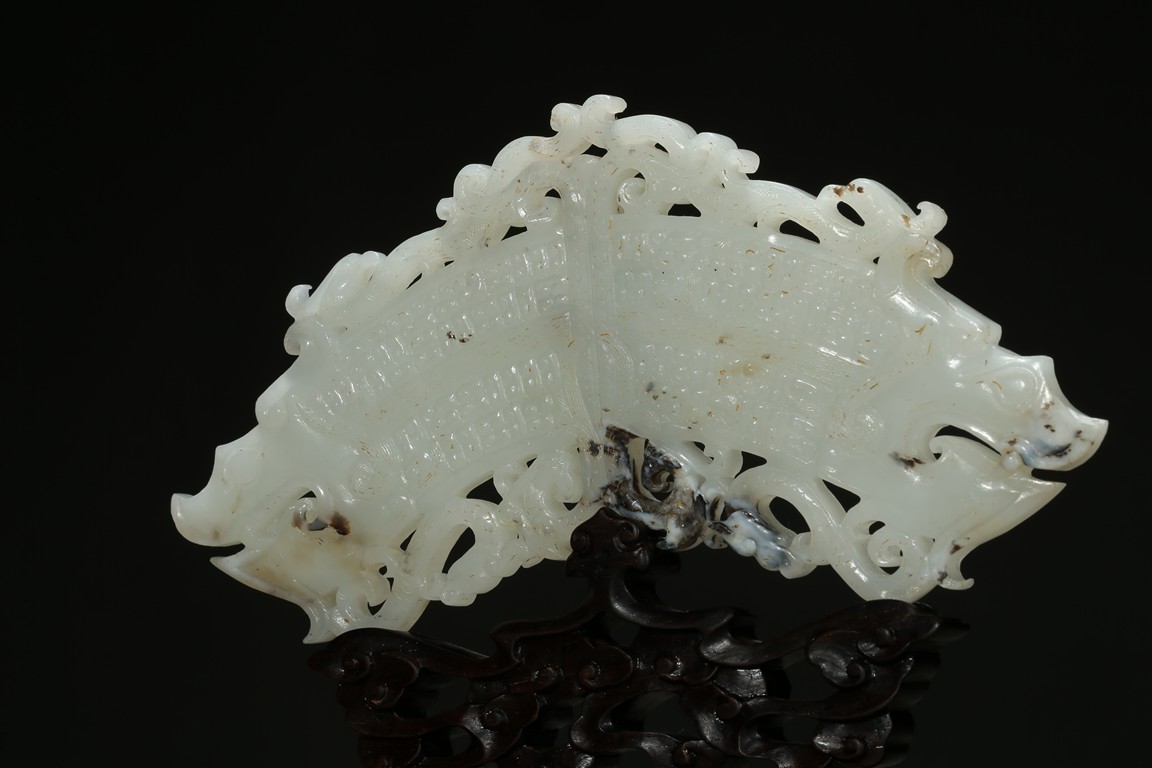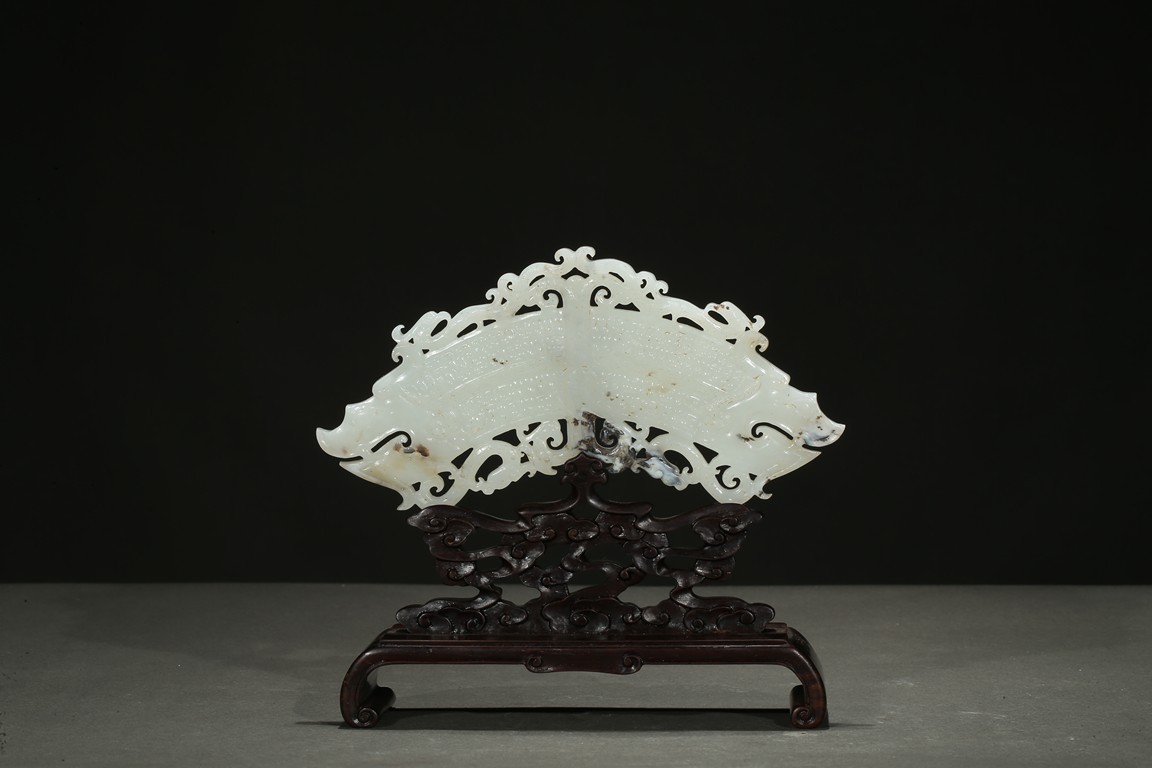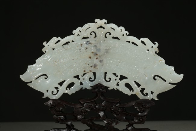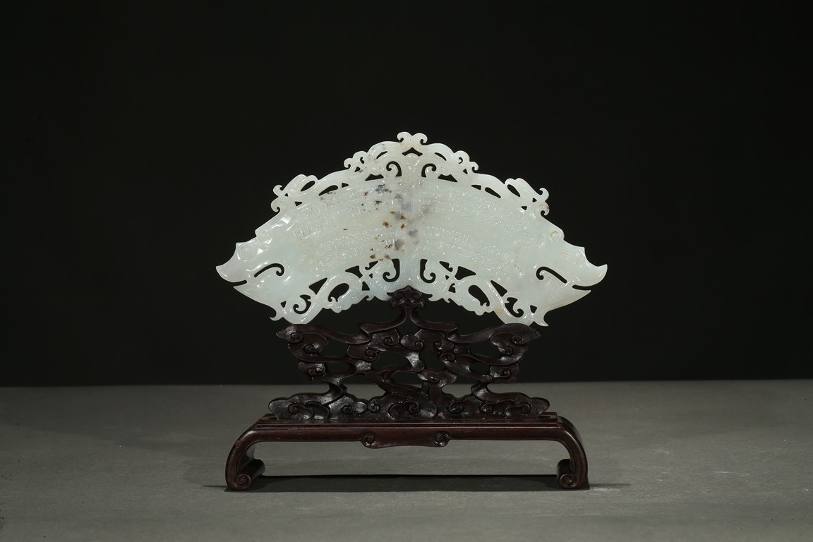 The jade pendant terminating with a pair of dragon heads, the open jaws exposing fangs and curled beards, pierced through an additional flange within the inner and outer part of the huang with S-curls, all supported on a hardwood stand.