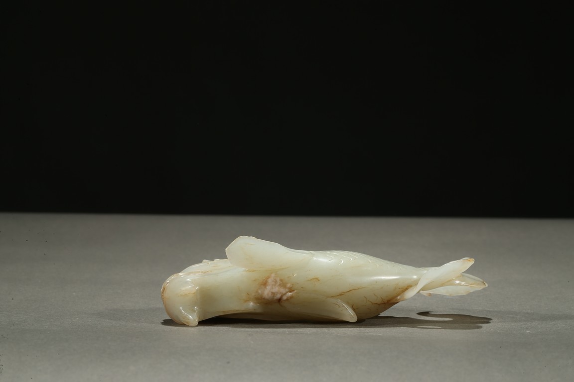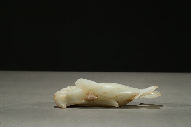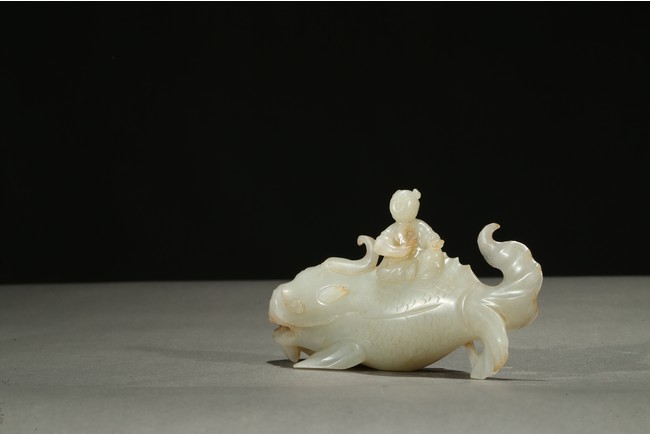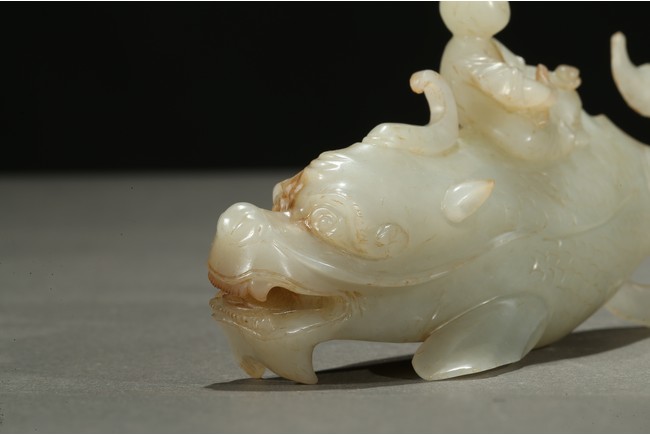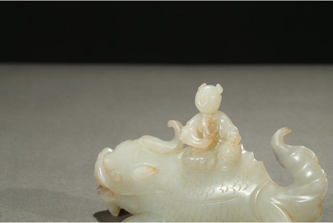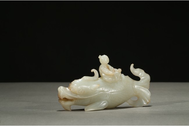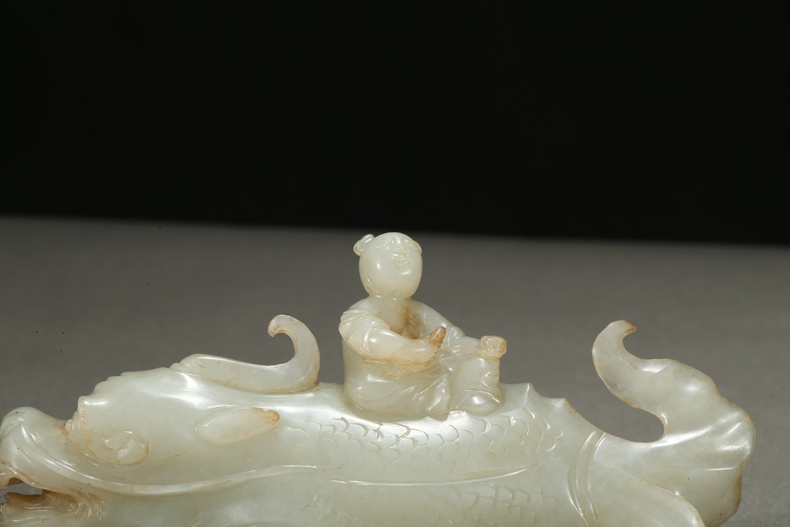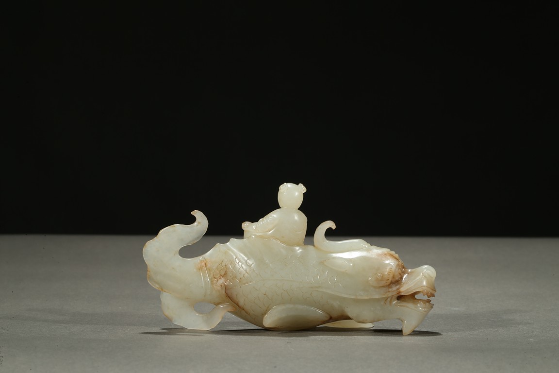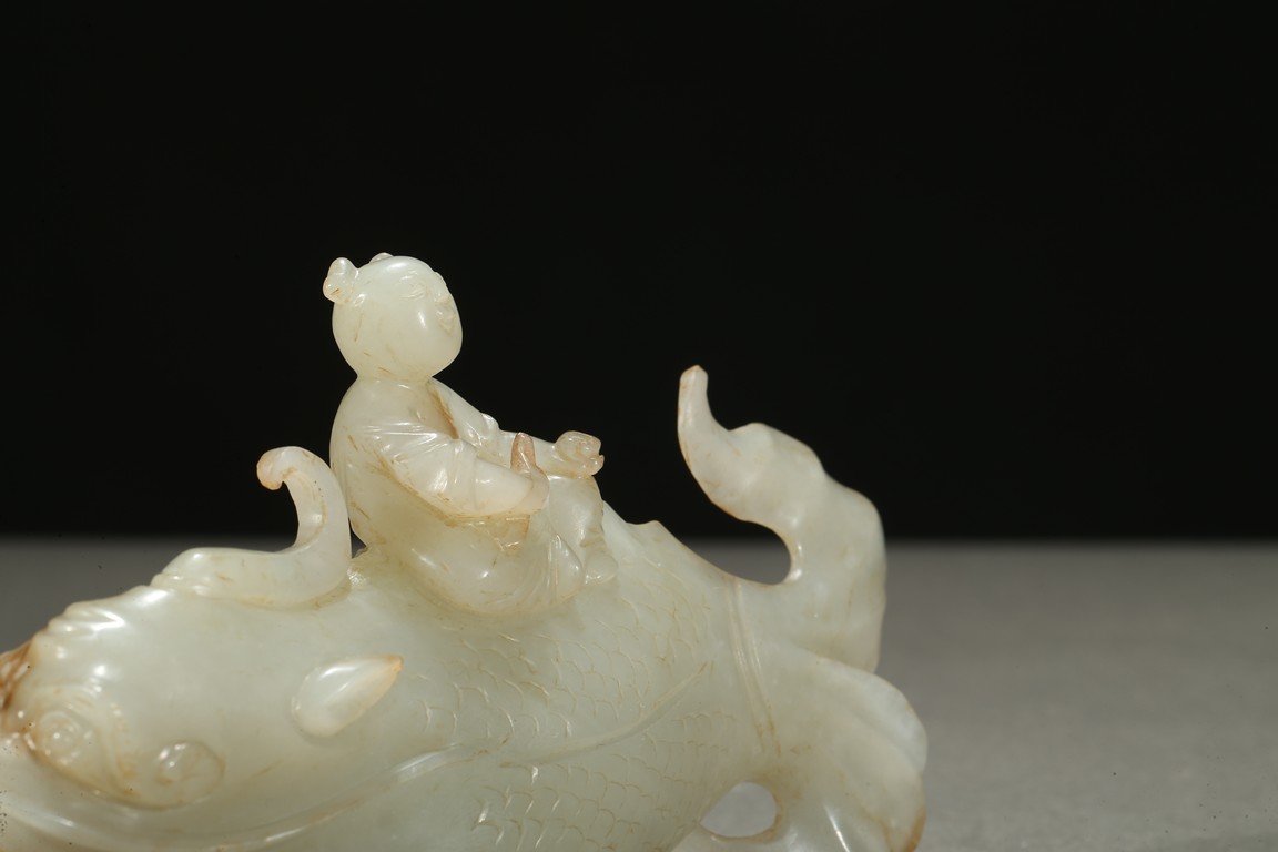 Finely carved as a boy seated upon a large mythical beast with carp fish body and dragon head, the seated boy's head raised with joyful expression, one hand holding a bowl, upon the scaly body of the dragon fish, its head with large gaping mouth, the stone is of even white tone with slight russet streaks. Ming Dynasty period.