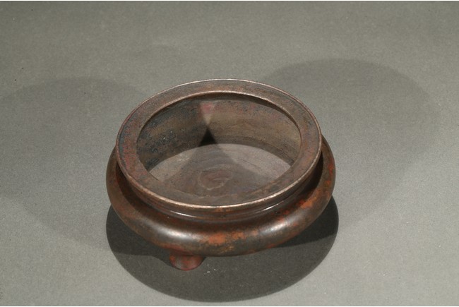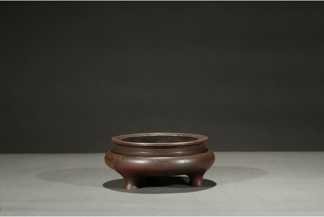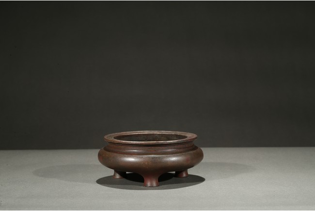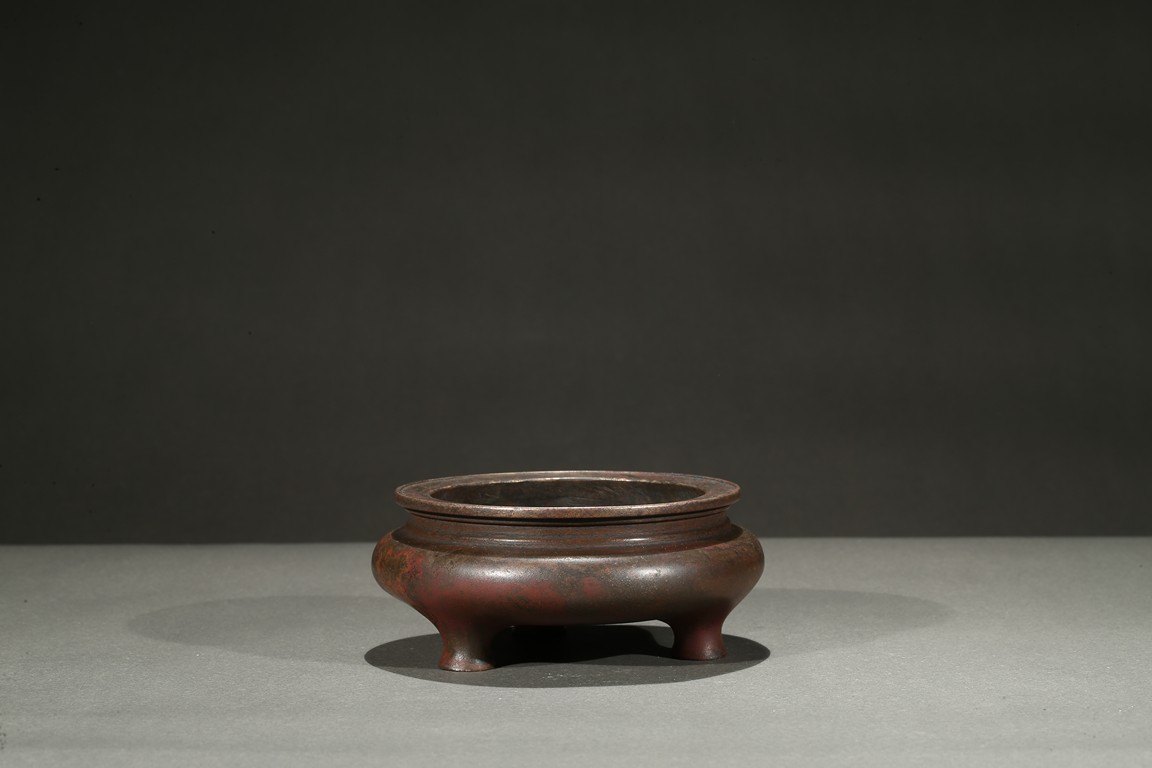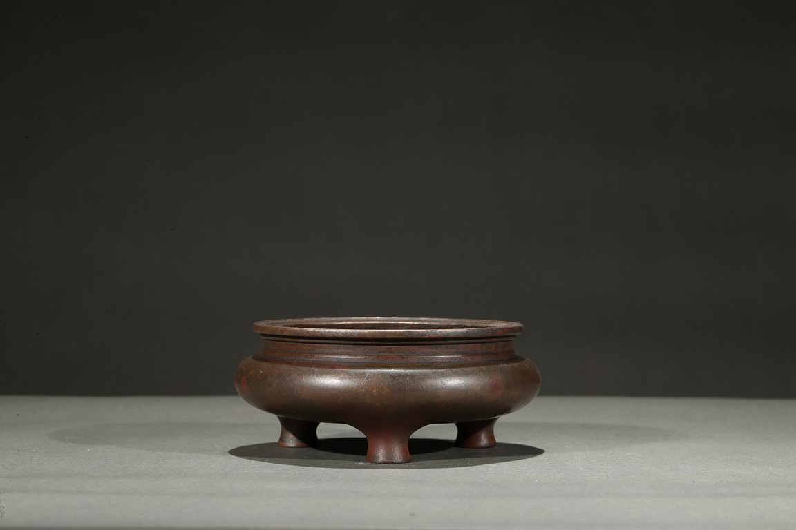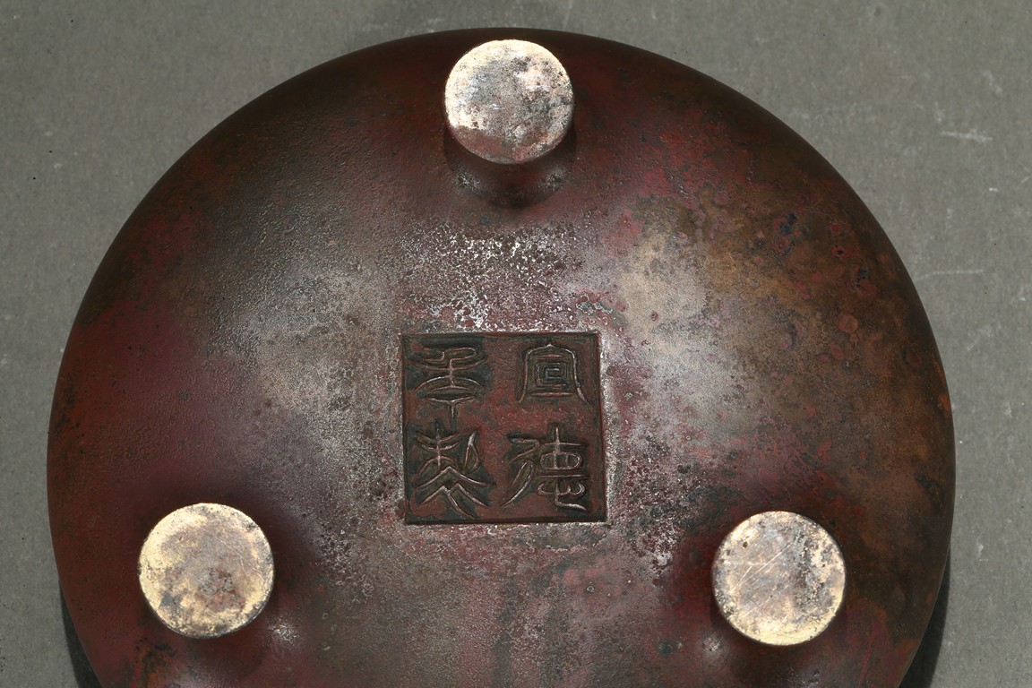 The compressed globular body rising from three splayed feet to a short neck with a wide everted lipped rim, the bronze patinated to a deep brown, the underside cast with a Xuande mark within a rectangle. Ming Dynasty period.