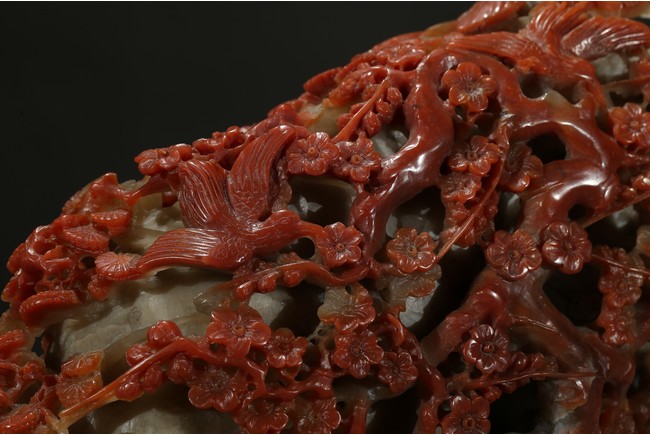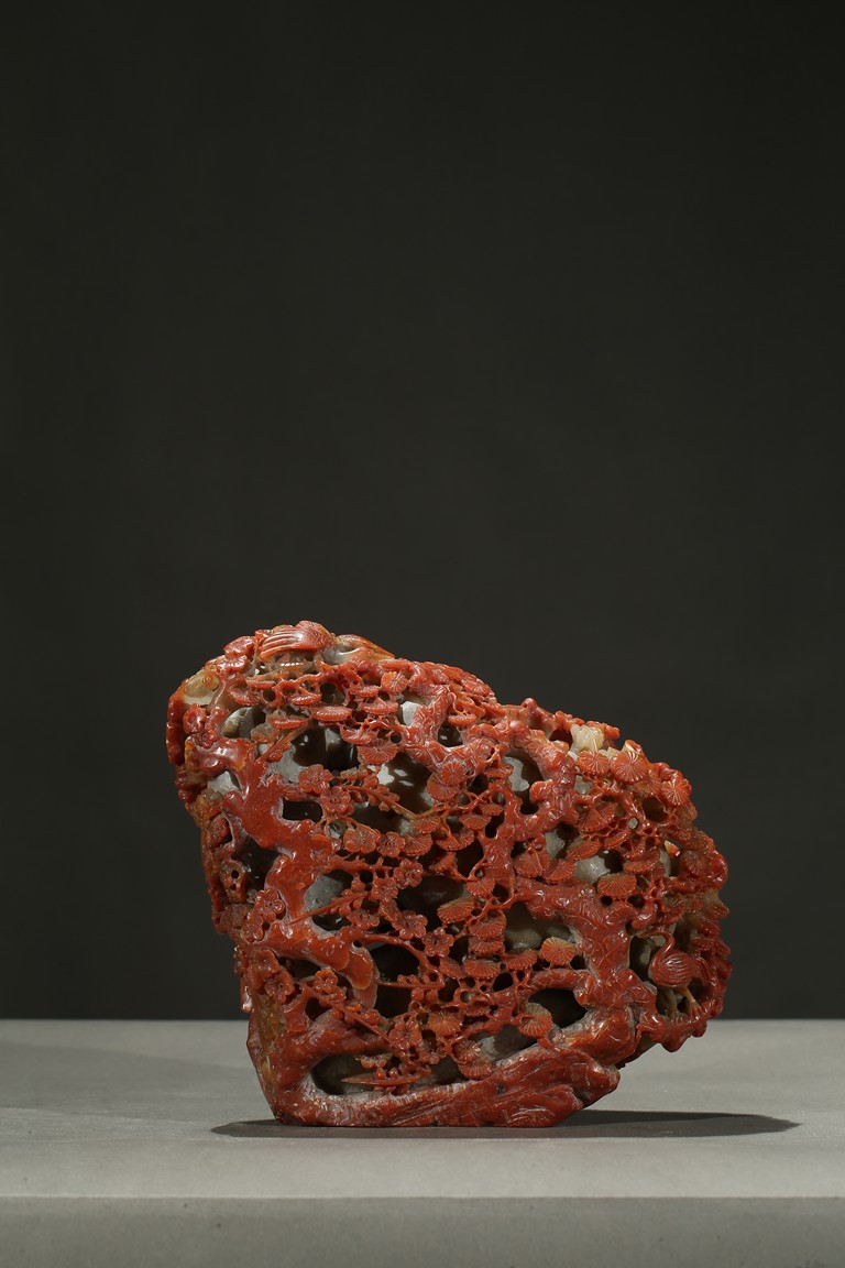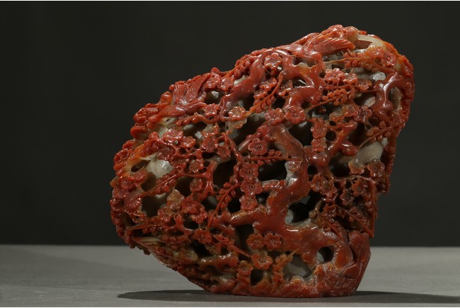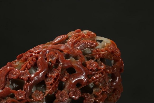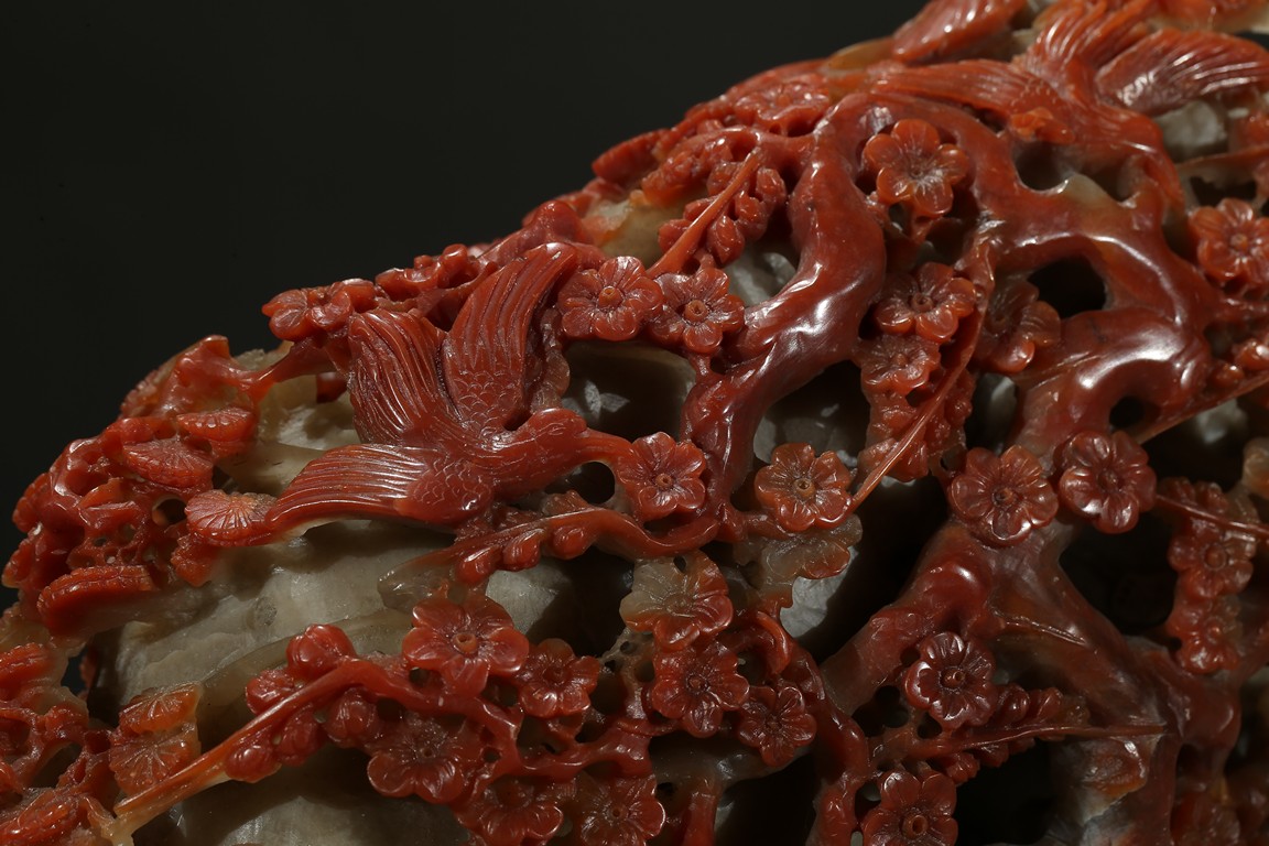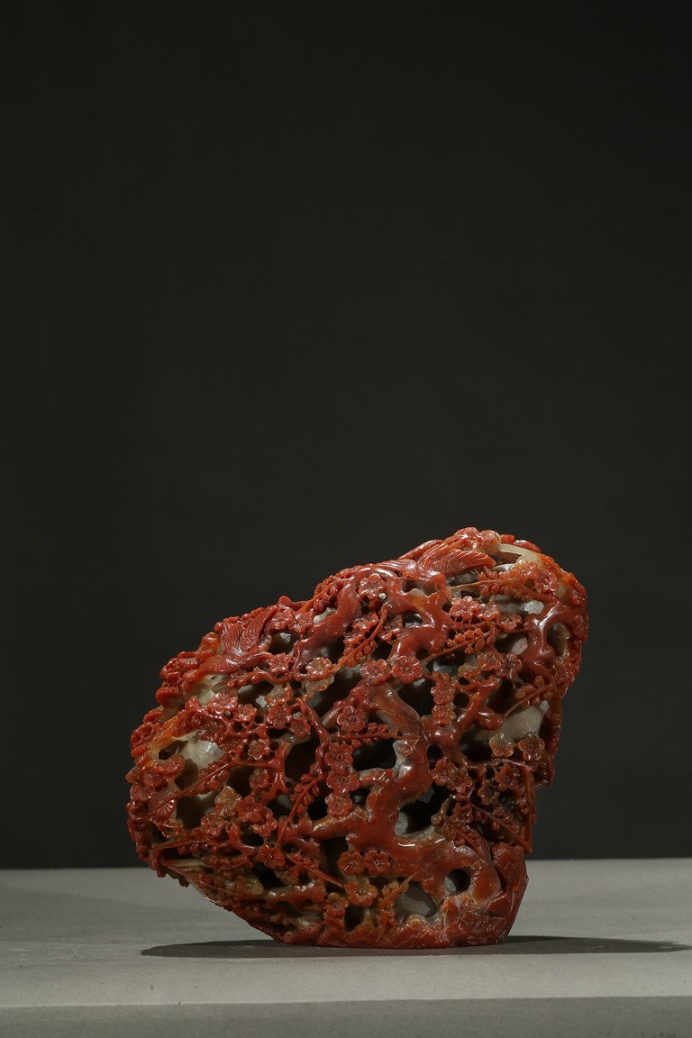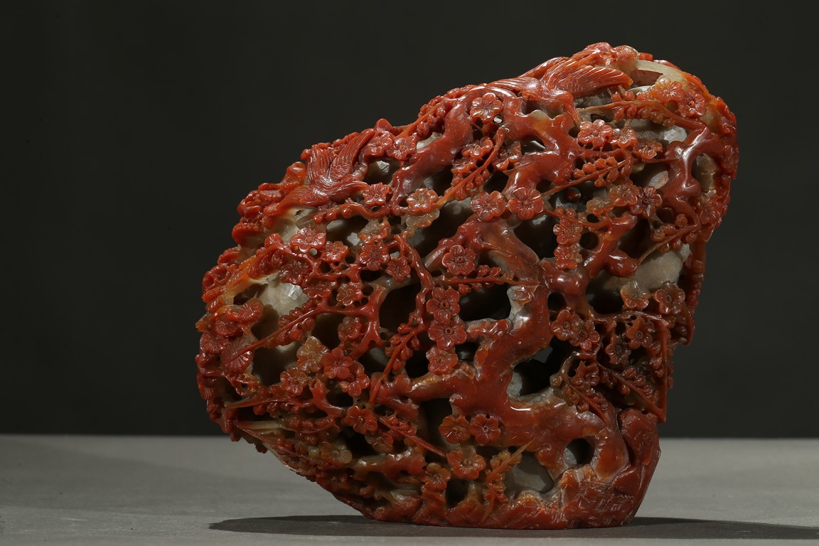 The jade boulder is finely carved and pierced to depict network of plum blossom branches and magpies on the exterior, utilizing the red tone. Qing Dynasty period.