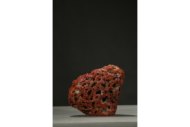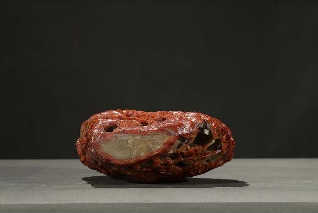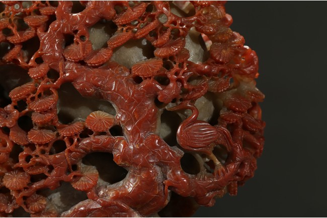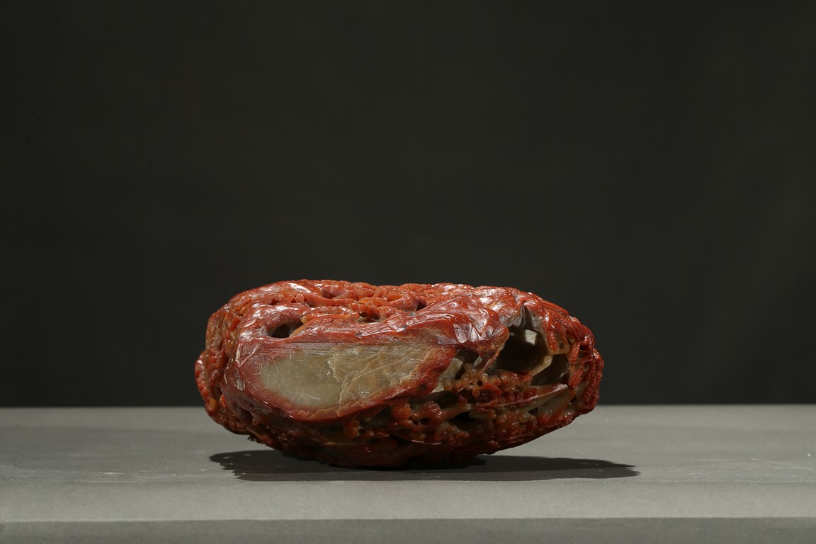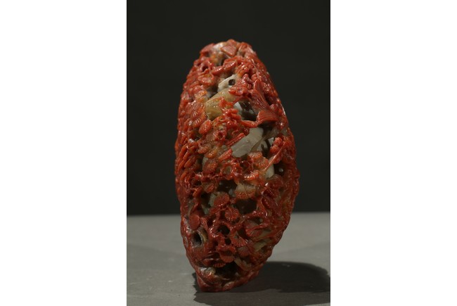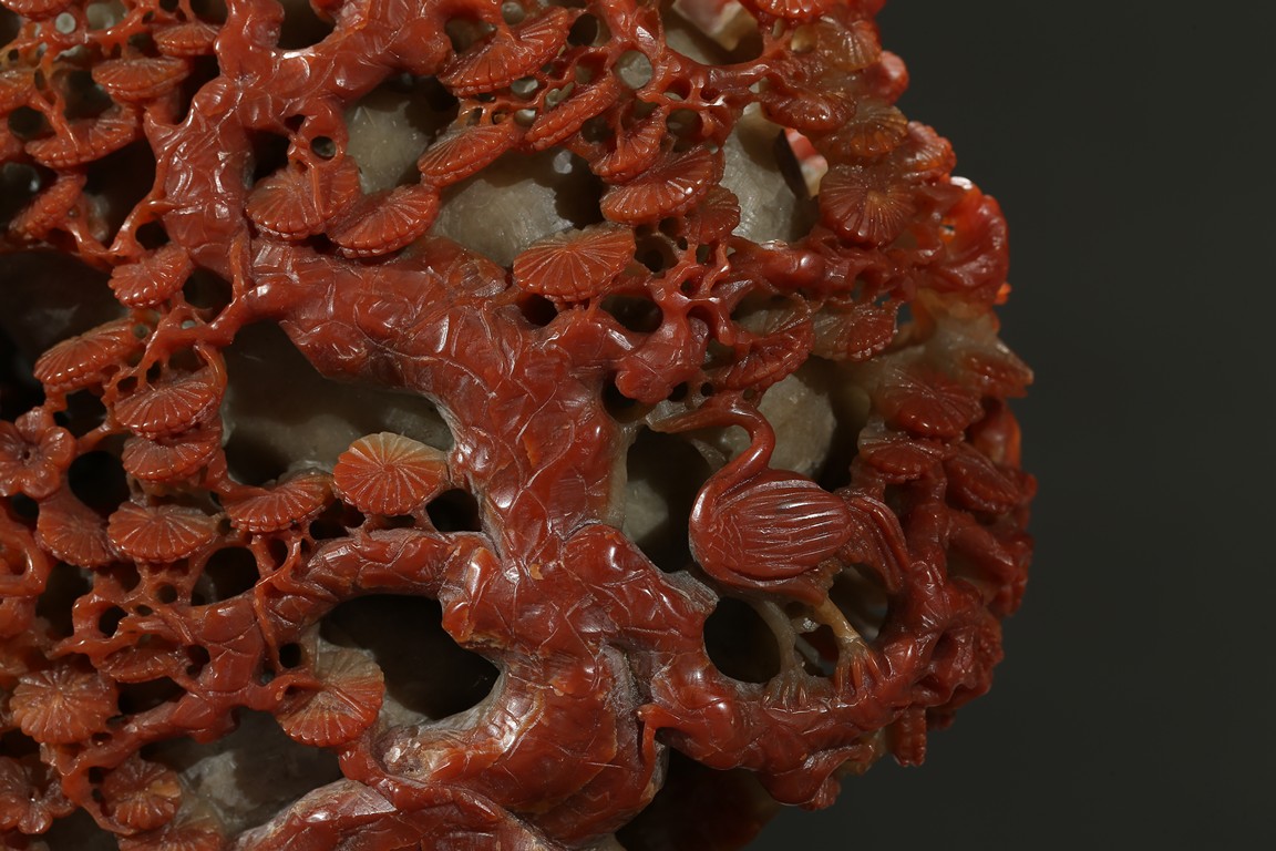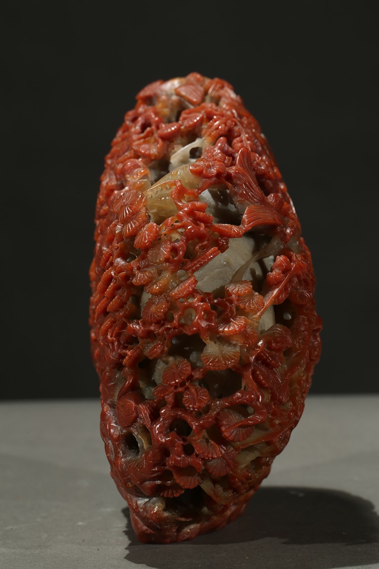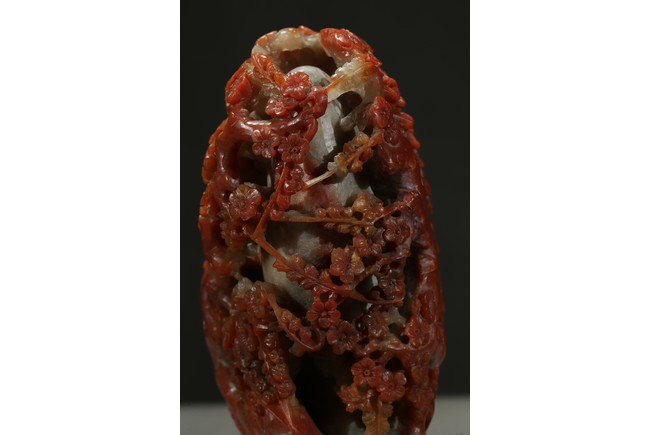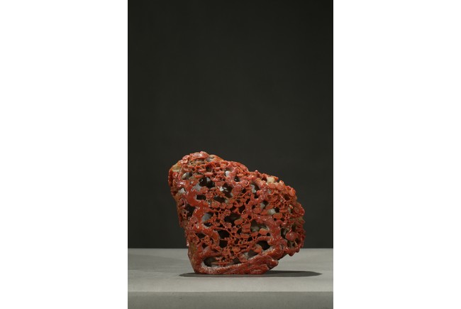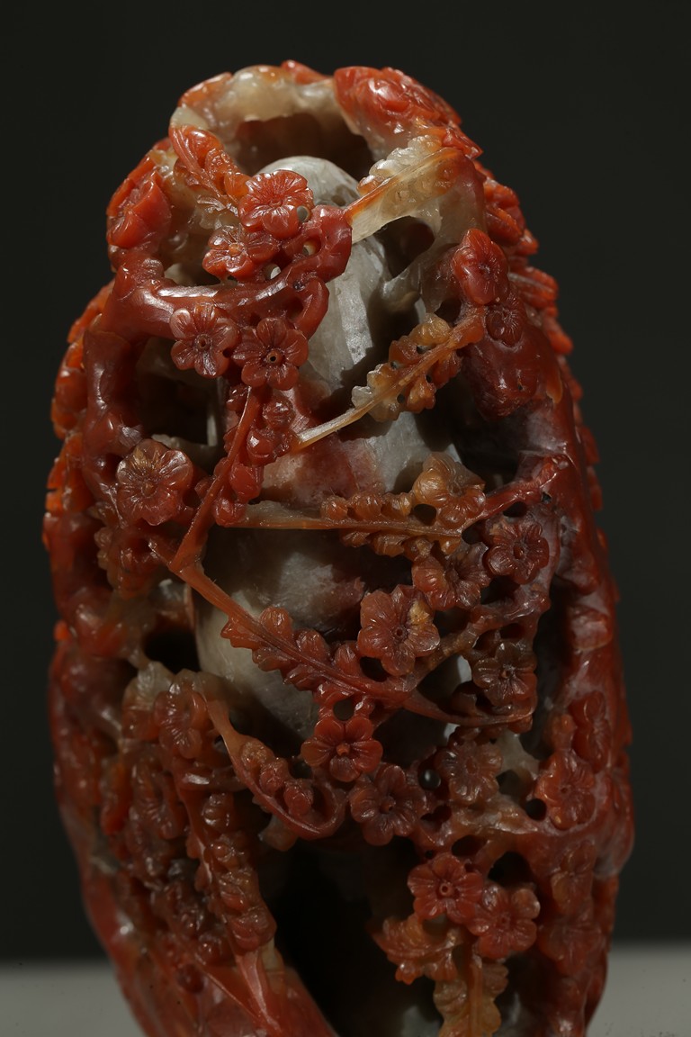 The jade boulder is finely carved and pierced to depict network of plum blossom branches and magpies on the exterior, utilizing the red tone. Qing Dynasty period.