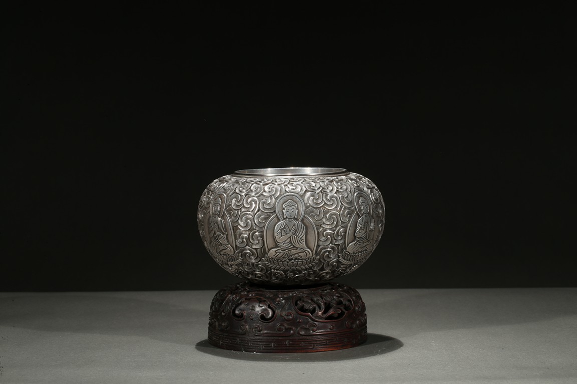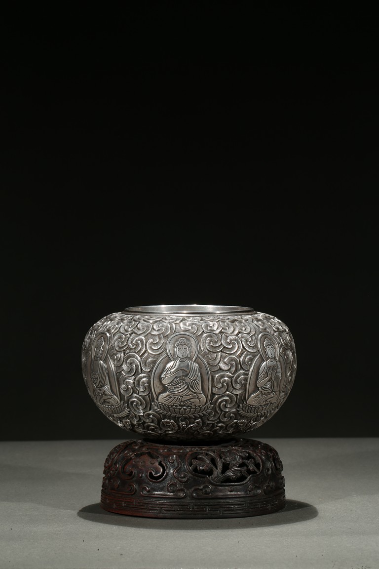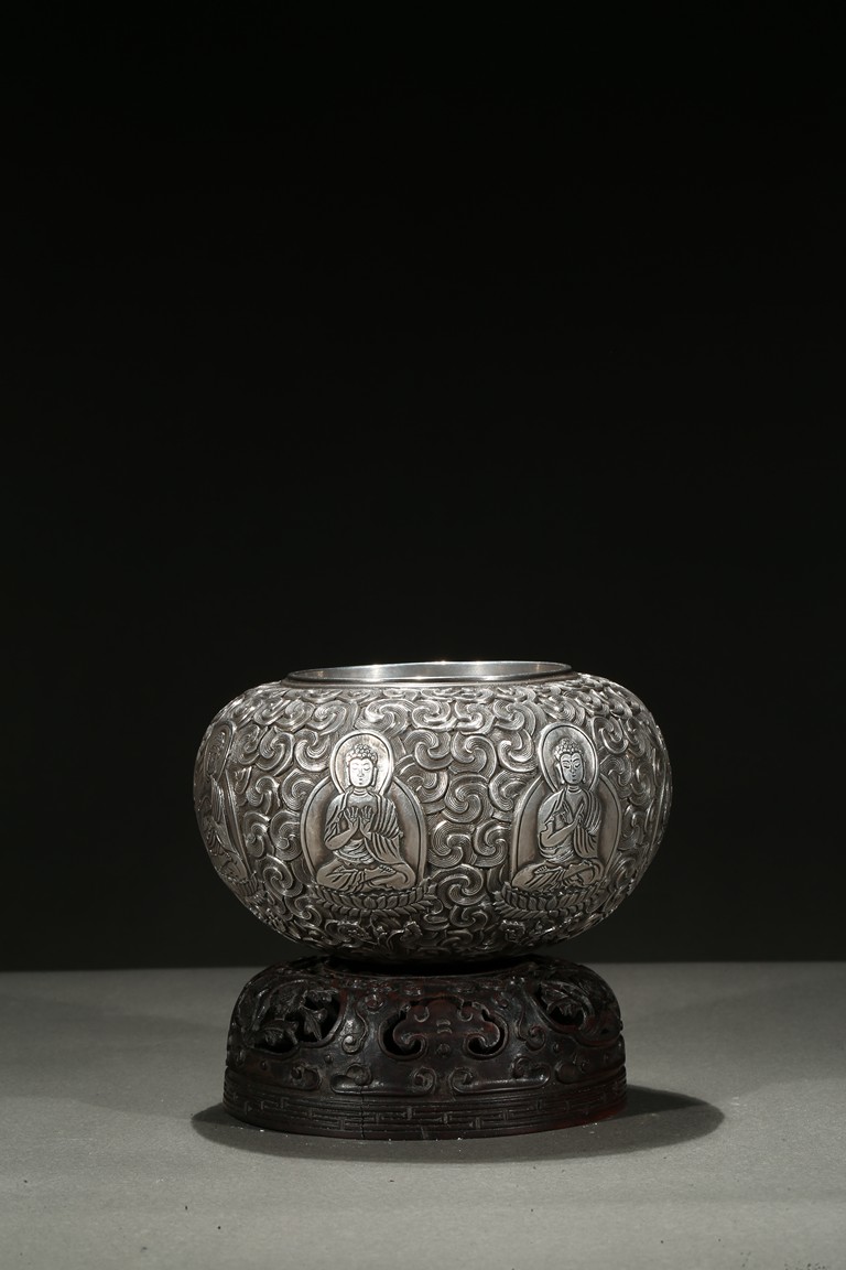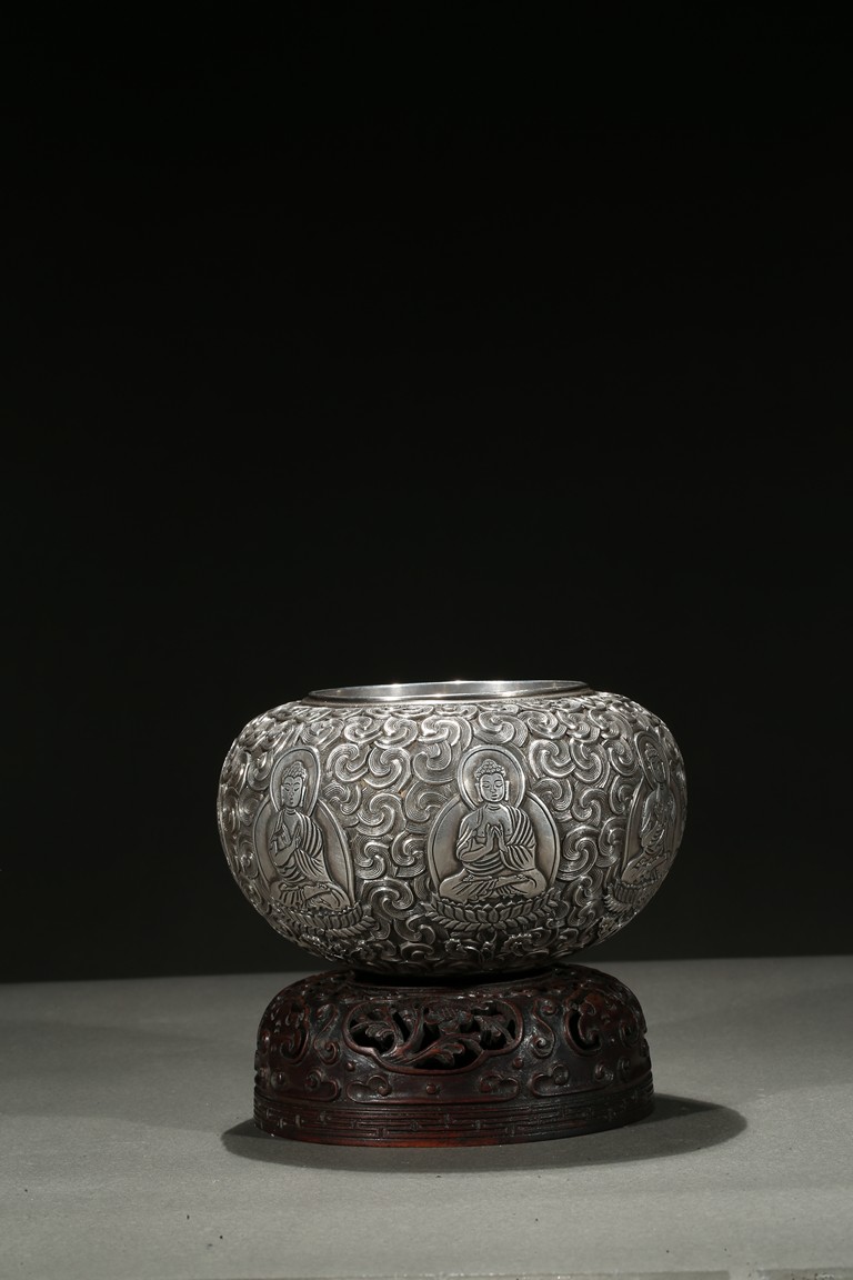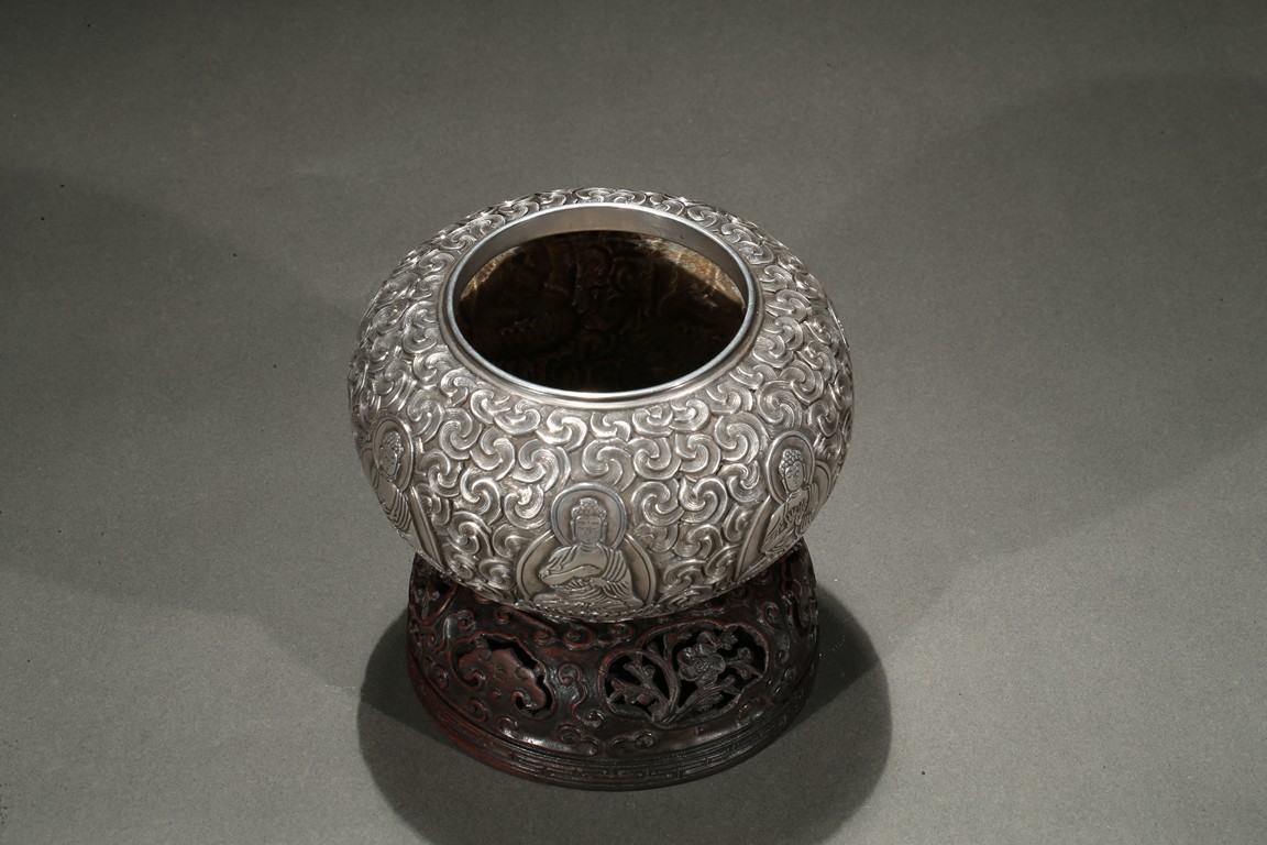 Modelled with a compressed globular body, the exterior decorated with a band of seated shakyamuni in various hand mudra upon double lotus throne amidst dense clouds, the base moulded with layers of lotus petals, all supported on a fitted rosewood reticulated domed-shaped stand. Qing Dynasty period.