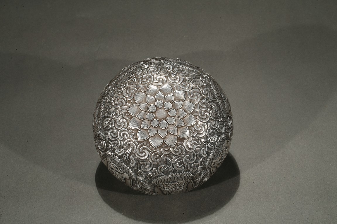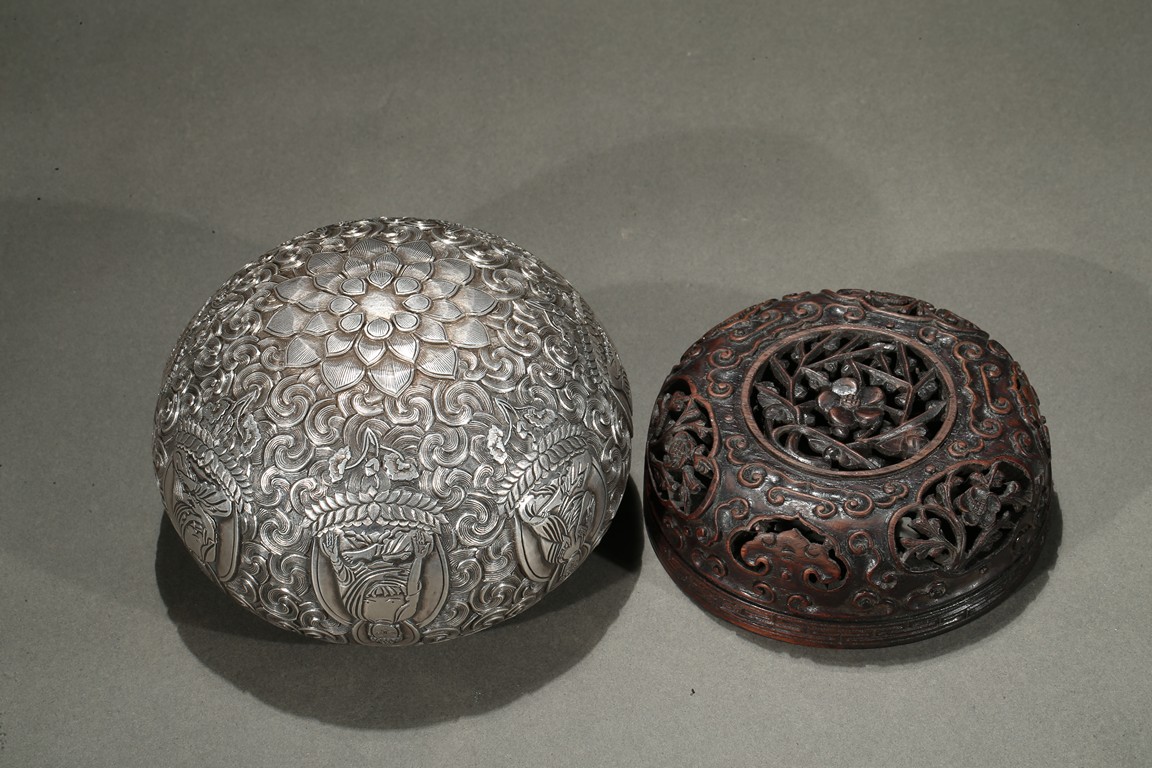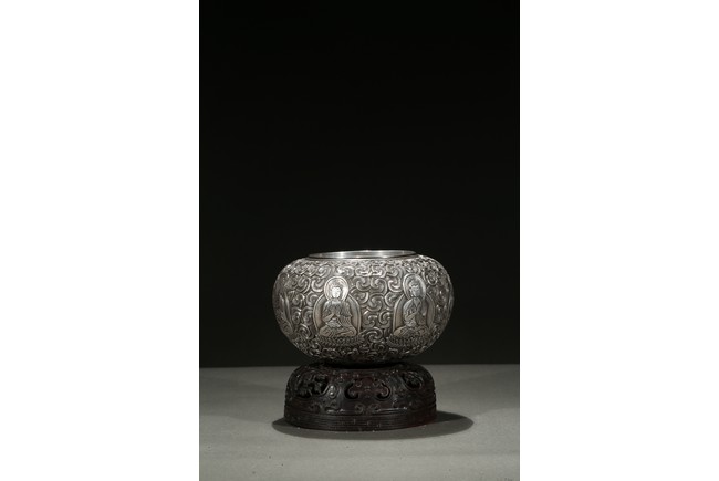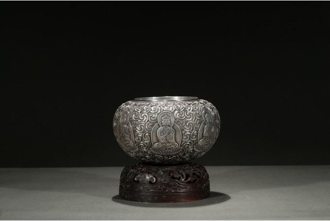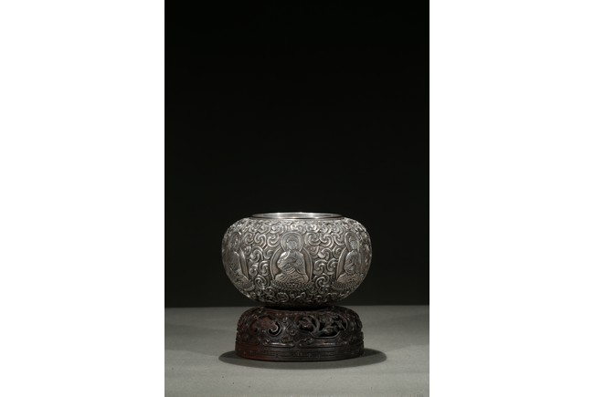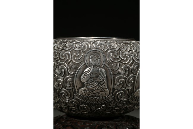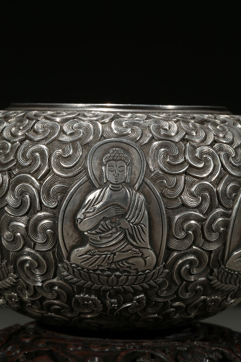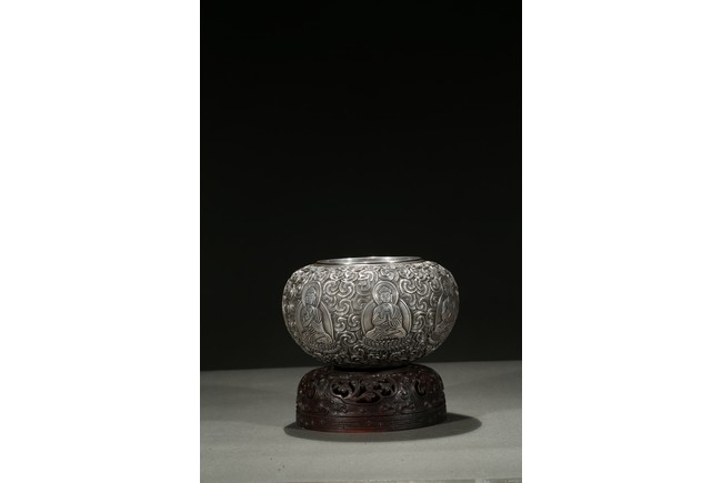 Modelled with a compressed globular body, the exterior decorated with a band of seated shakyamuni in various hand mudra upon double lotus throne amidst dense clouds, the base moulded with layers of lotus petals, all supported on a fitted rosewood reticulated domed-shaped stand. Qing Dynasty period.