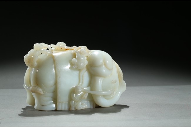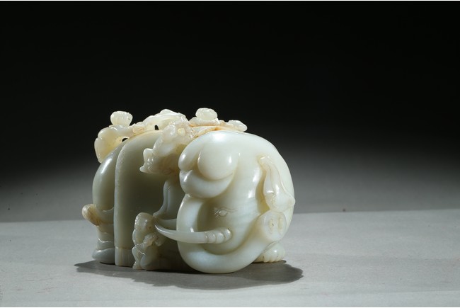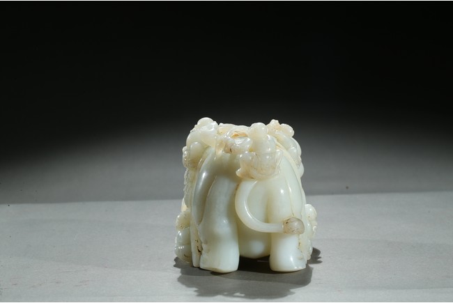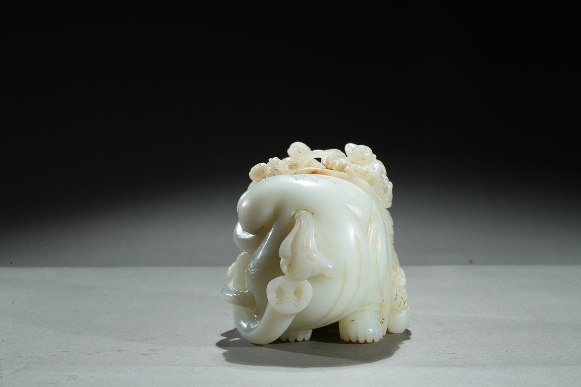 The elephant is shown standing foursquare with head turned left, delicately carved in high relief with boys hanging and playing on the elephant. Qing Dynasty period.