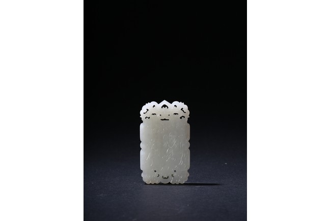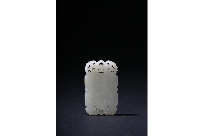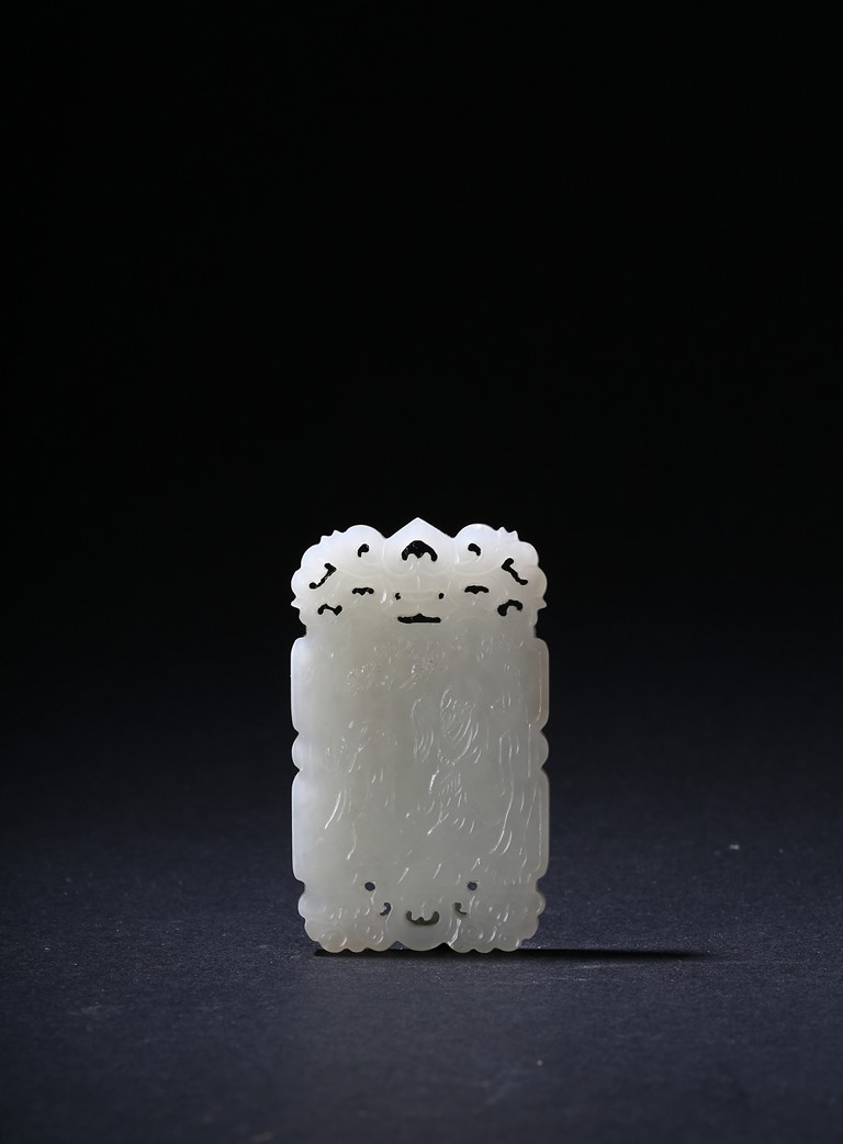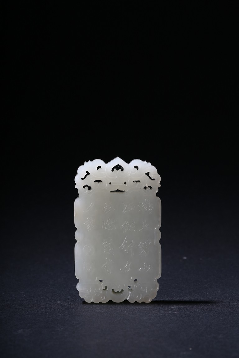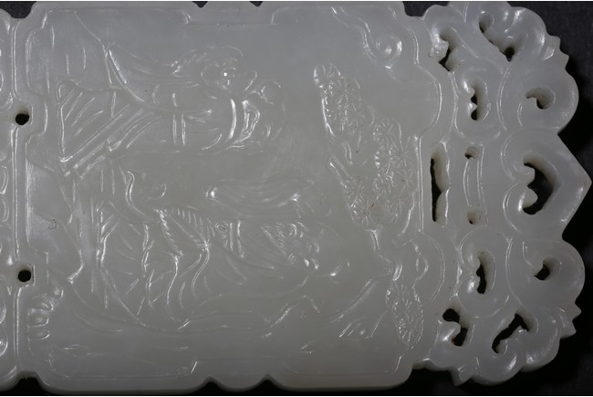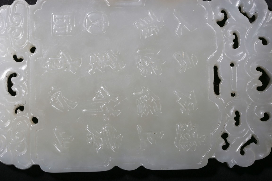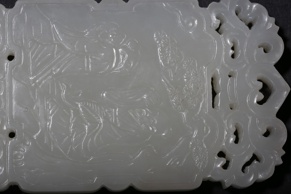 Well carved with two elderly men conversing below a pine tree on a rocky landscape, the reverse carved with a poem and two seal marks, all framed by floral and cloud scrolls, the stone is of even white tone.