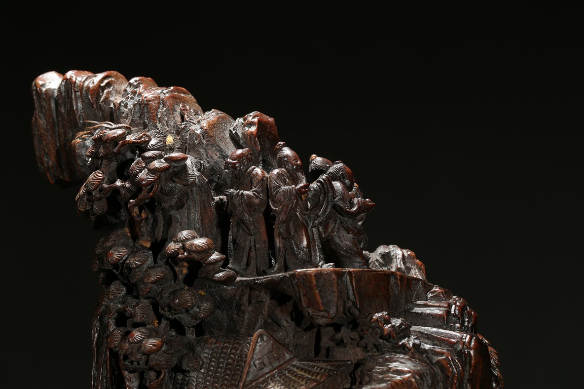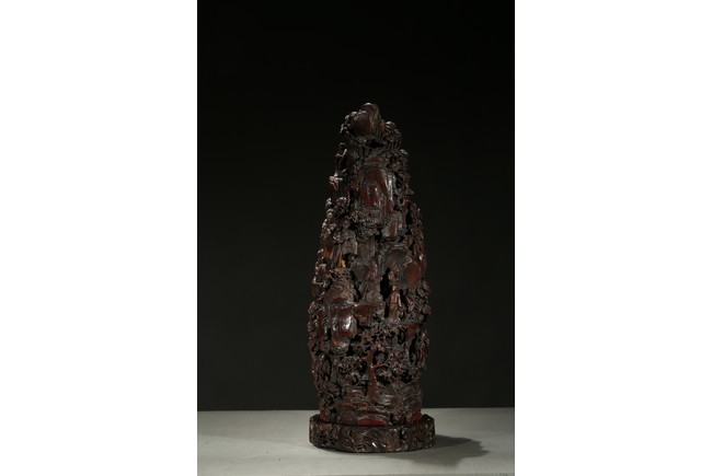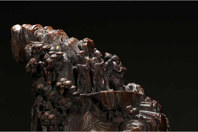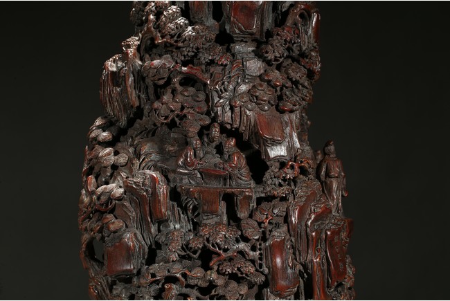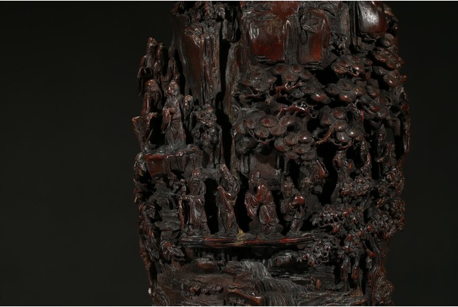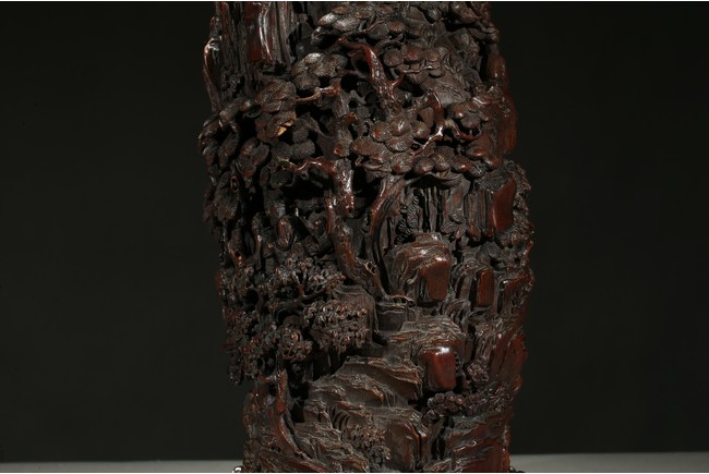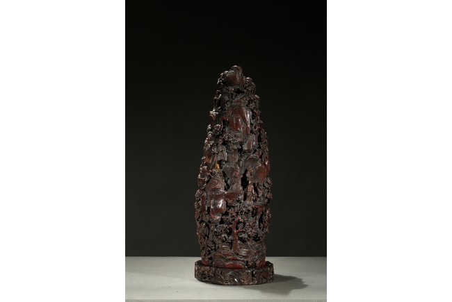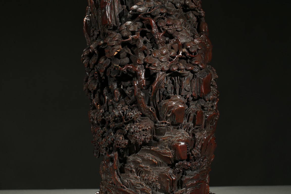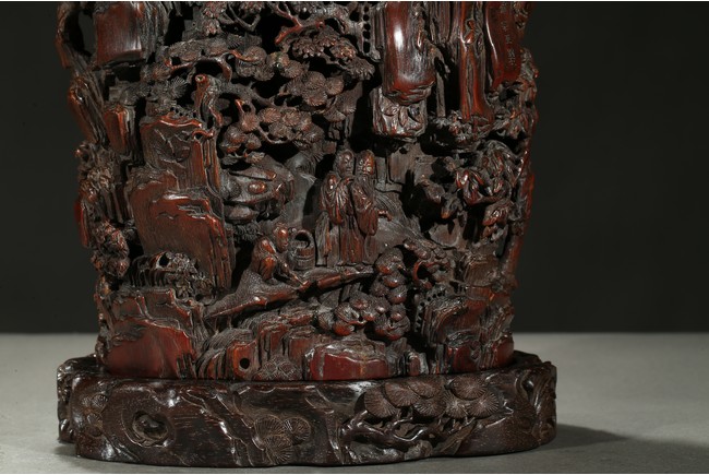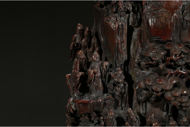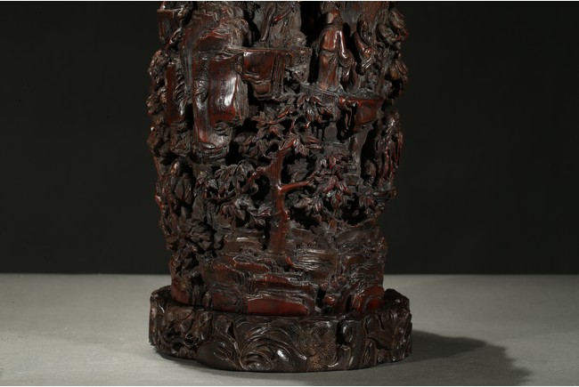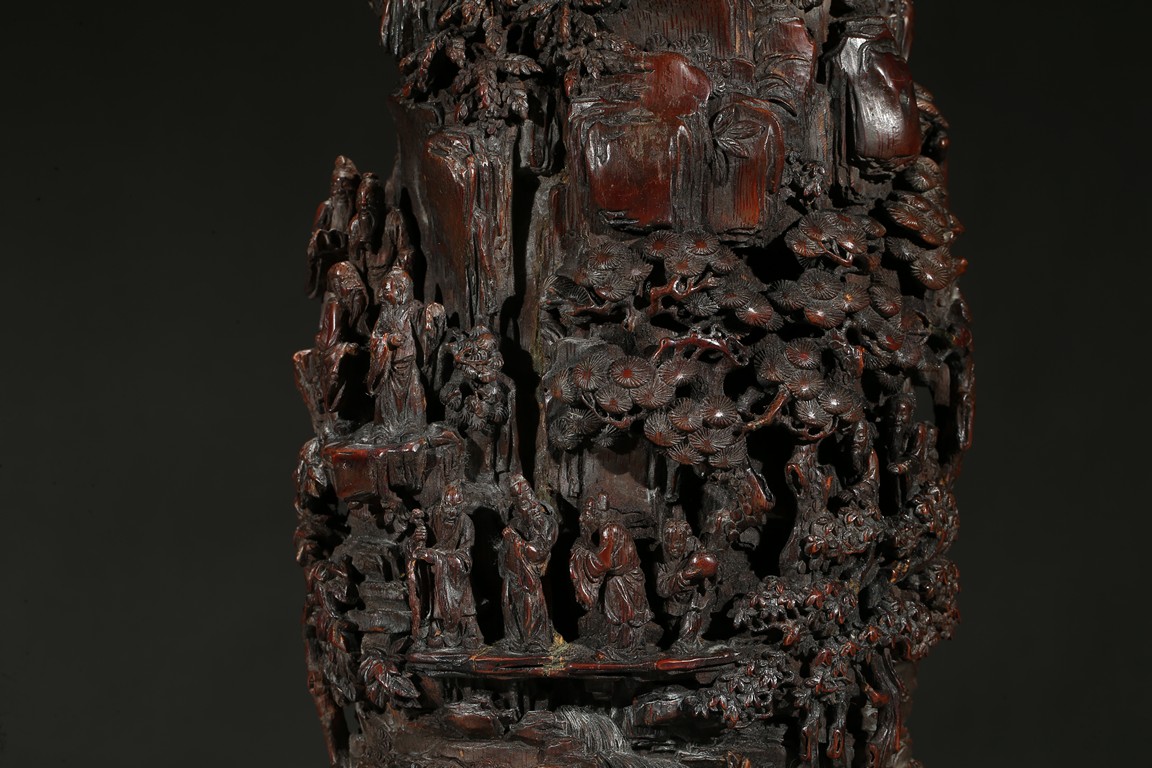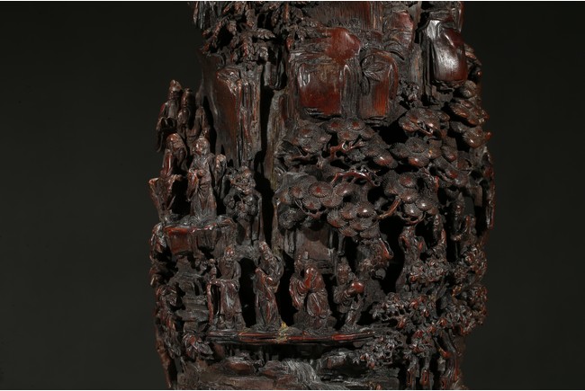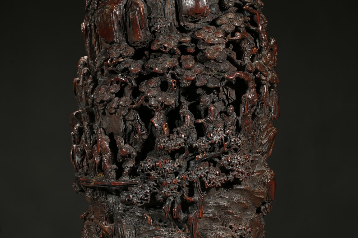 The large bamboo trunk is deeply carved with a gathering of numerous immortals and attendants in a tall mountainous setting, amidst various trees including pines and wutong and pavillions. Qing Dynasty period.