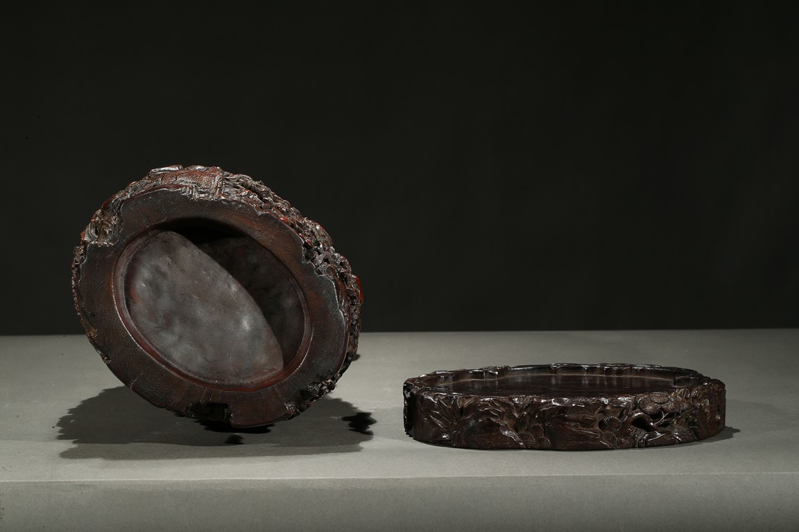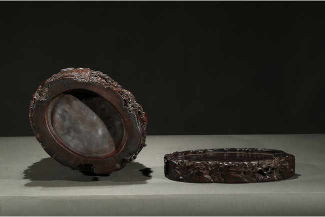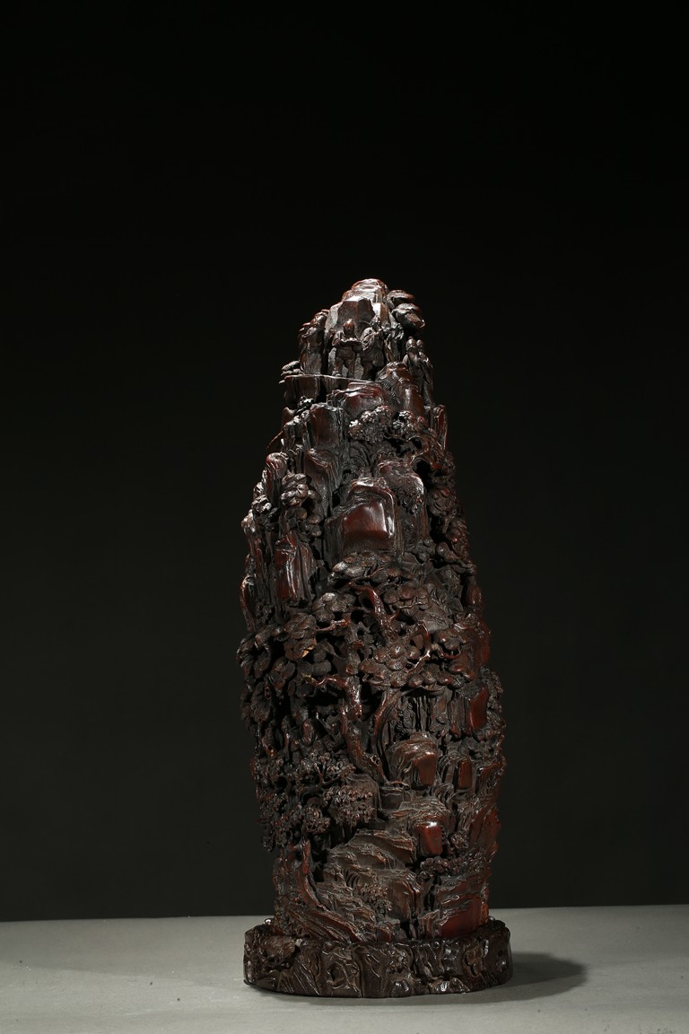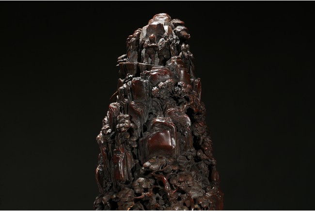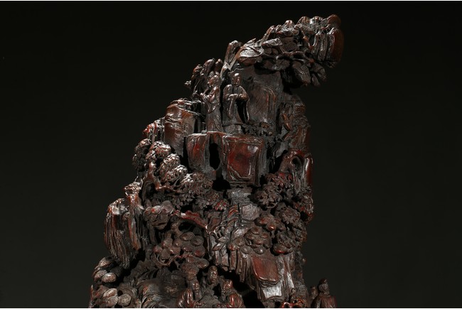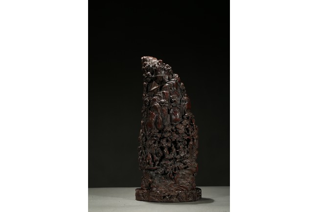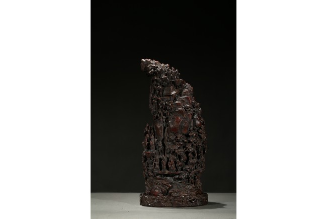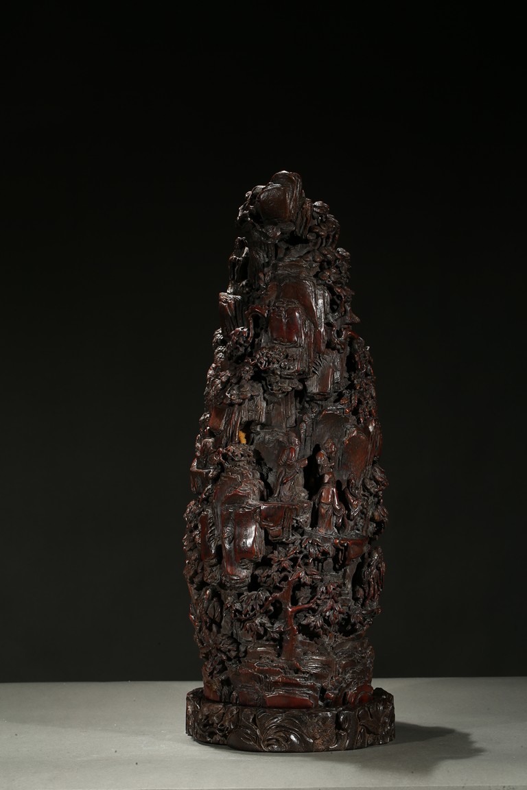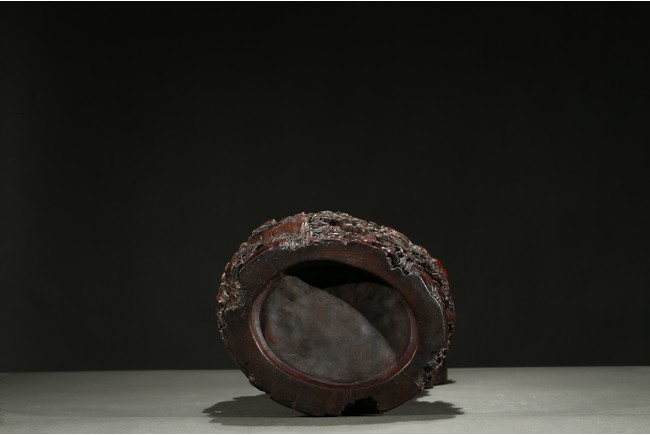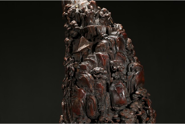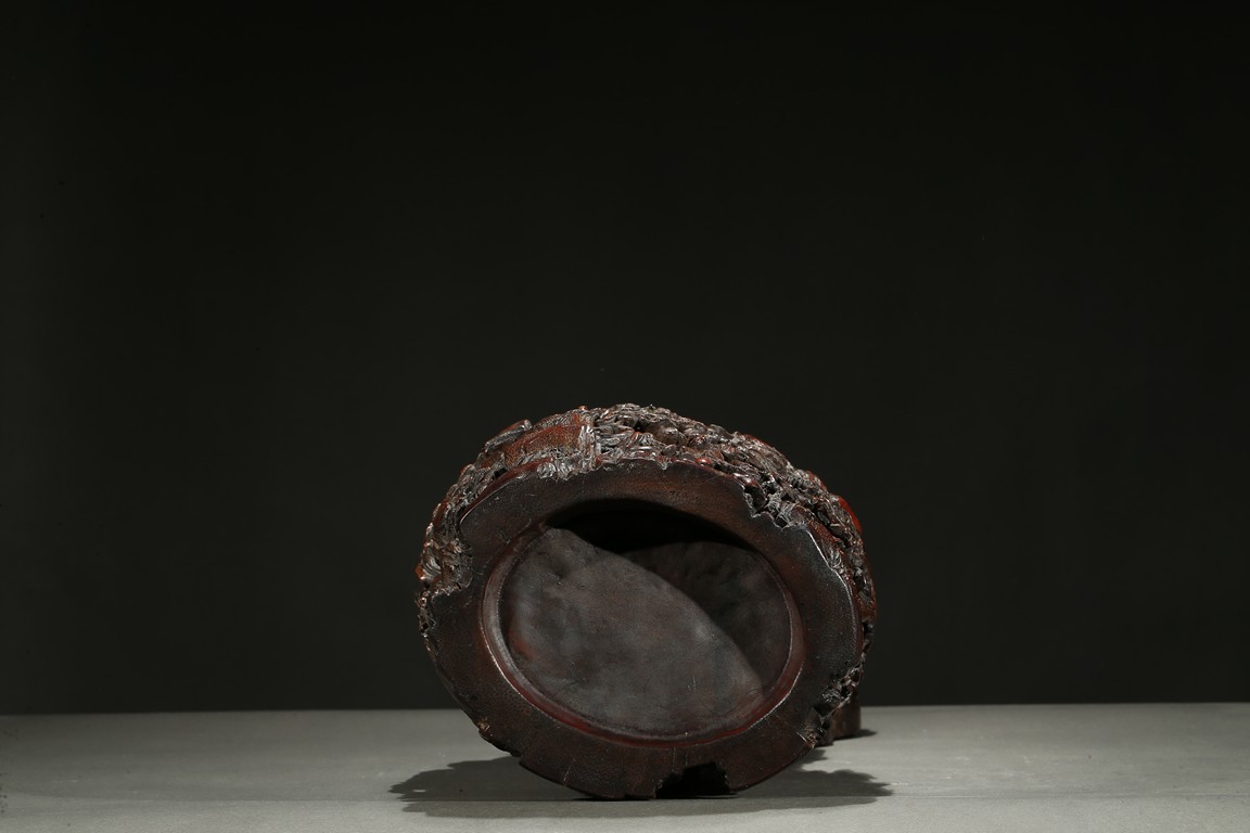 The large bamboo trunk is deeply carved with a gathering of numerous immortals and attendants in a tall mountainous setting, amidst various trees including pines and wutong and pavillions. Qing Dynasty period.