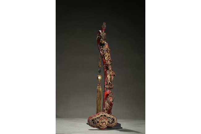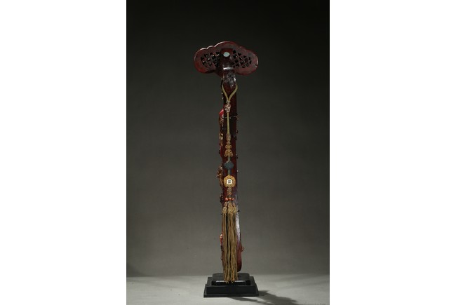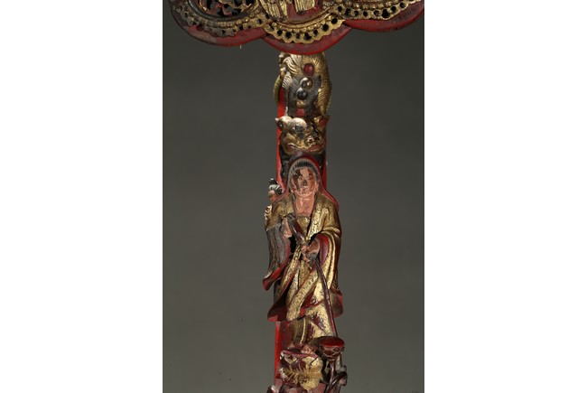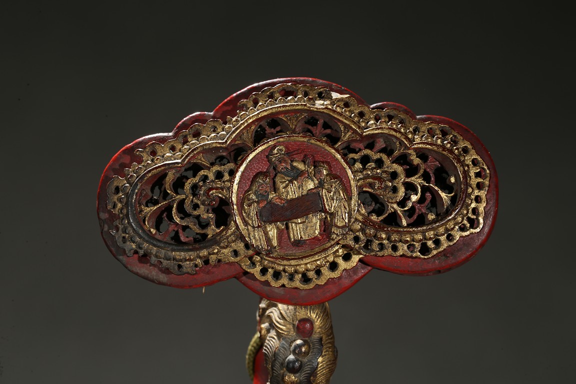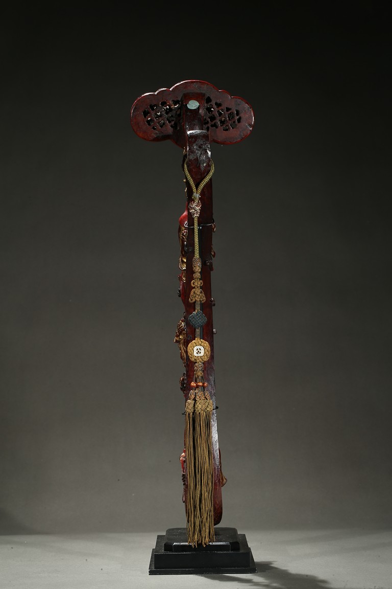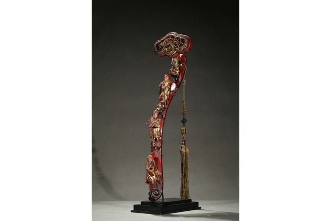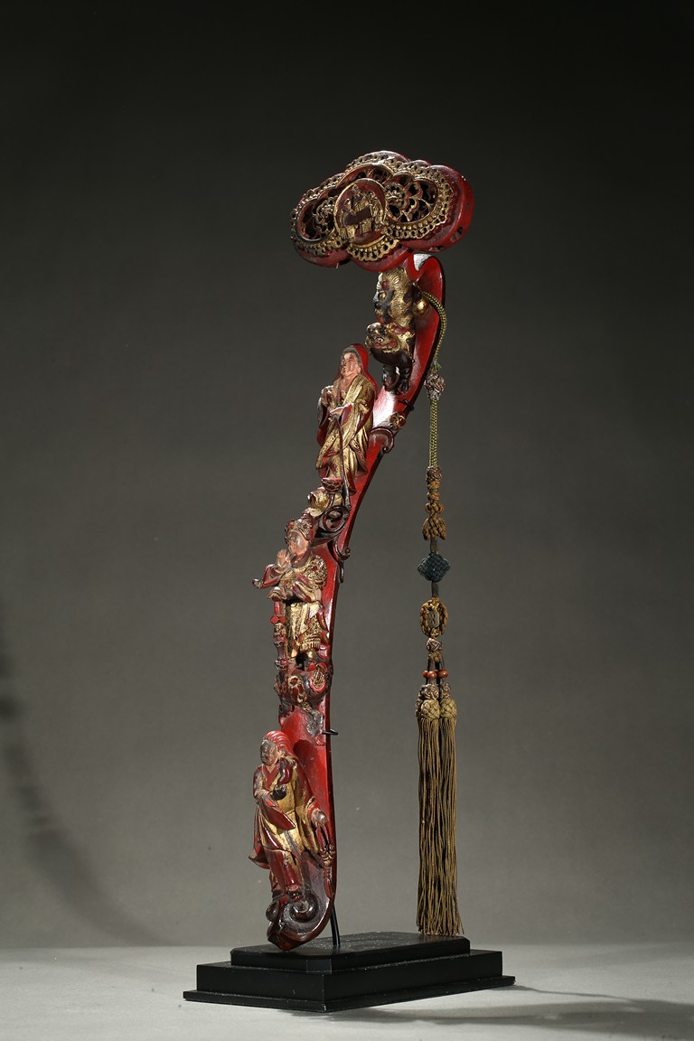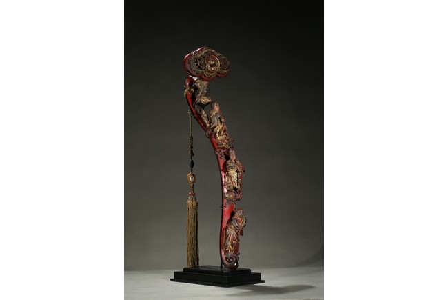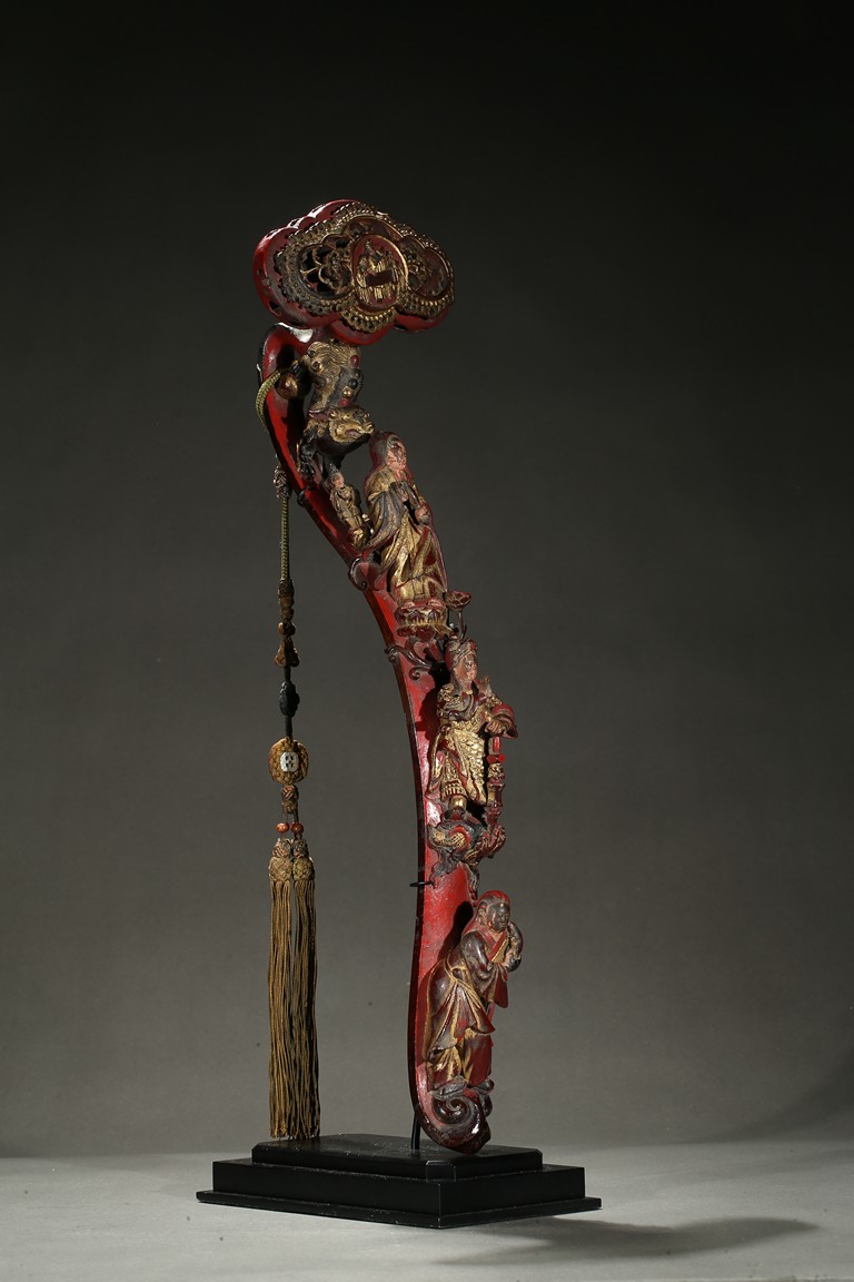 The ruyi head reticulated to depict fu, lu, and shou in a central roundel with scrolled flowers on each side, the ruyi shaft carved in high relief with Daoist immortals. Qing Dynasty period.