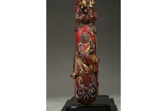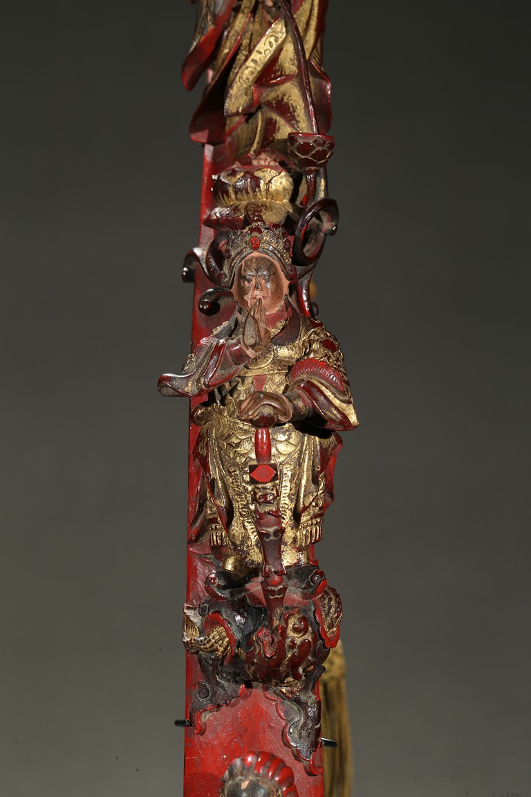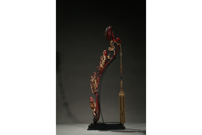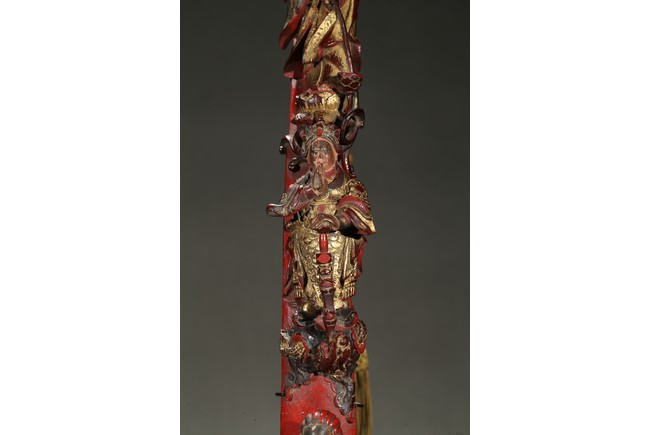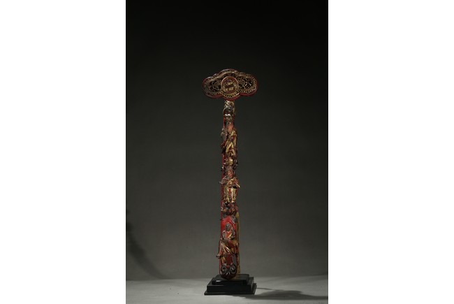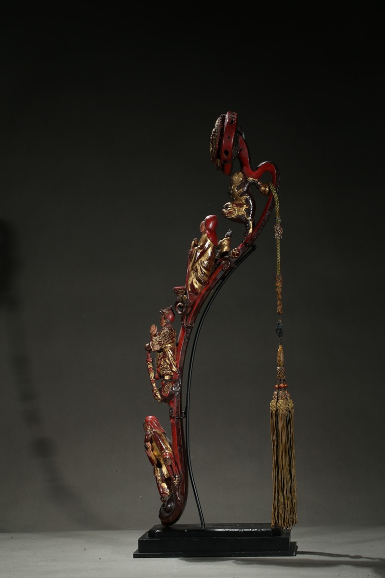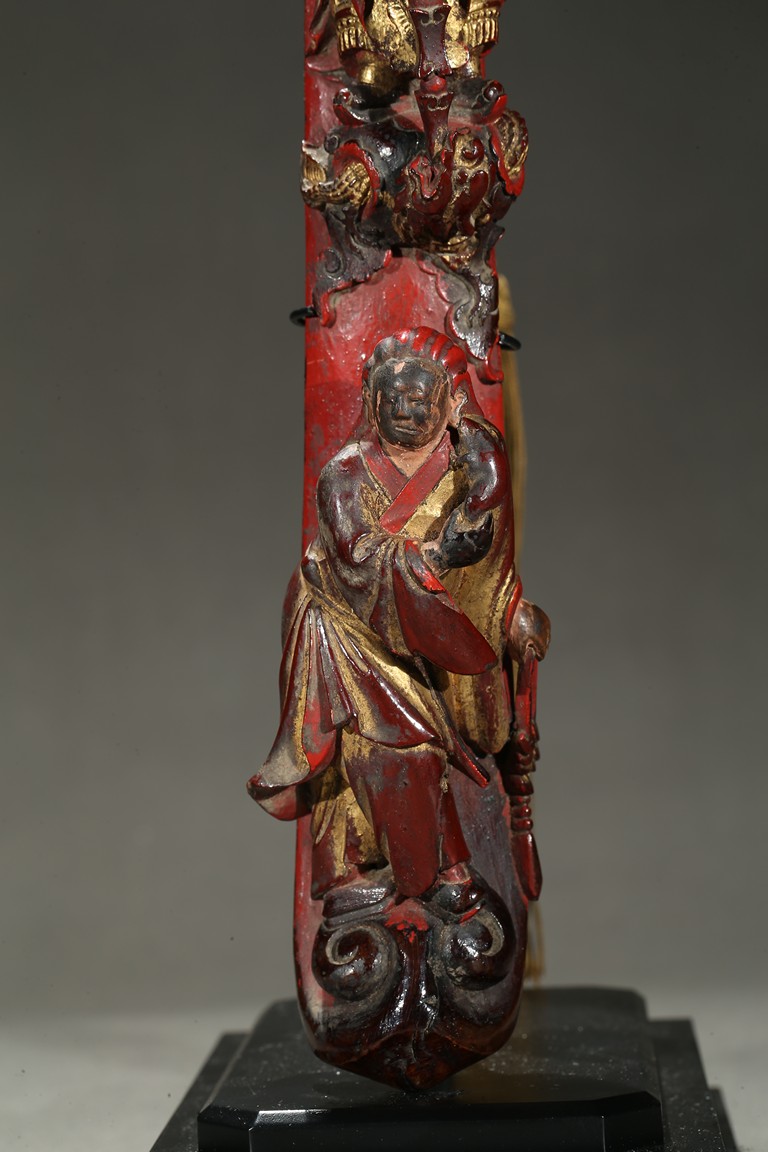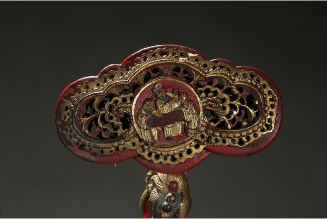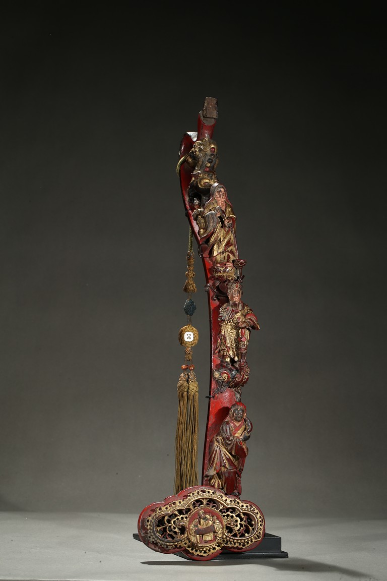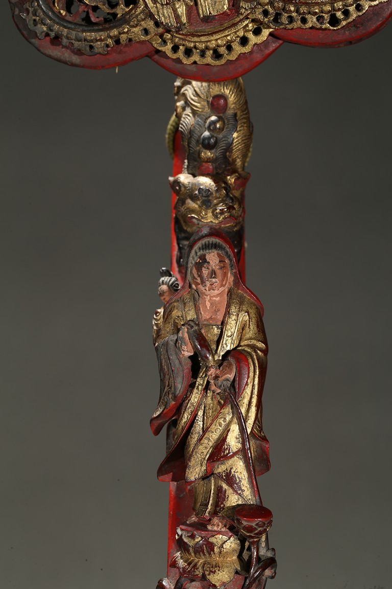 The ruyi head reticulated to depict fu, lu, and shou in a central roundel with scrolled flowers on each side, the ruyi shaft carved in high relief with Daoist immortals. Qing Dynasty period.