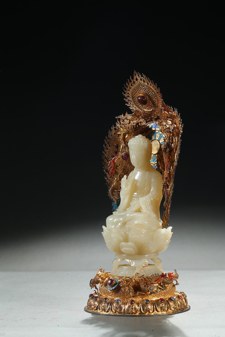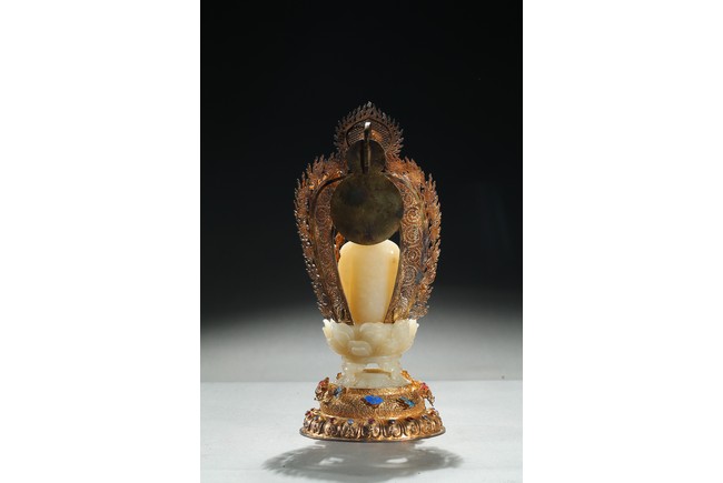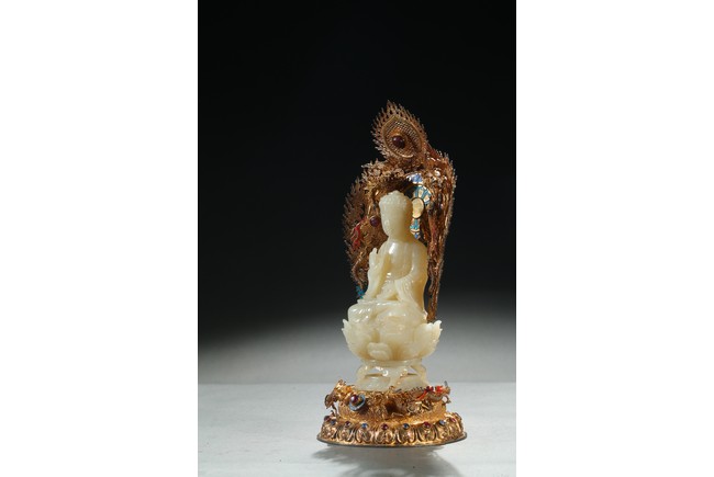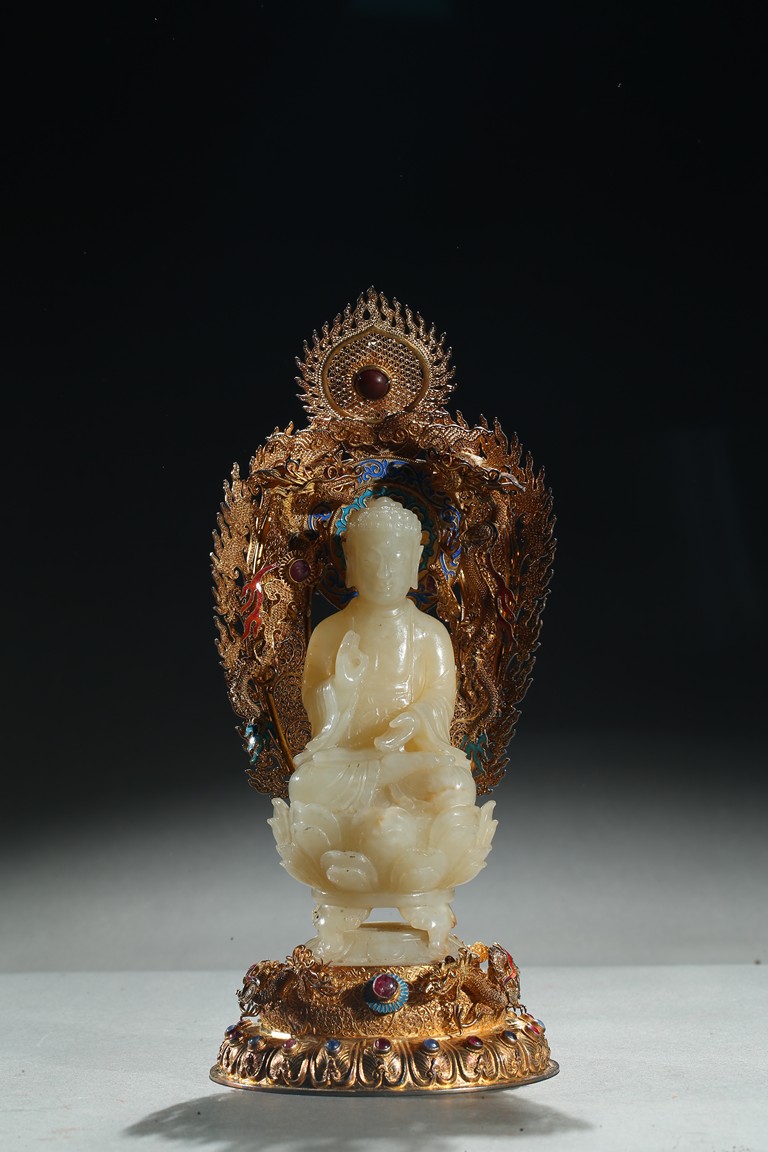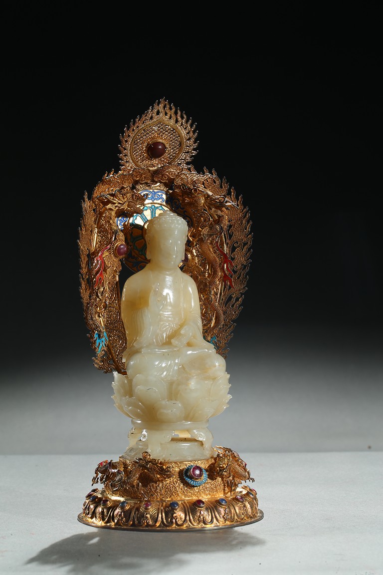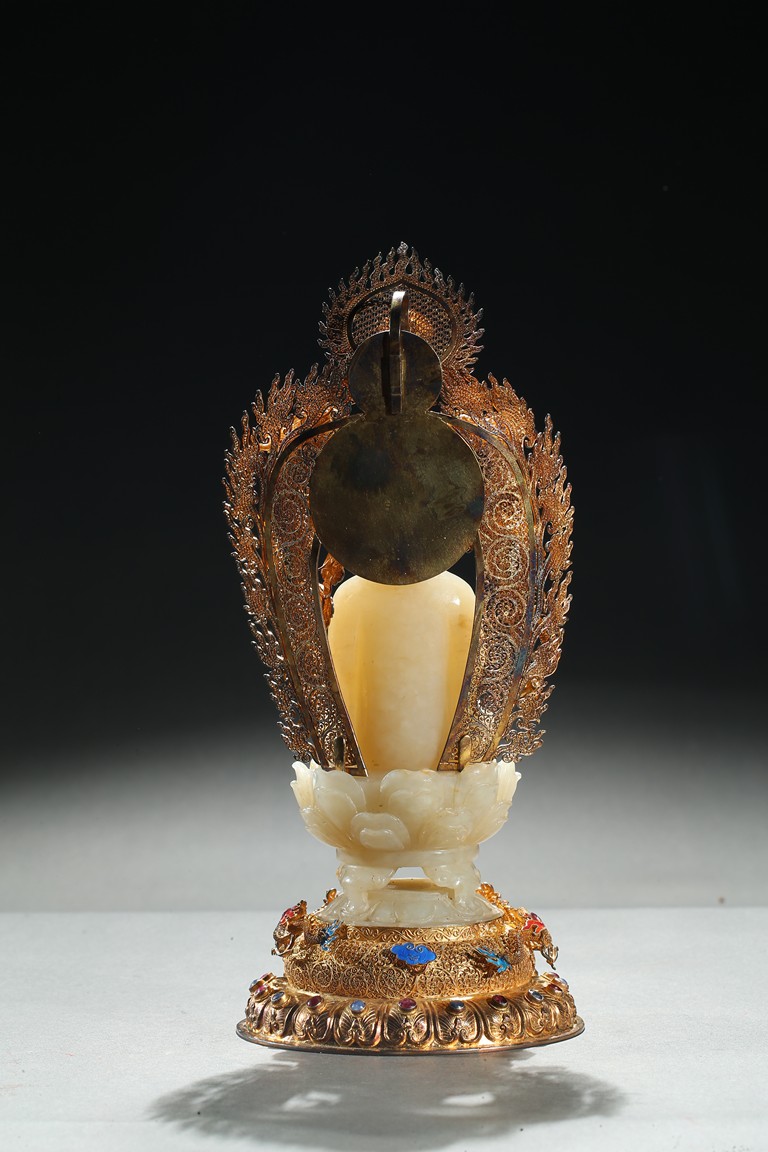 The bodhisattva is shown seated upon a lotus throne in padmasana with hands in Dharmachakra mudra, wearing dhoti tied to the chest, face with serene expression, all backed by a large and delicately worked gilt-filigree flaming mandorla inlaid with gems and flanked by dragons, inserted on a gilt-filigree 'lotus' base further decorated with two dragons chasing a gem-inlaid pearl to the center. Qing Dynasty period.
