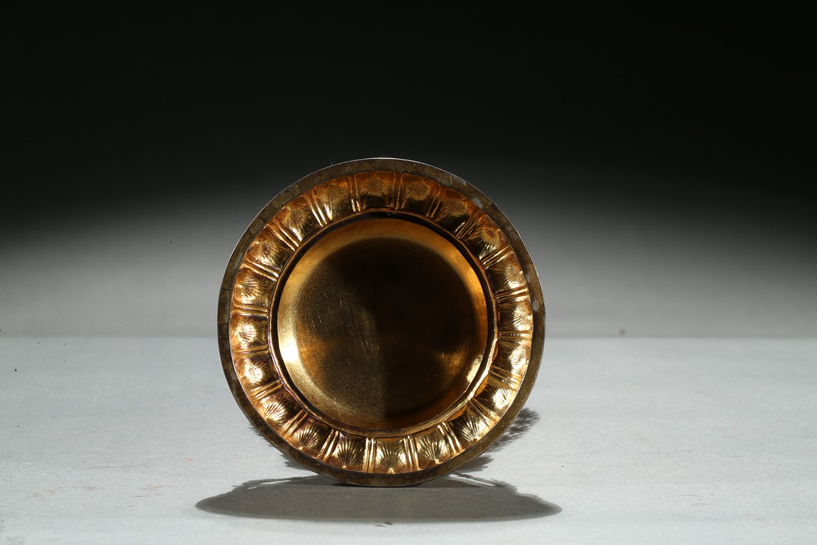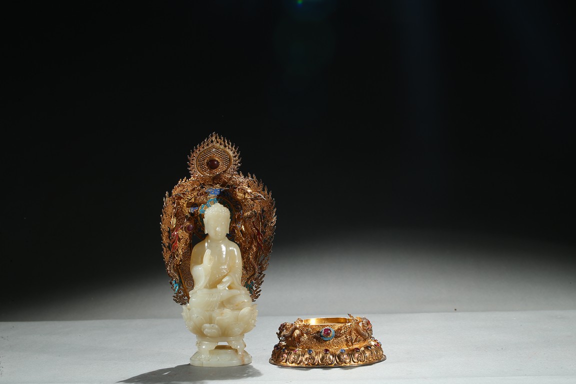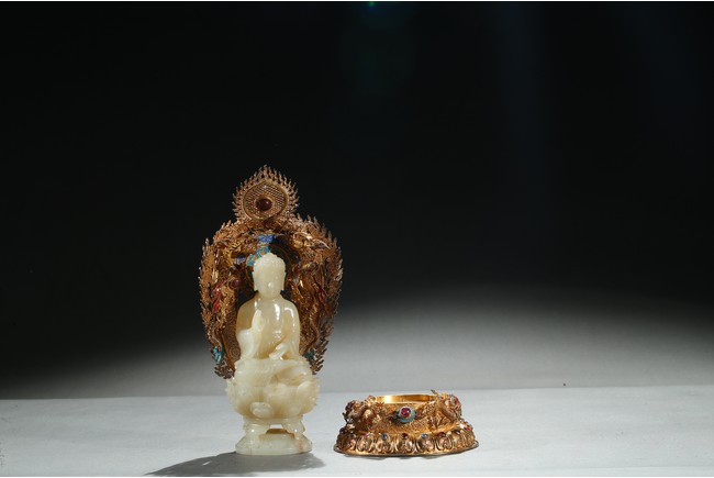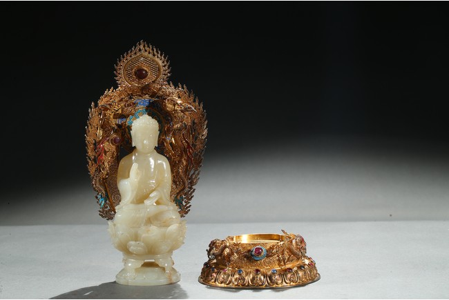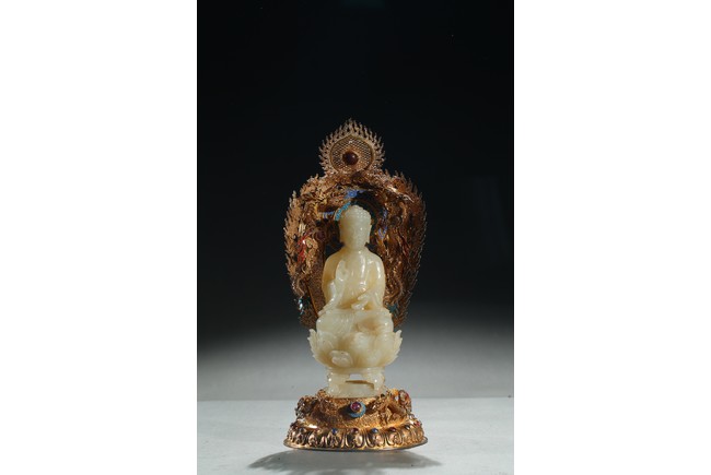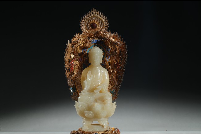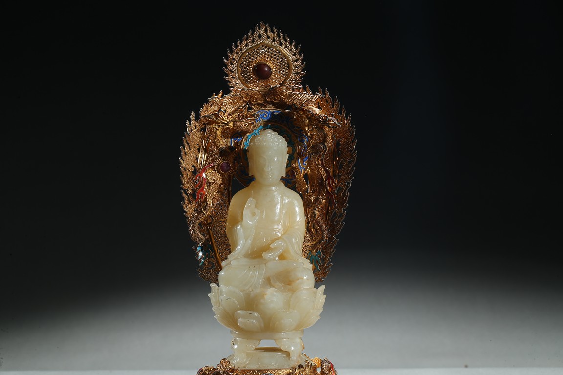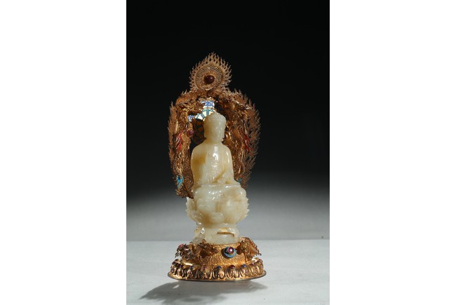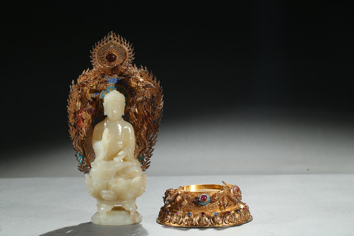 The bodhisattva is shown seated upon a lotus throne in padmasana with hands in Dharmachakra mudra, wearing dhoti tied to the chest, face with serene expression, all backed by a large and delicately worked gilt-filigree flaming mandorla inlaid with gems and flanked by dragons, inserted on a gilt-filigree 'lotus' base further decorated with two dragons chasing a gem-inlaid pearl to the center. Qing Dynasty period.