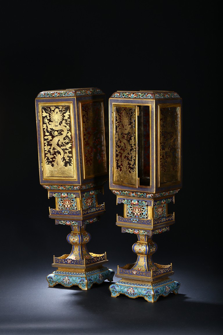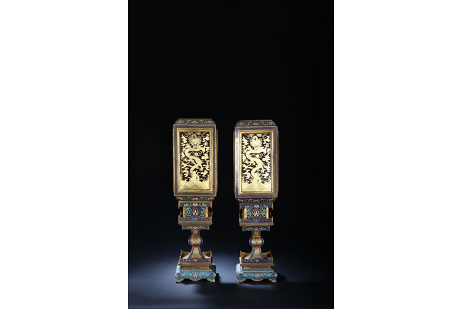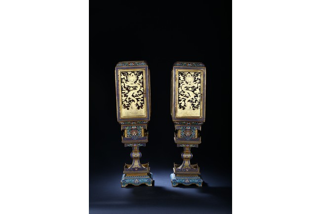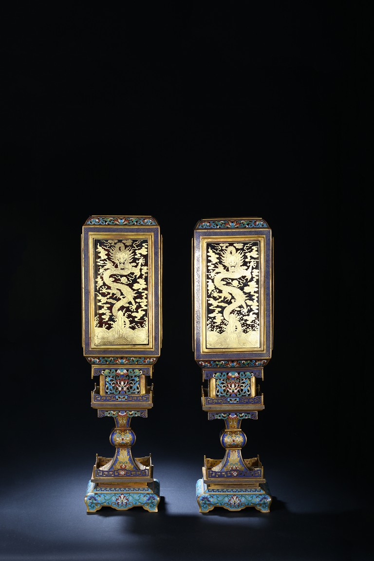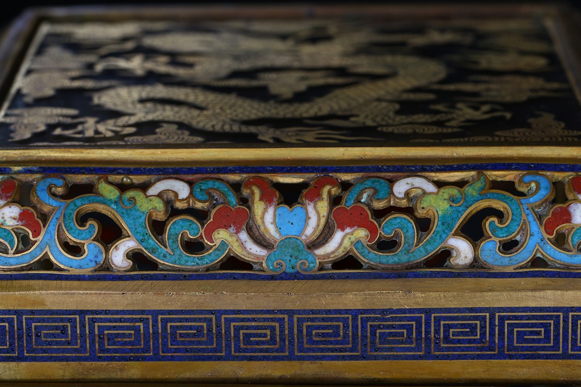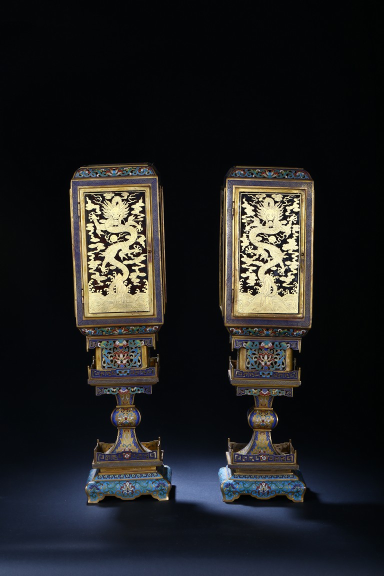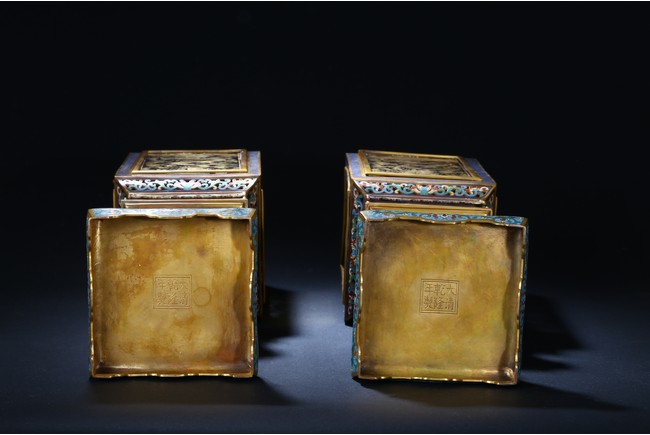 Each of the rectangular top finely painted on the glass side with ferocious dragon emerging from sacred mountain and ocean wave, all supported on cloisonne enamel gilt-bronze gu-form stand. The base with four character QIANLONG mark.