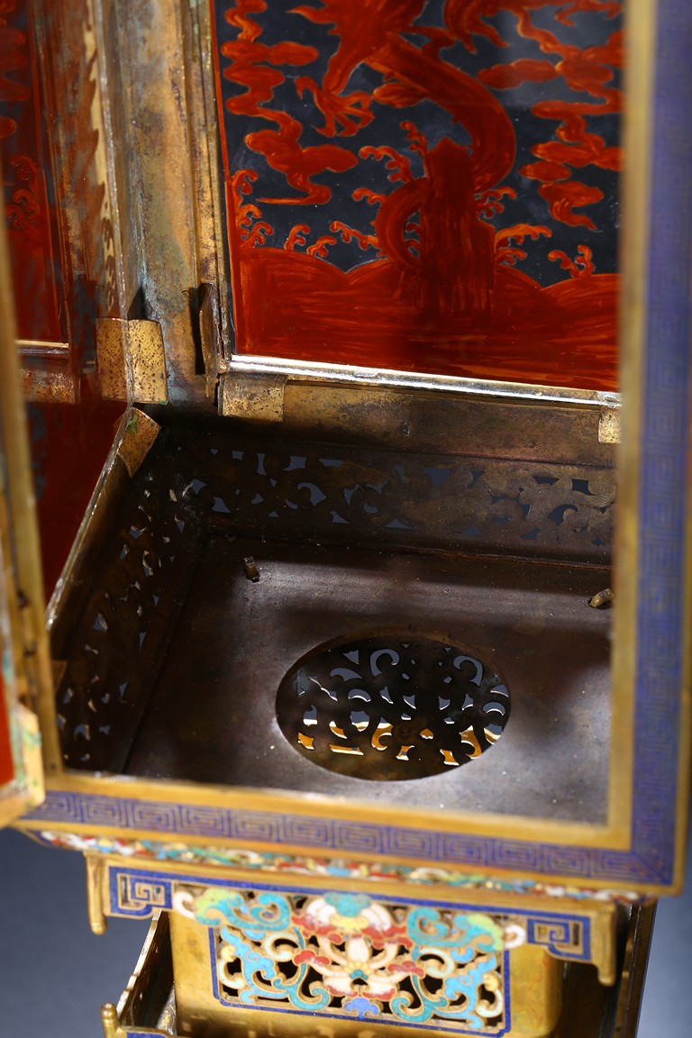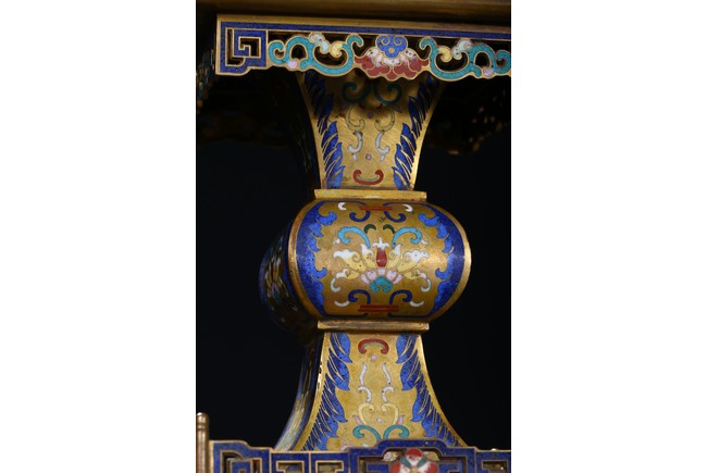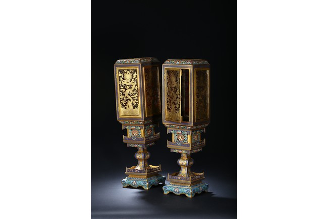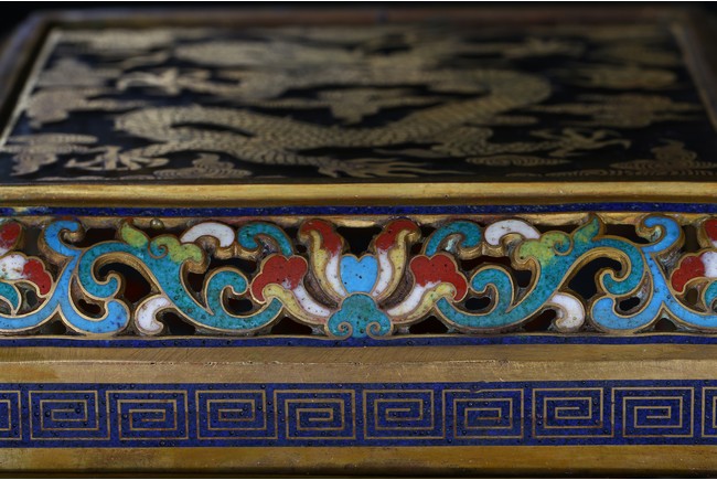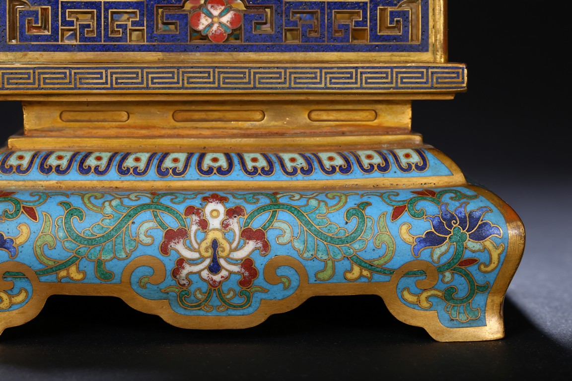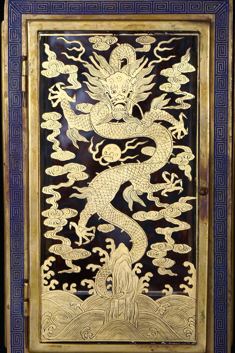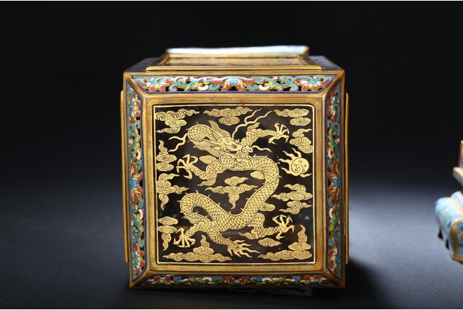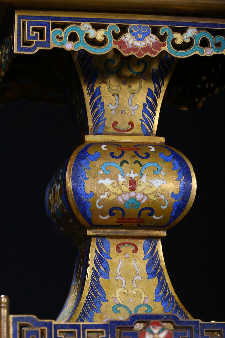 Each of the rectangular top finely painted on the glass side with ferocious dragon emerging from sacred mountain and ocean wave, all supported on cloisonne enamel gilt-bronze gu-form stand. The base with four character QIANLONG mark.