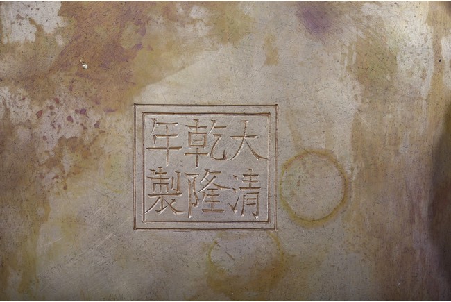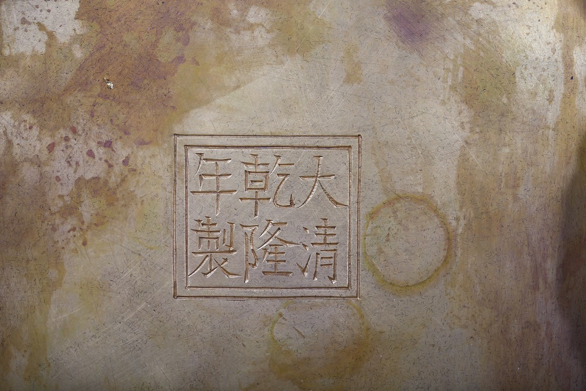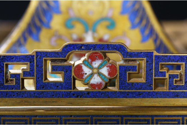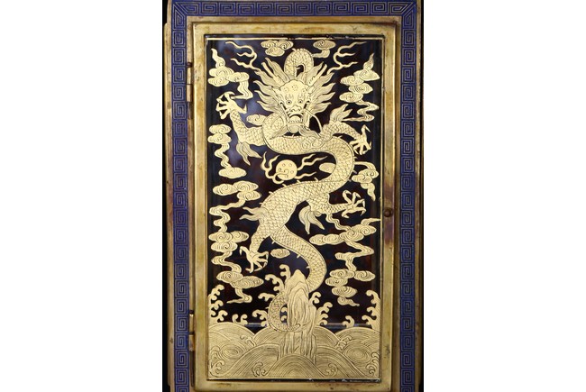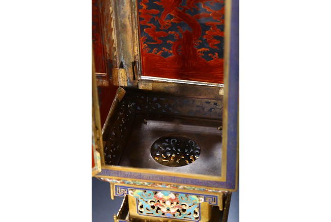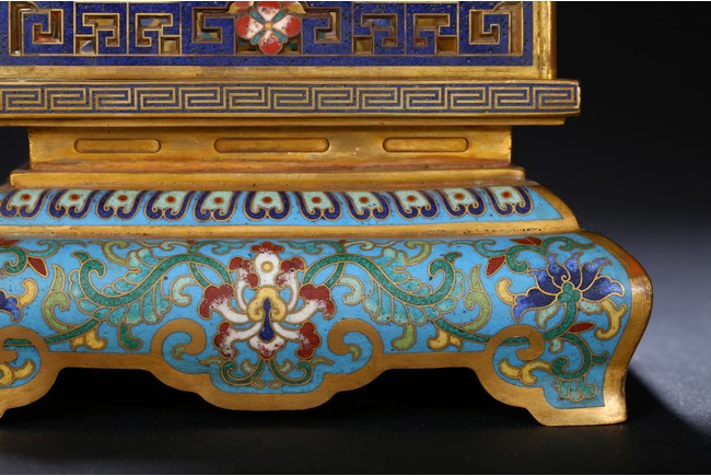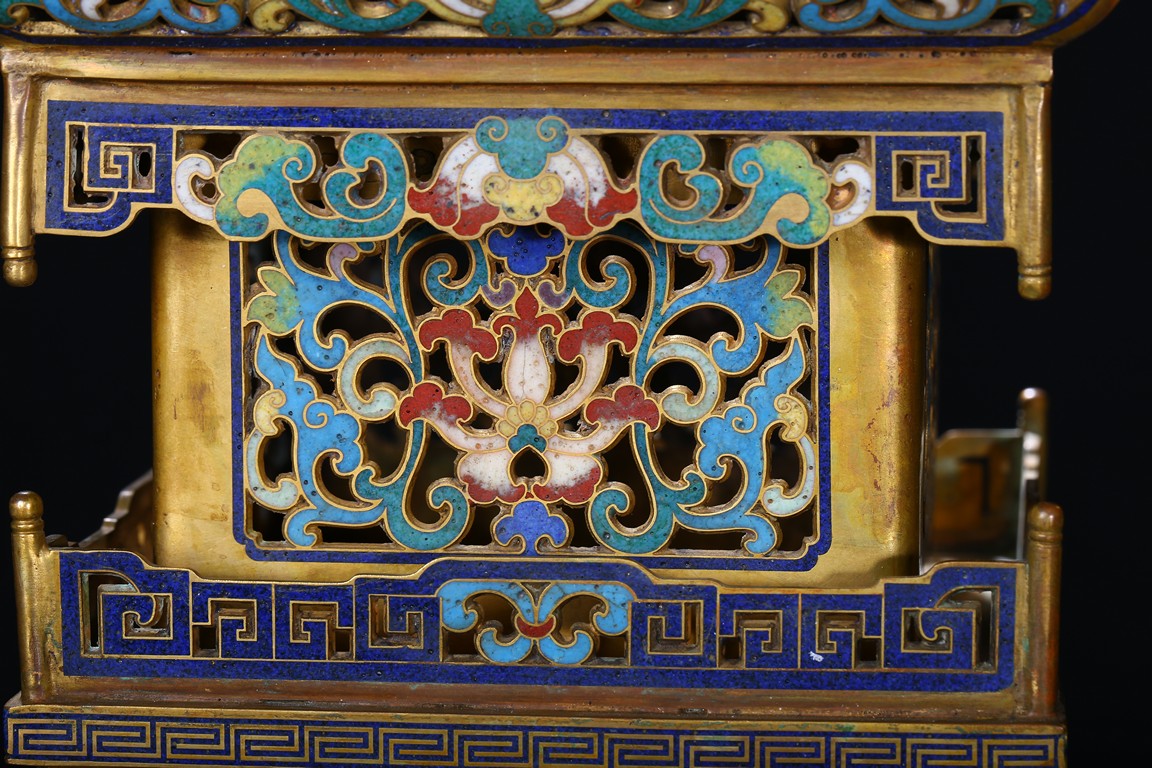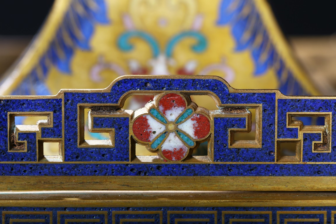 Each of the rectangular top finely painted on the glass side with ferocious dragon emerging from sacred mountain and ocean wave, all supported on cloisonne enamel gilt-bronze gu-form stand. The base with four character QIANLONG mark.