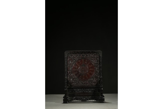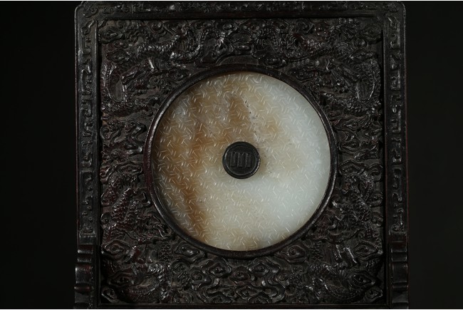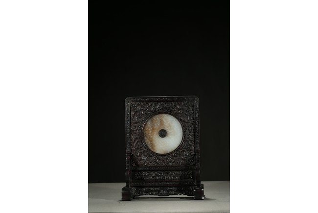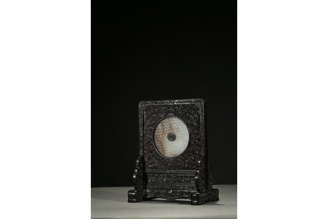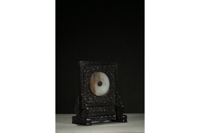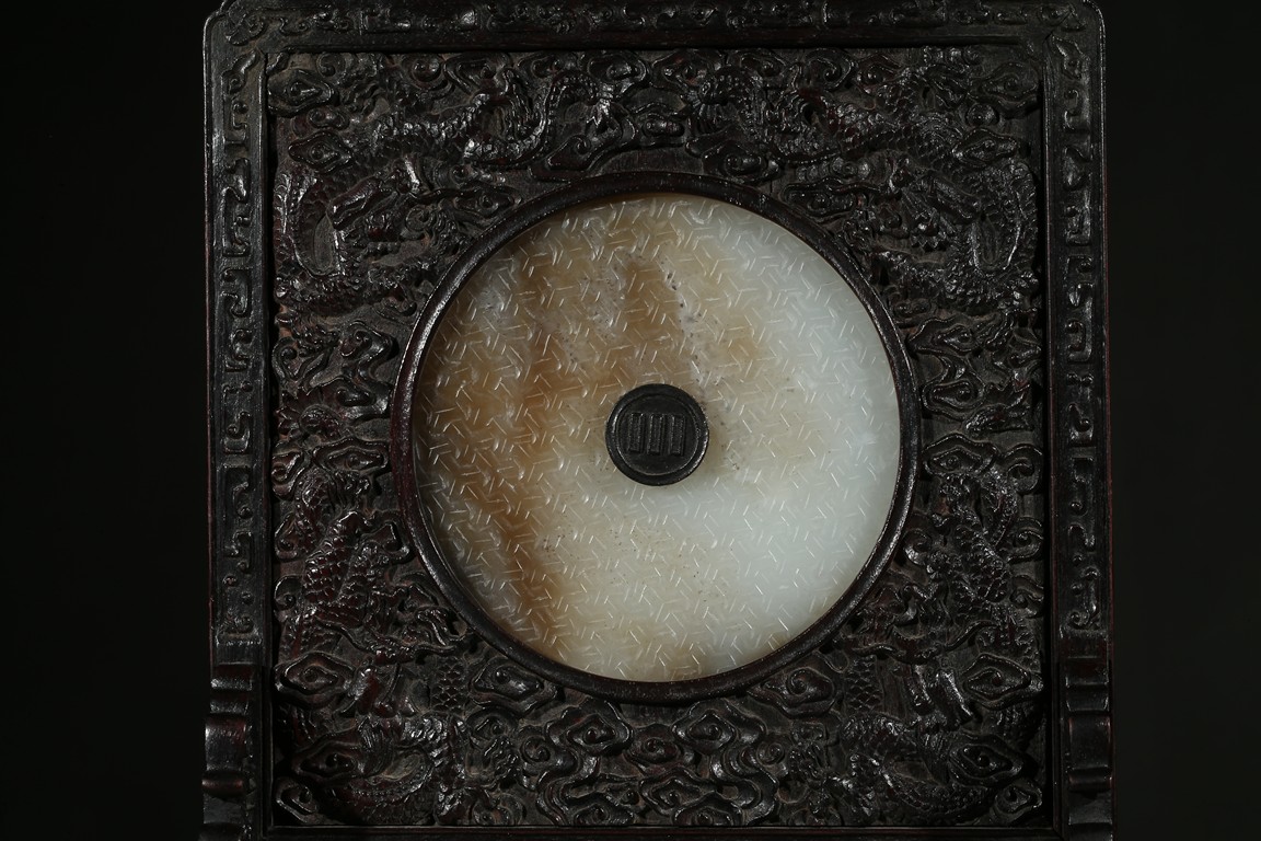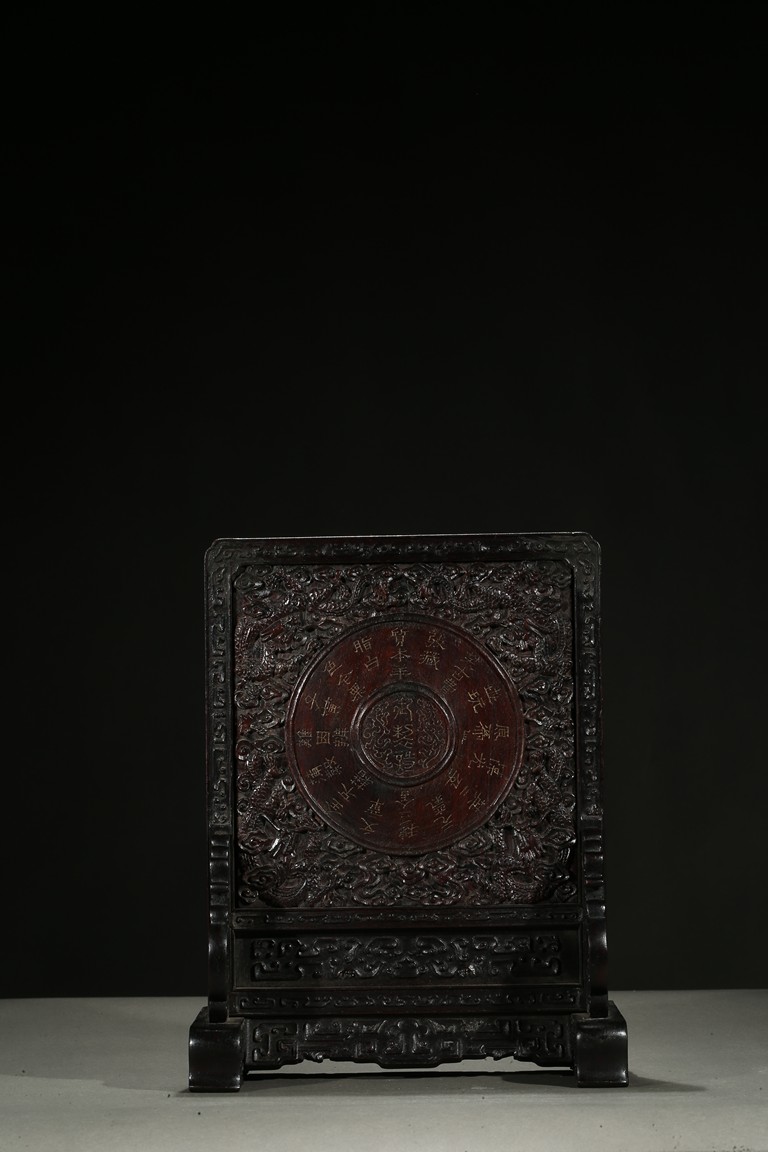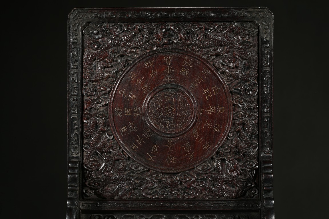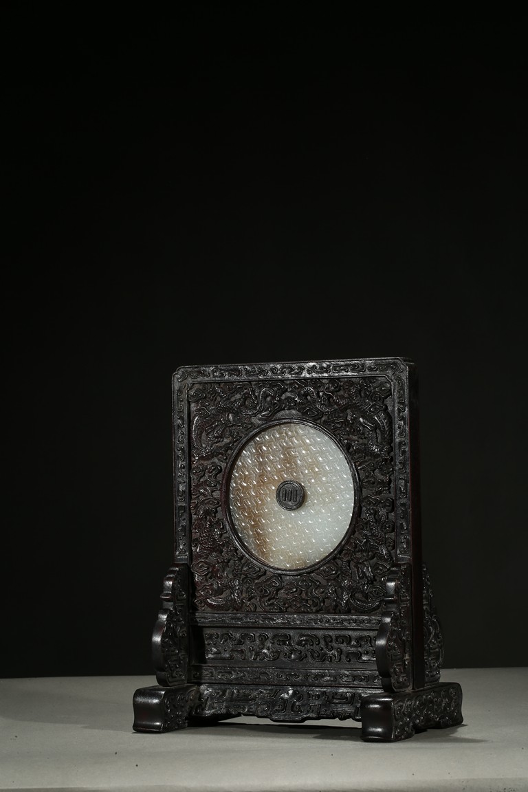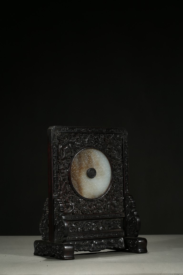 With a white jade disc bi with geometric pattern mounted to the center, the zitan screen panel with carved dragons emerging from clouds, the reverse around the circular panel carved in gold in regular script inscription.