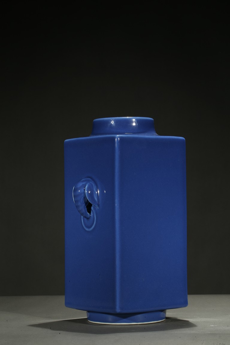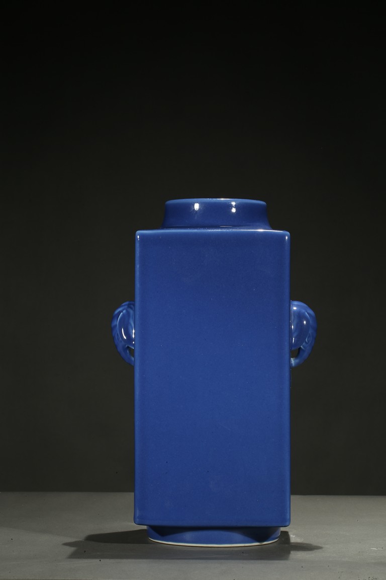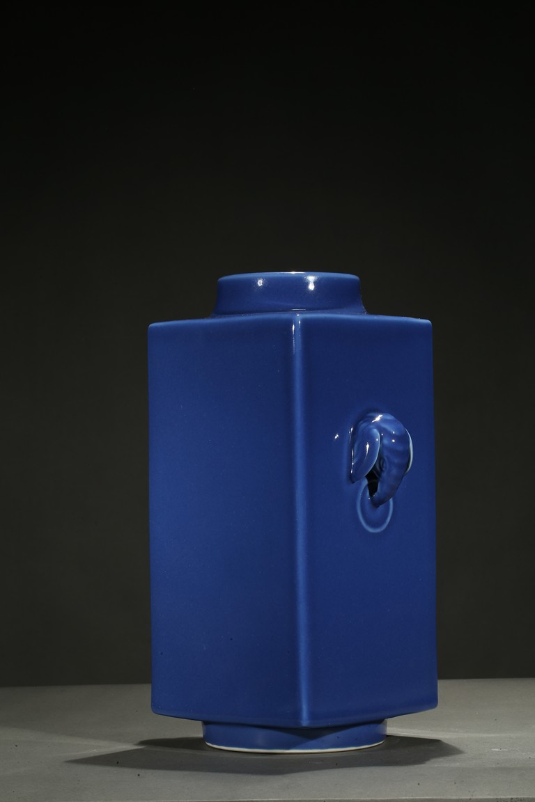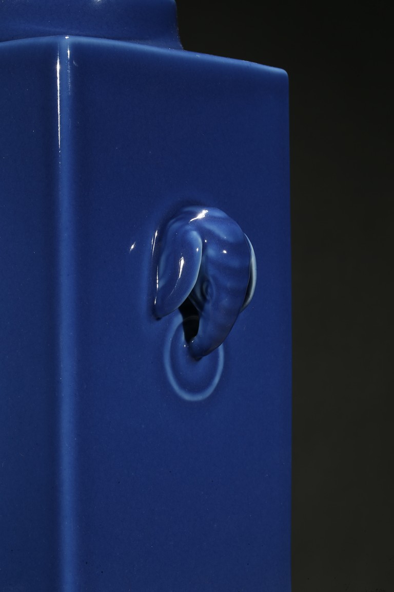 Of archaistic cong form, the body with twin fixed-ring elephant head handles, covered to the square sectioned form with a thick deep blue glaze thinning to the edges, base inscribed with six character GUANGXU mark. Qing Dynasty period.