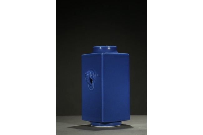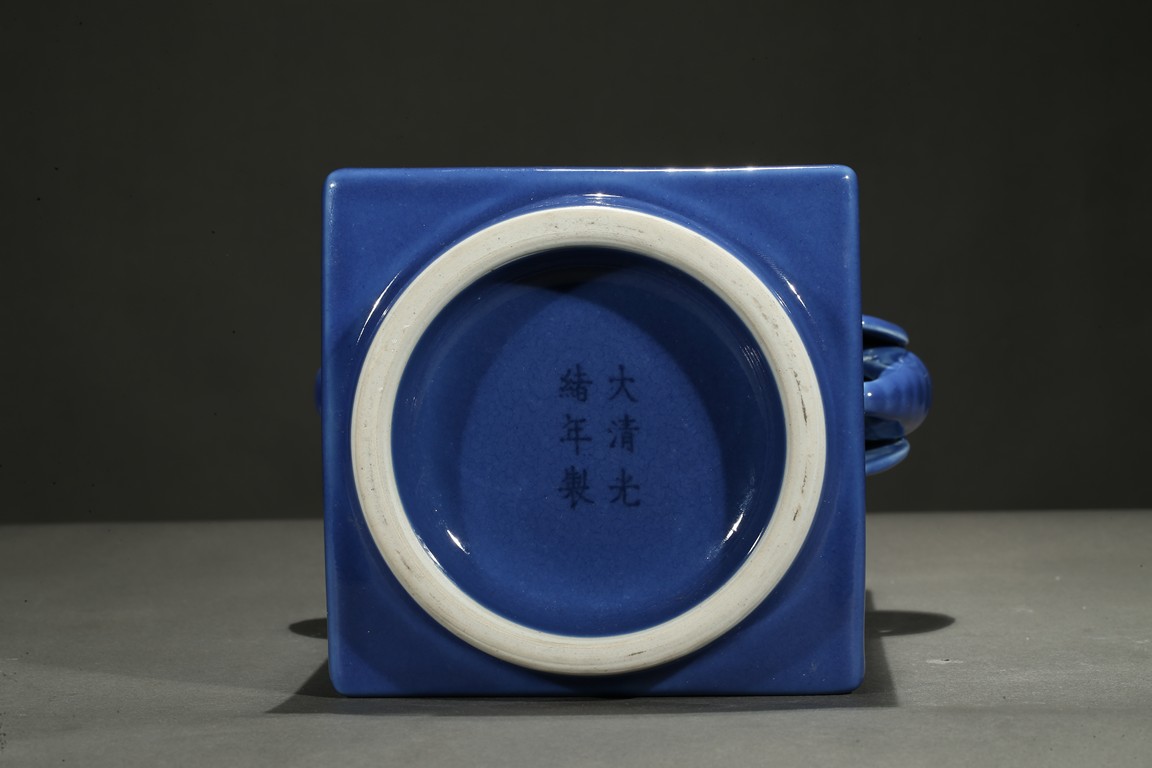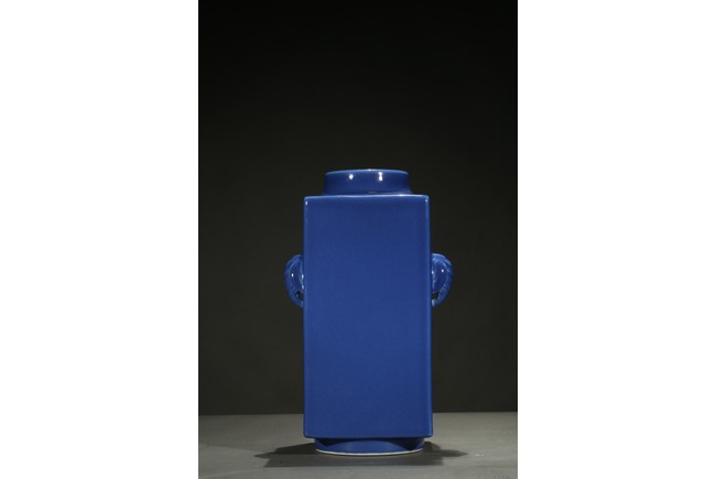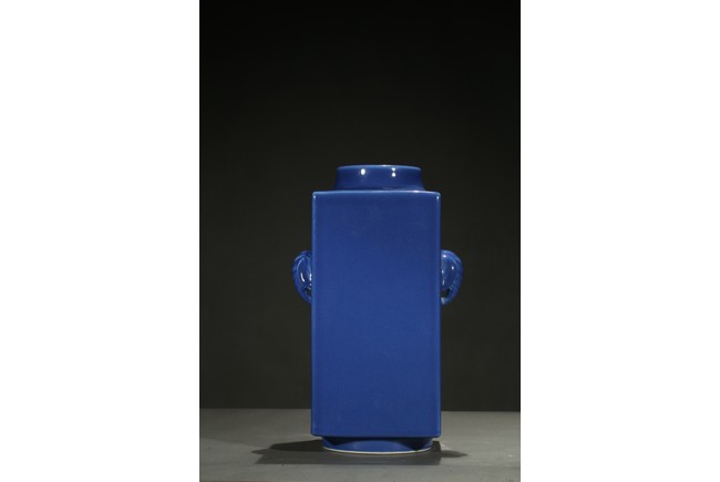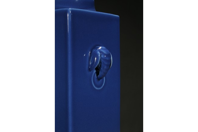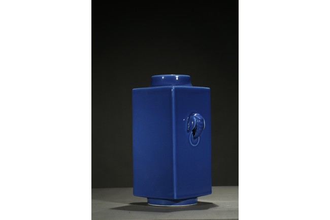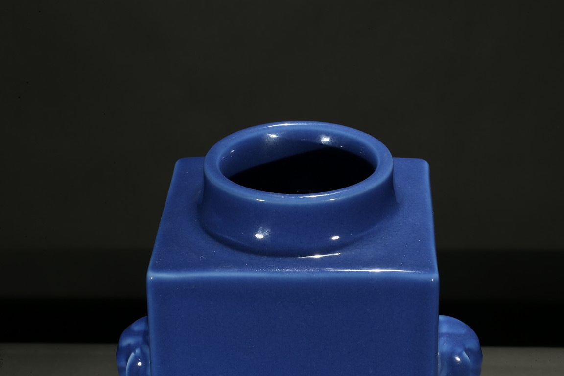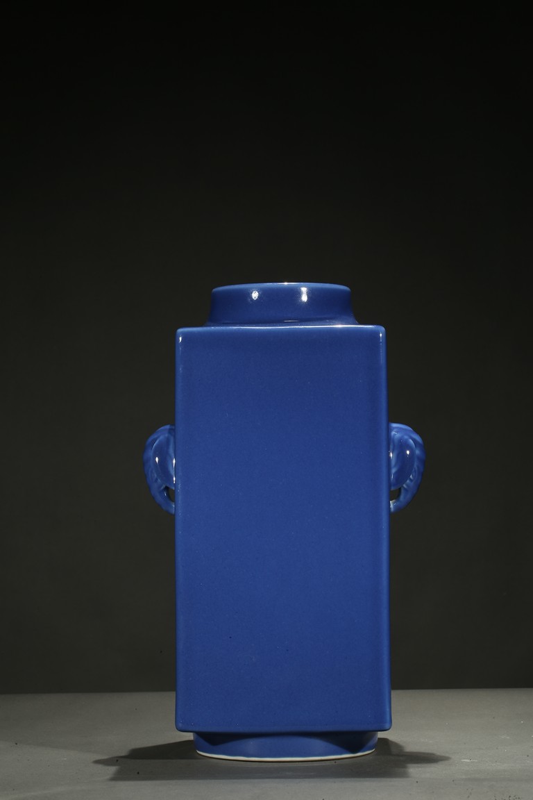 Of archaistic cong form, the body with twin fixed-ring elephant head handles, covered to the square sectioned form with a thick deep blue glaze thinning to the edges, base inscribed with six character GUANGXU mark. Qing Dynasty period.