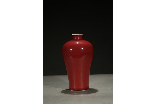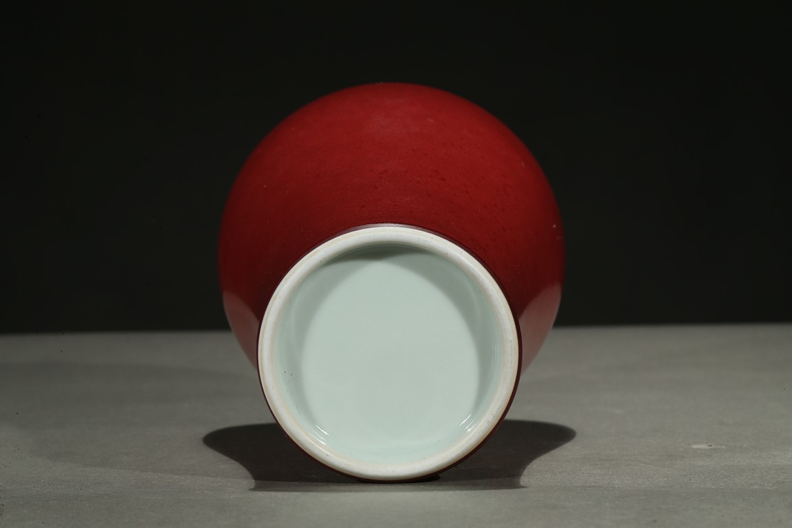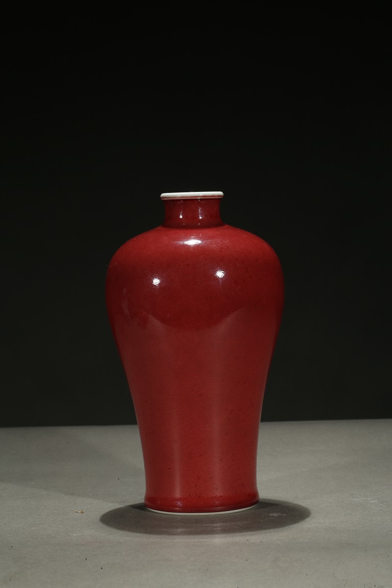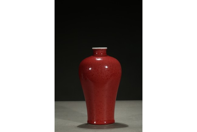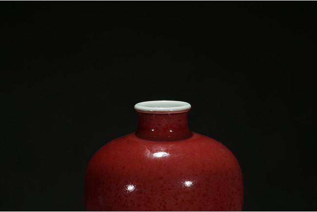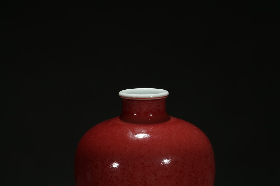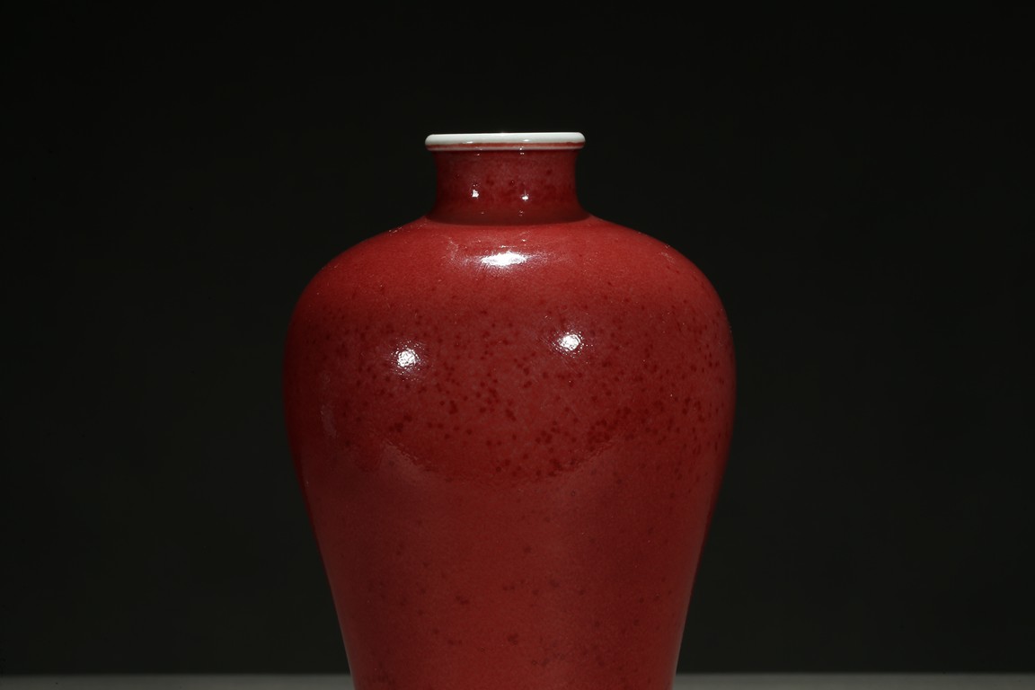 Well potted with broad rounded shoulders rising to a waisted neck and a lipped mouth, the exterior applied overall with a beautiful mottled glaze of peachbloom red color, the base left white. Qing Dynasty period.