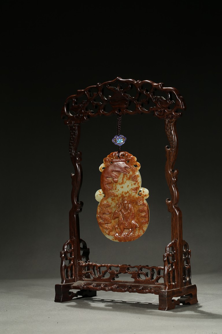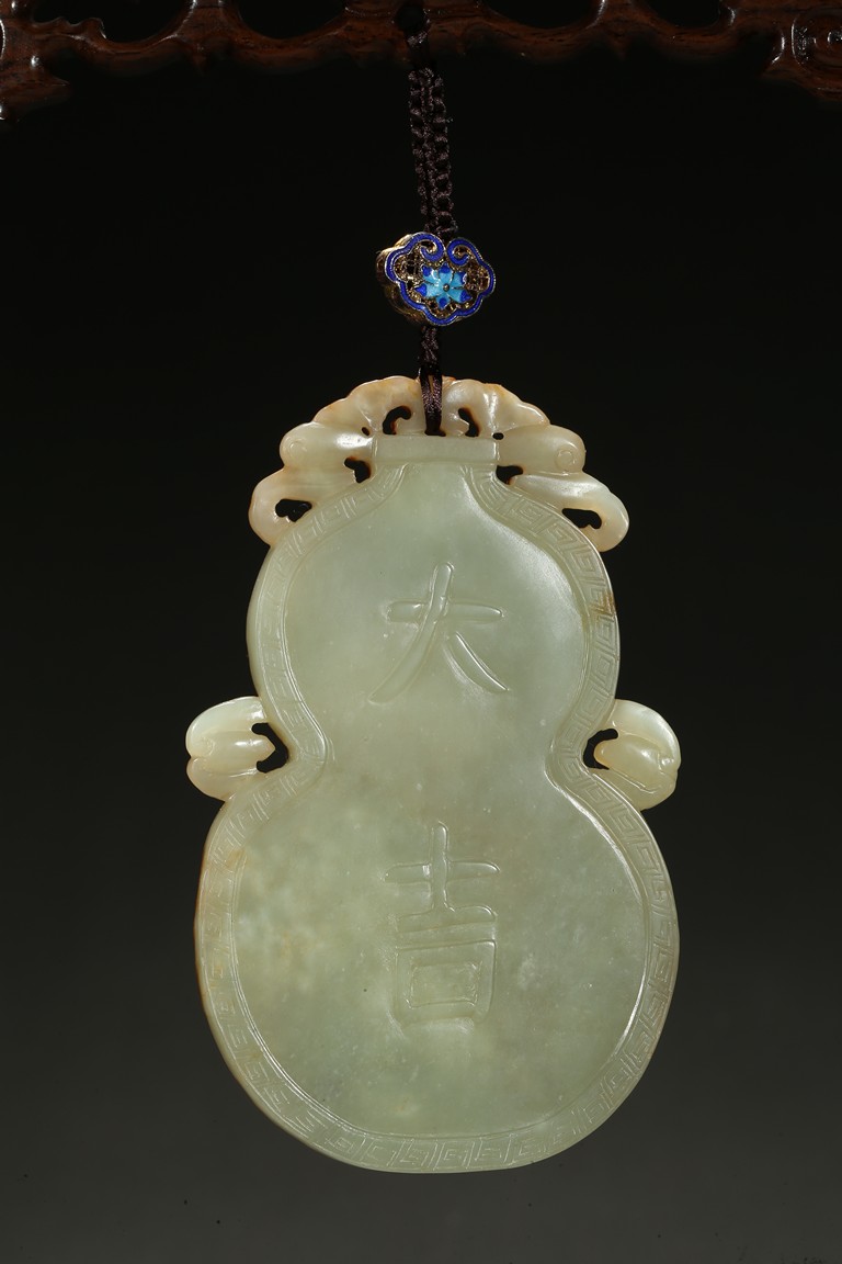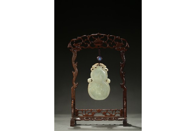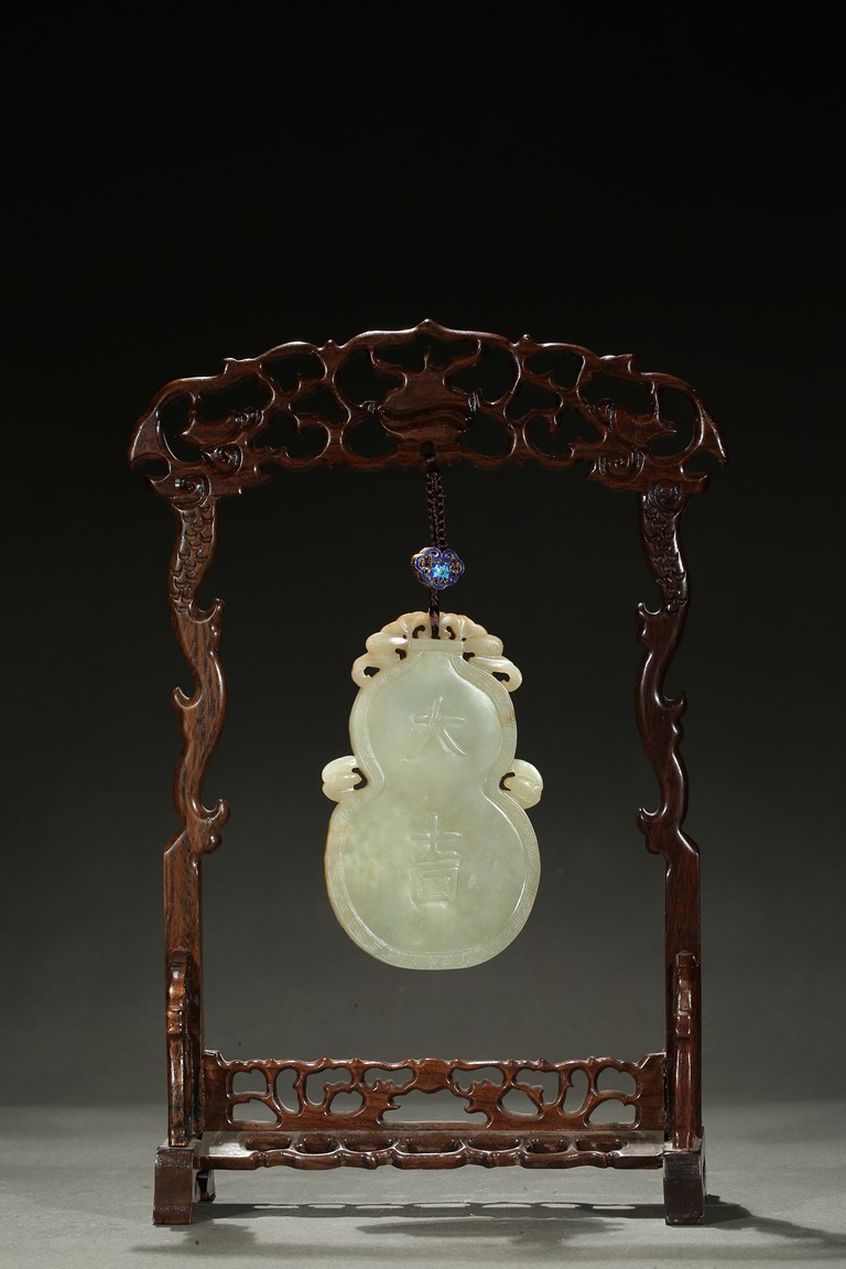 Of double gourd shape, the jade pendant carved with two characters Da Ji, flanked by two bats, hanging on a reticulated rosewood frame with dragon design.