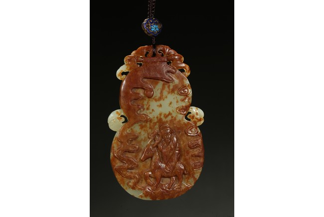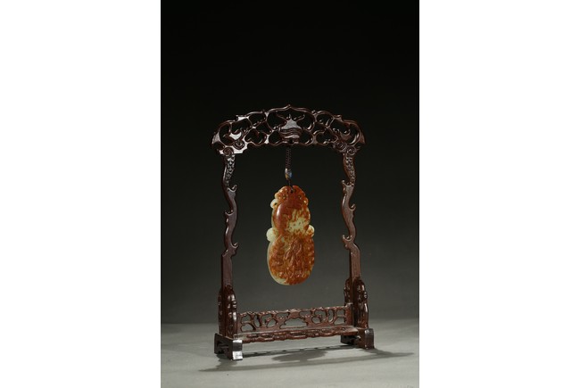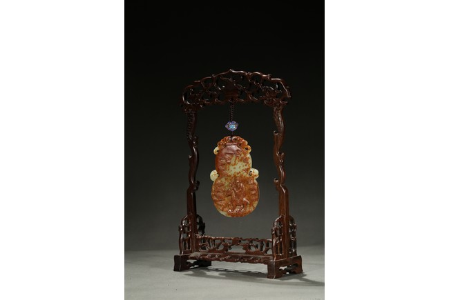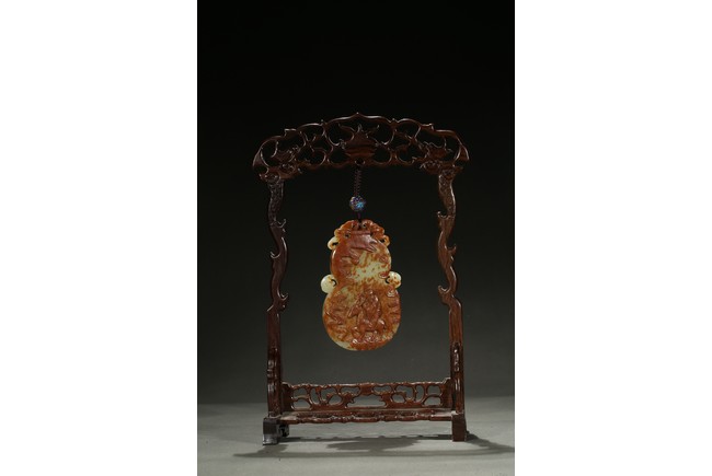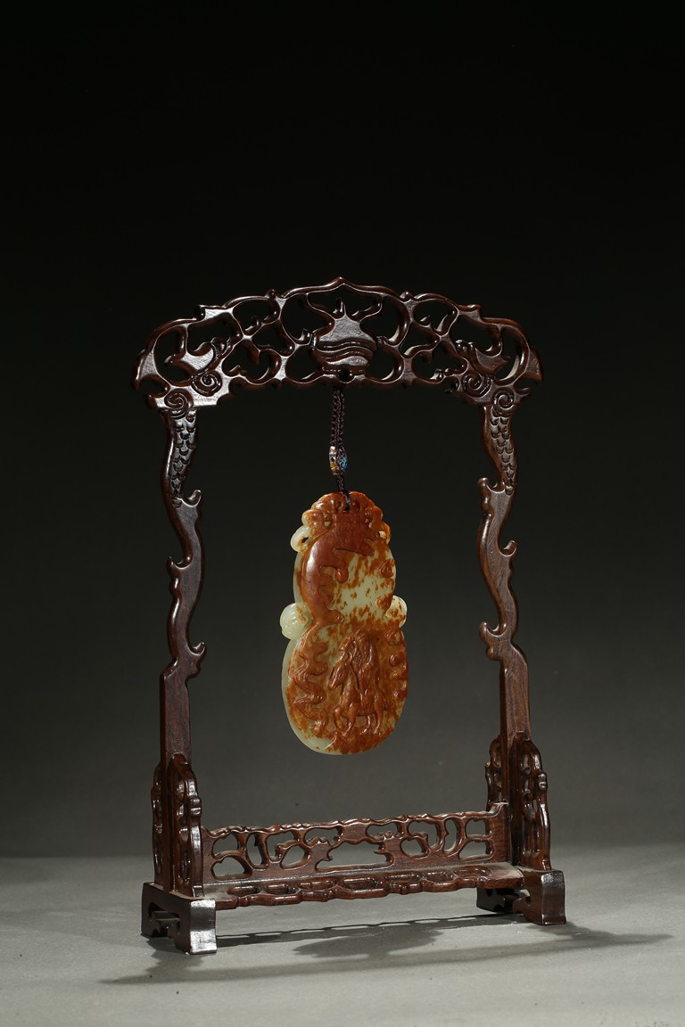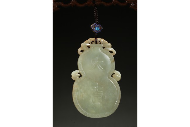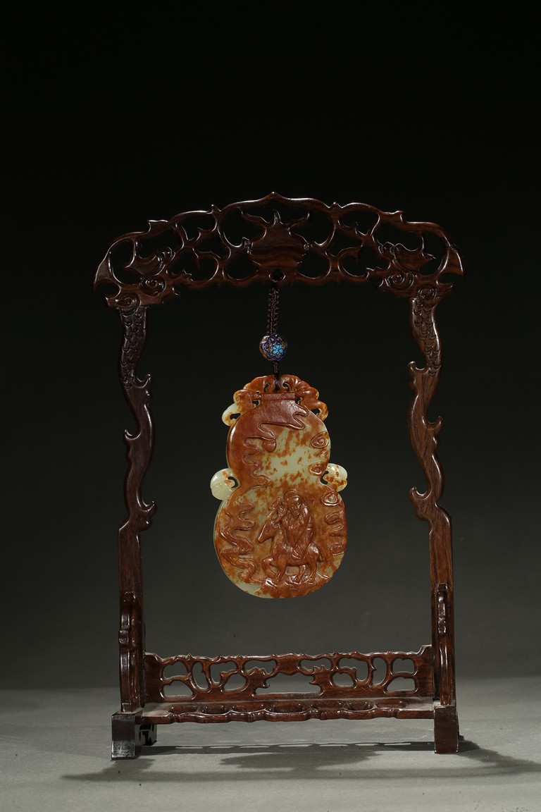 Of double gourd shape, the jade pendant carved with two characters Da Ji, flanked by two bats, hanging on a reticulated rosewood frame with dragon design.