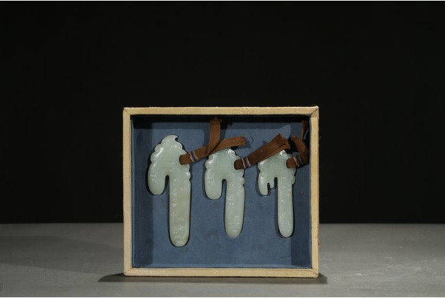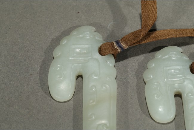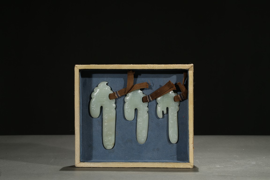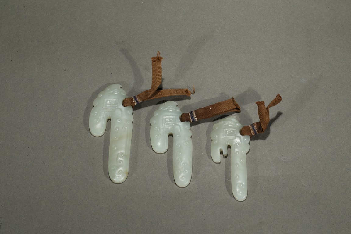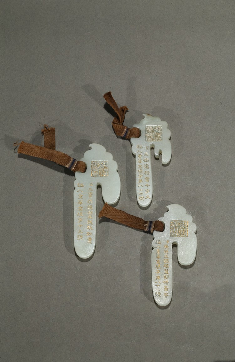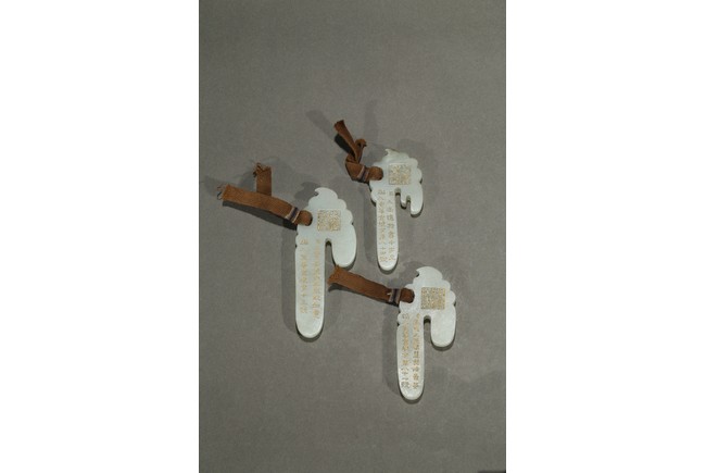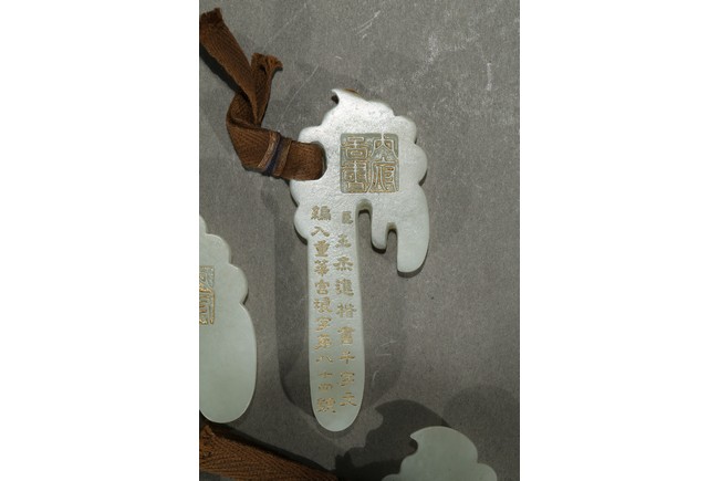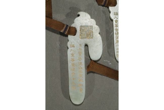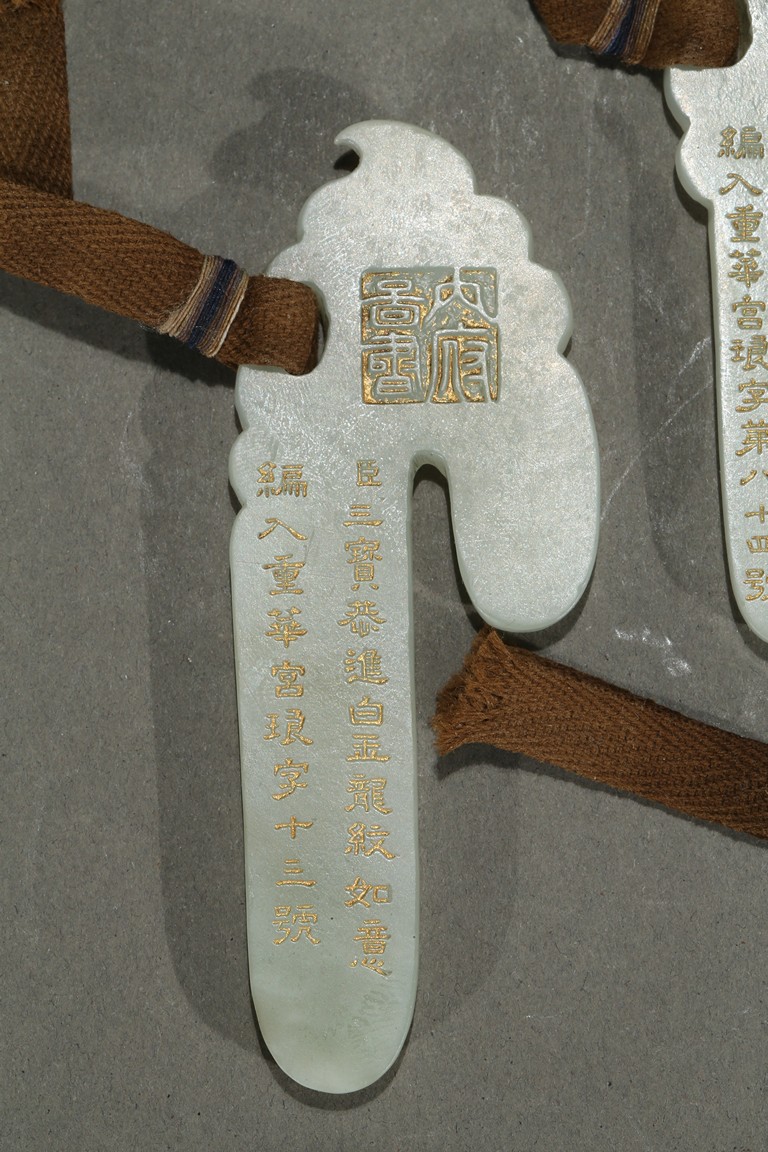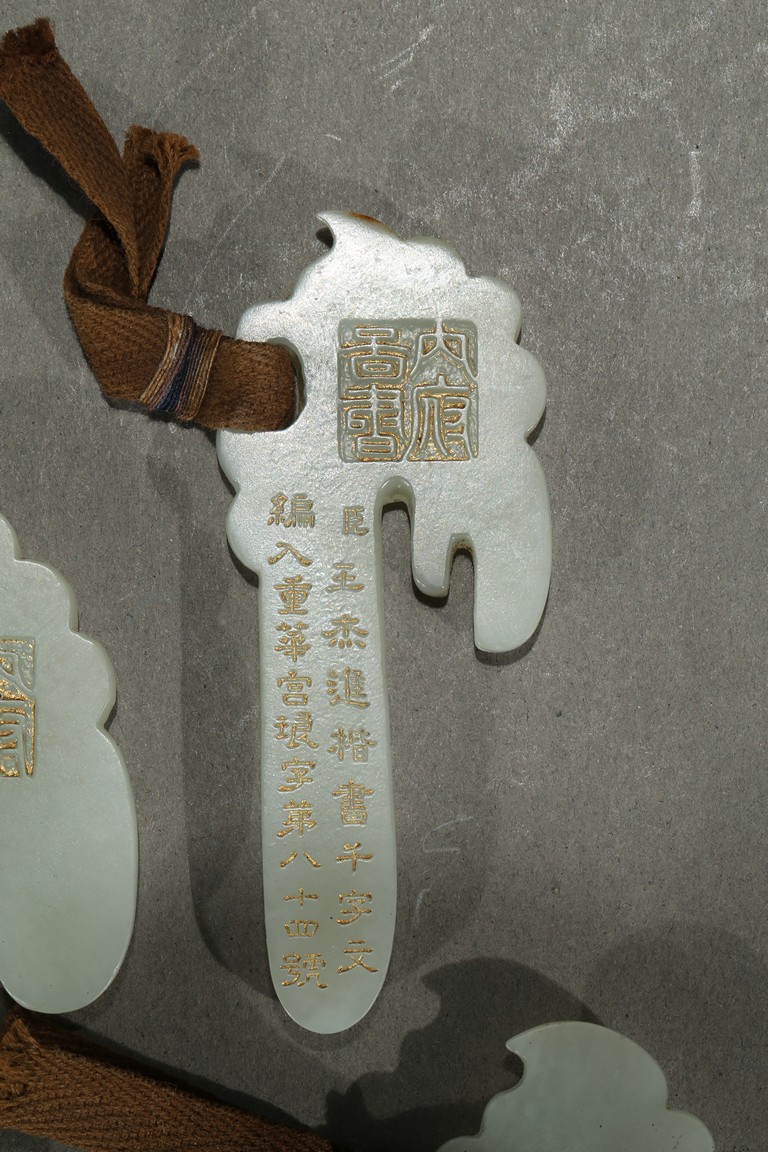 Each of the clasps with one side carved in low relief with an archaistic bird's head above scroll pattern on the longer tab, the shorter tab undecorated and carved with a narrow slit. The reverse carved with inscription dedicated to the Imperial palace with gilding. The translucent stone is of white tone and finely polished.