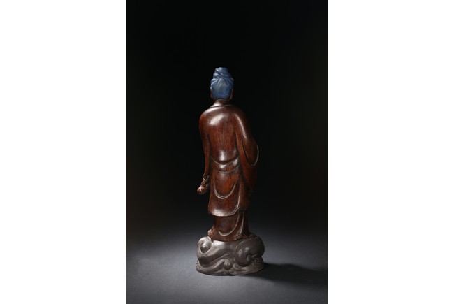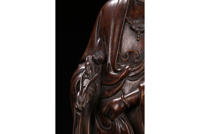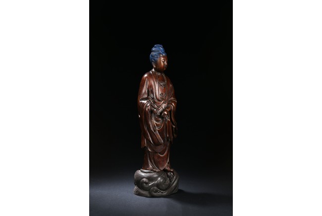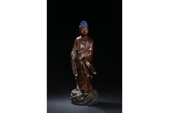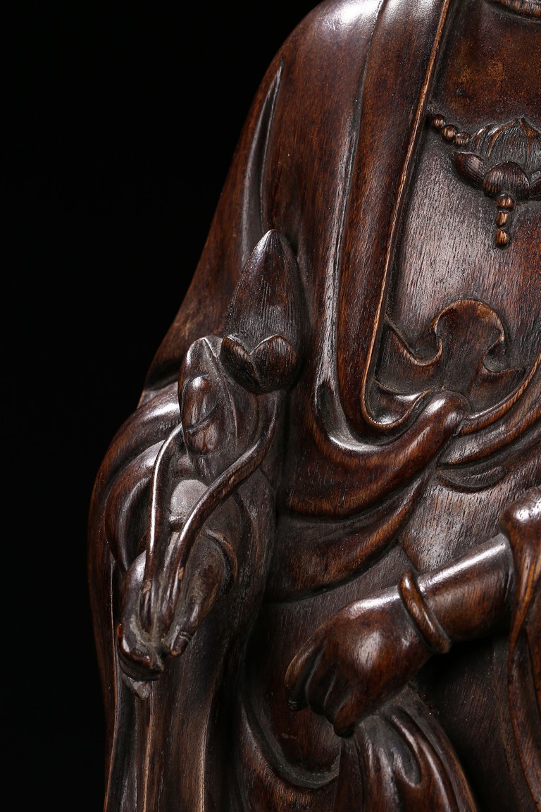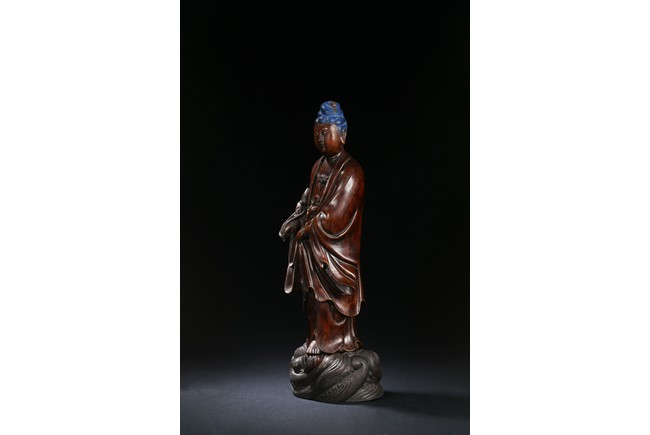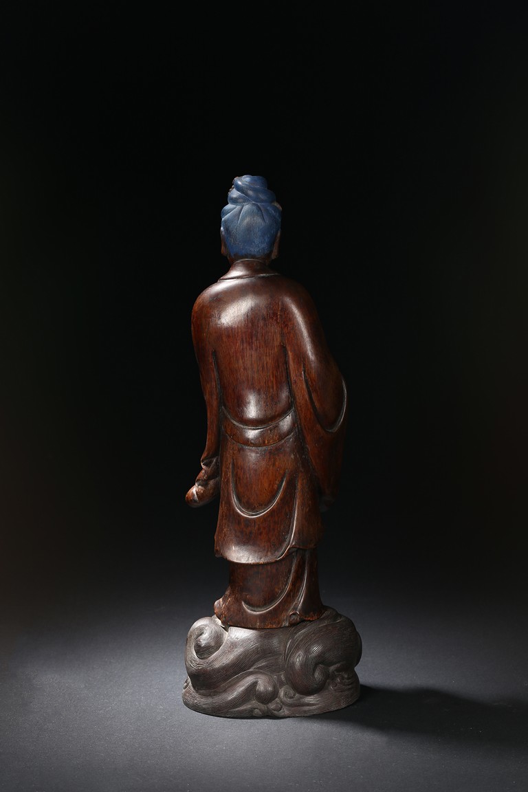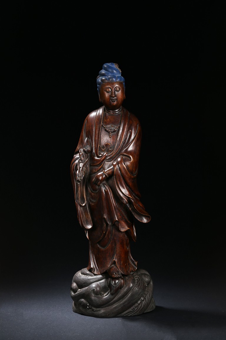 The Guanyin is shown standing upon a rosewood carved 'ocean wave' stand, one hand holding two lotus branches, wearing voluminous robes falling in elegant folds and a necklace, the head turned slightly to the left with a peaceful gaze. Republic period.