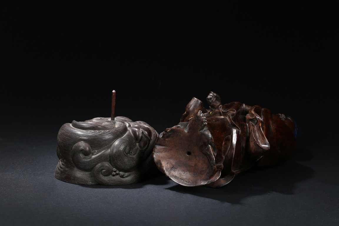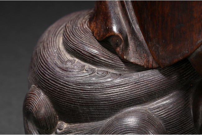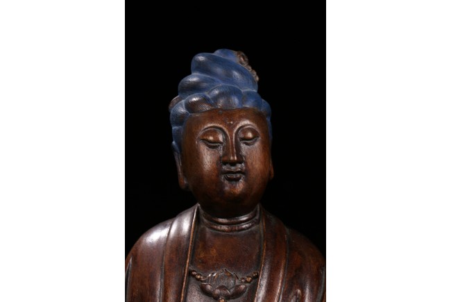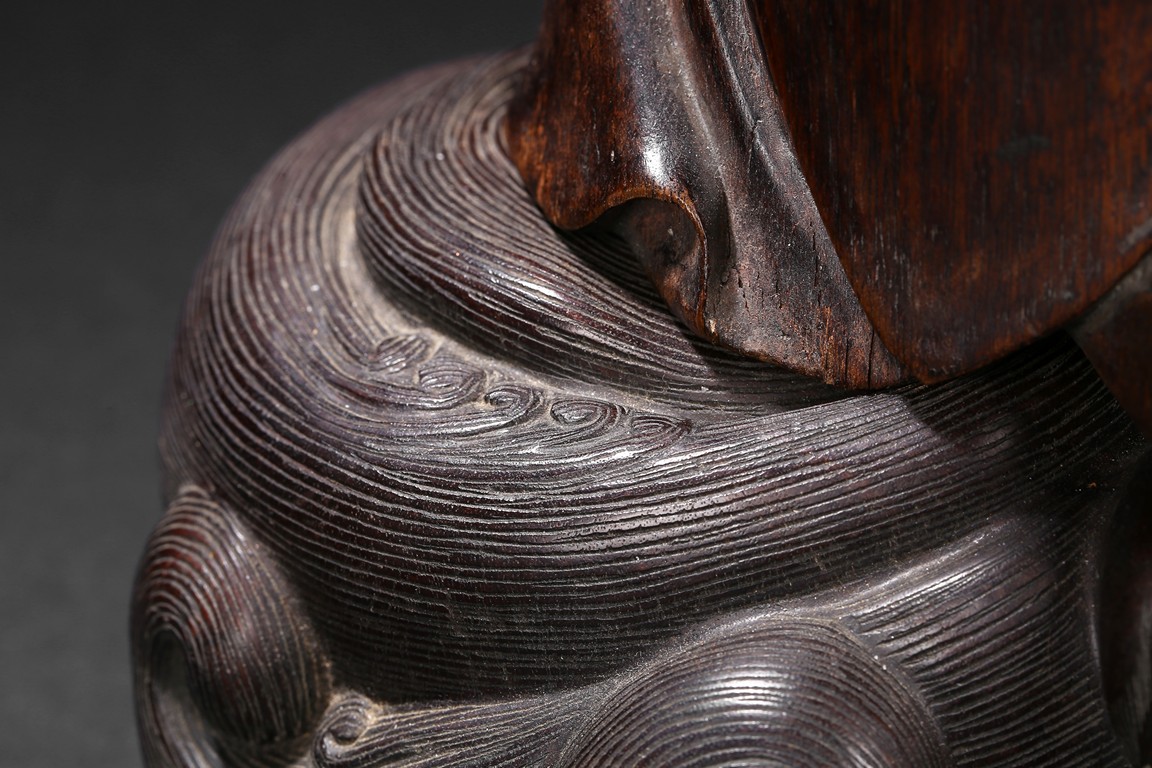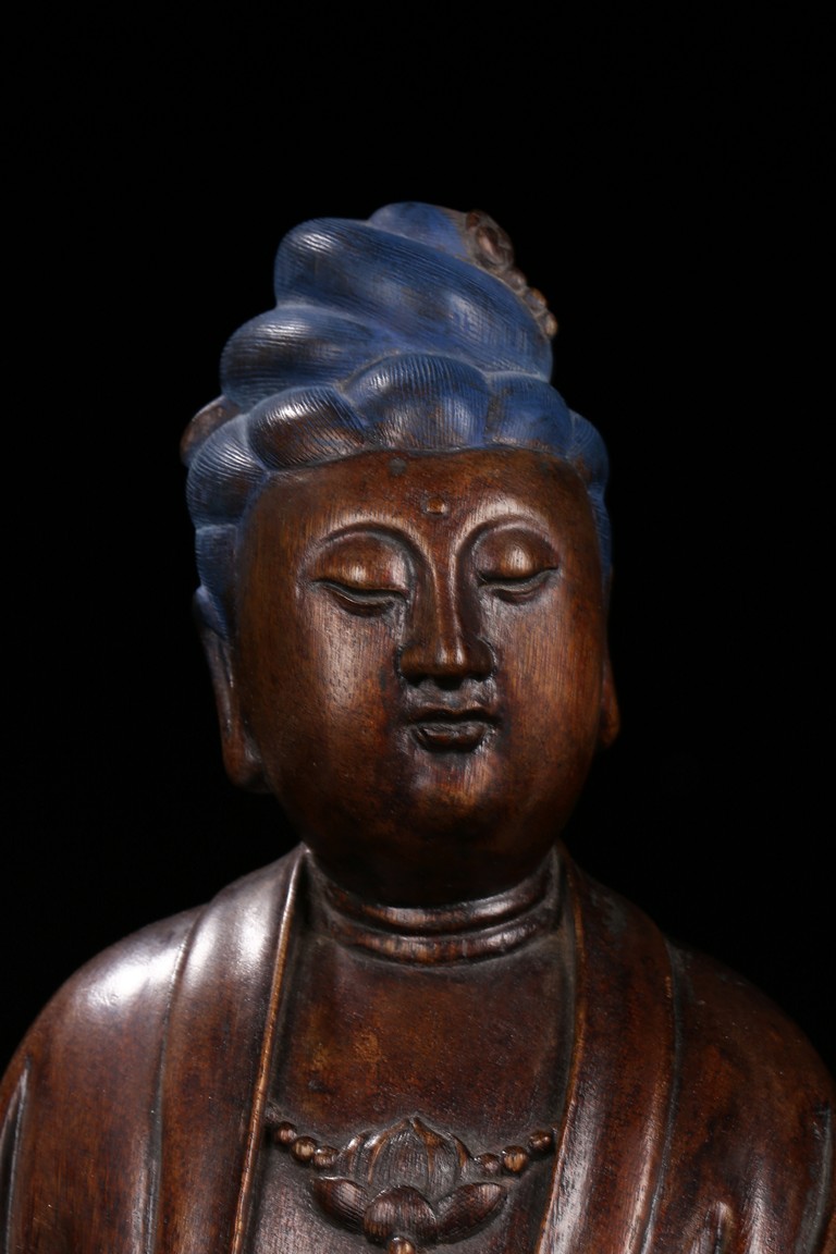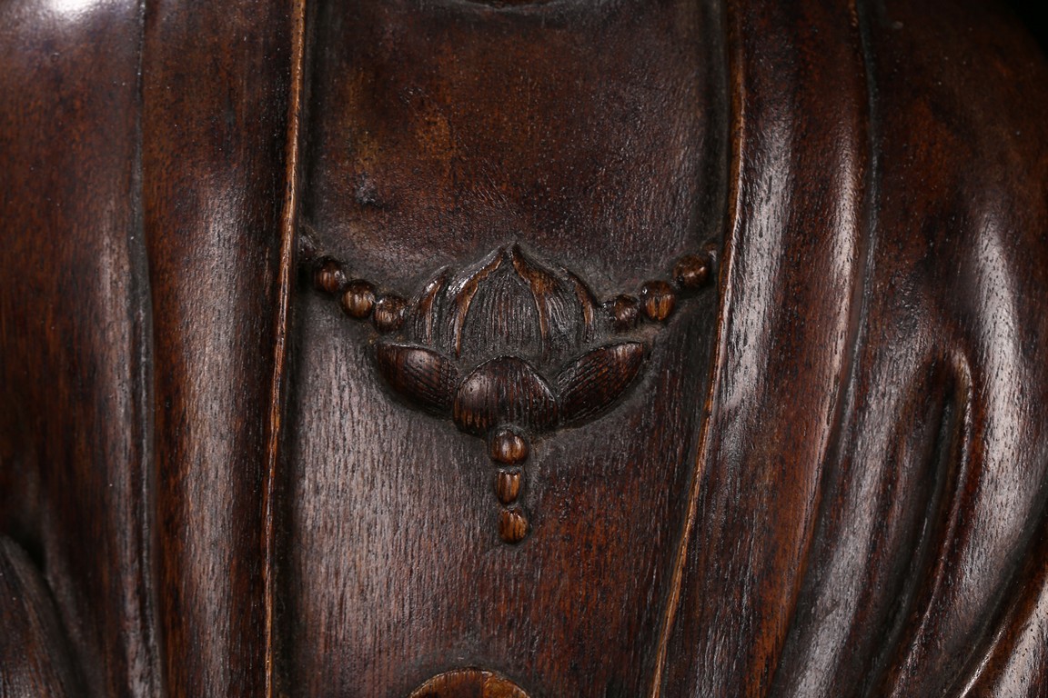 The Guanyin is shown standing upon a rosewood carved 'ocean wave' stand, one hand holding two lotus branches, wearing voluminous robes falling in elegant folds and a necklace, the head turned slightly to the left with a peaceful gaze. Republic period.