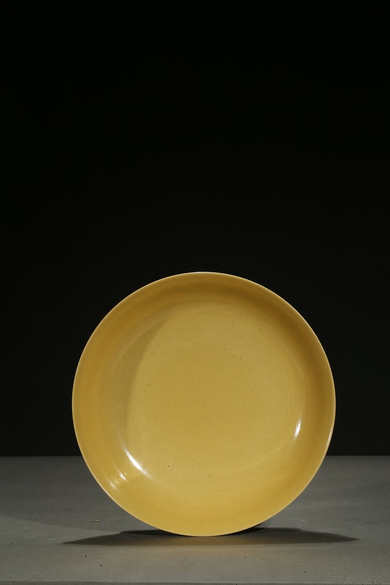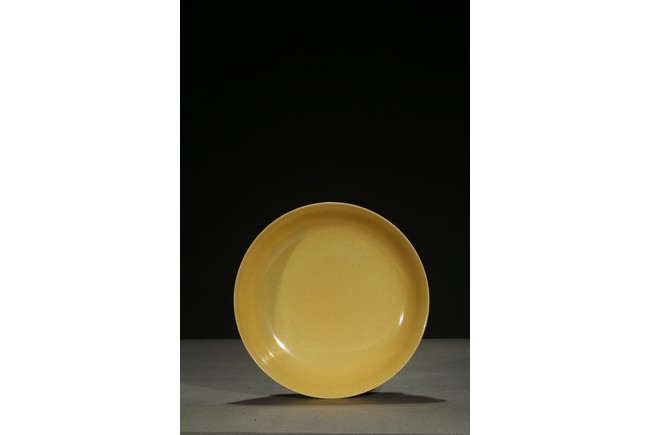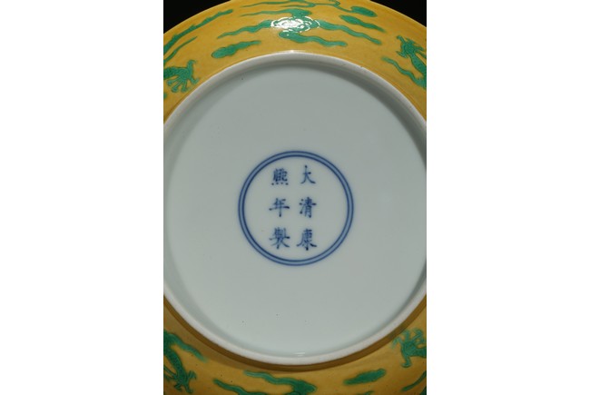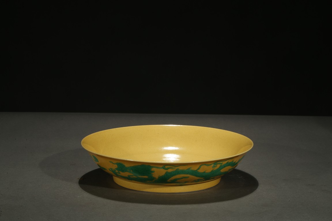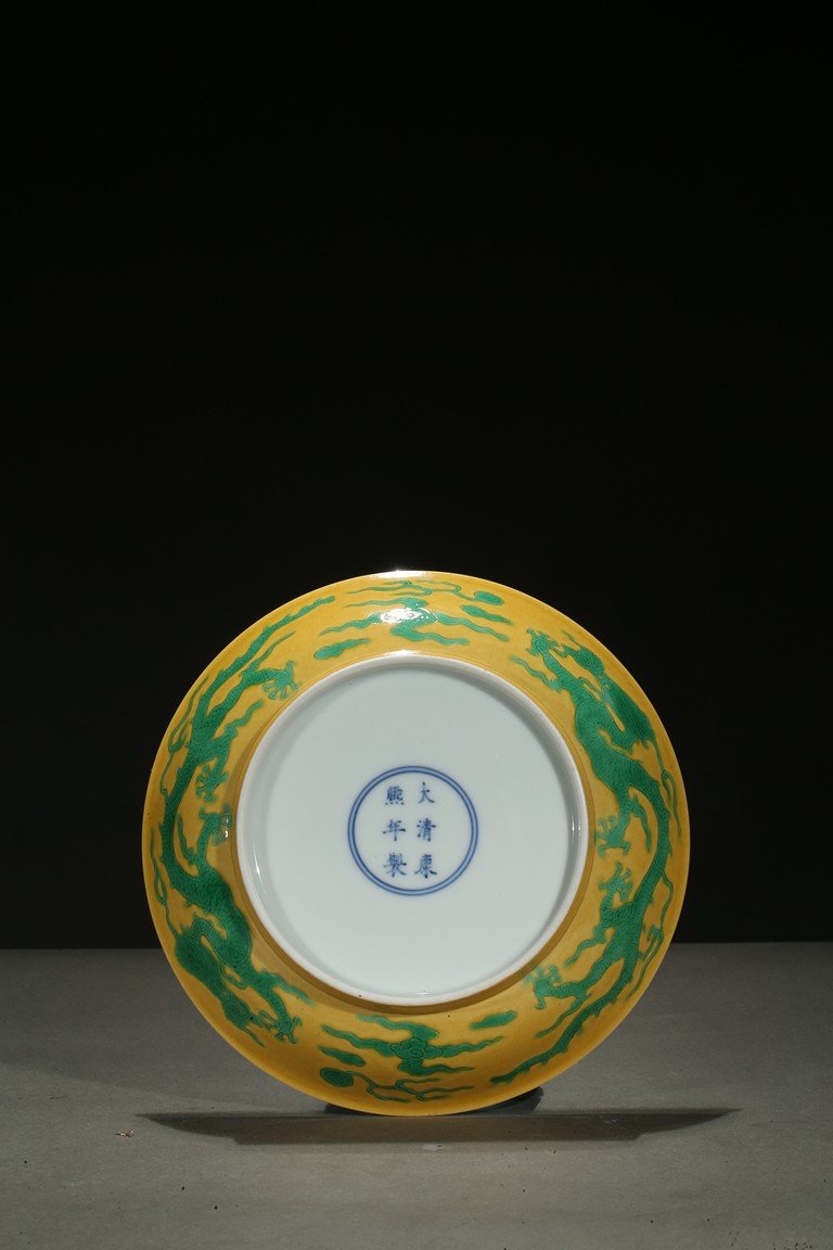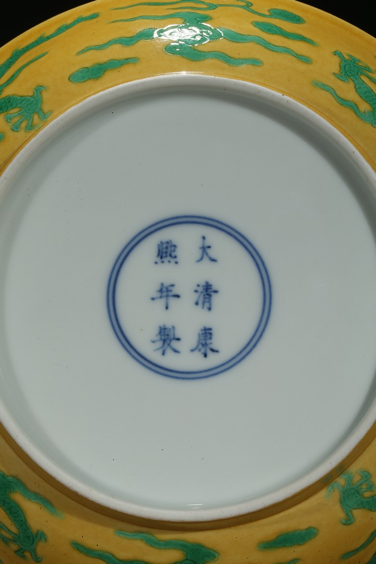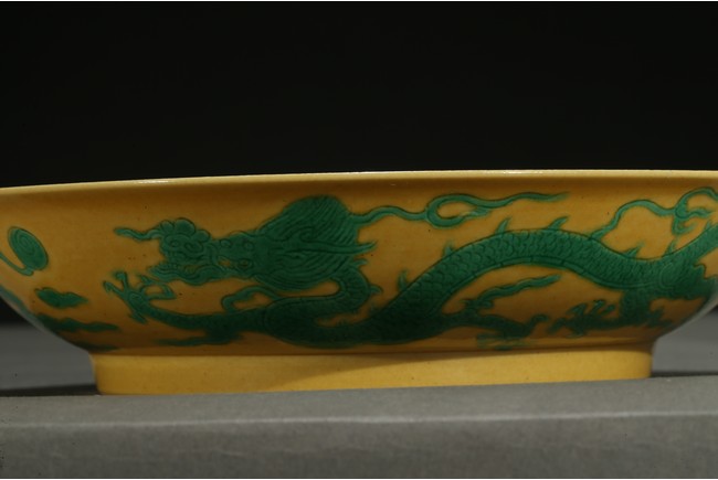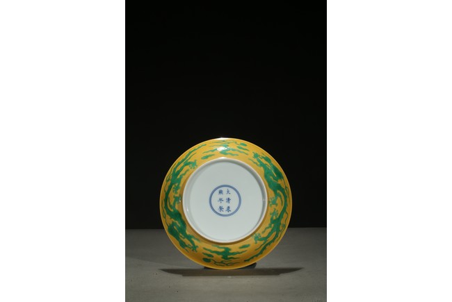 The rounded sides rising from a short foot, incised to the exterior with two writhing dragons contesting flaming pearls, the interior glazed in yellow, the base inscribed with a six-character reign mark. Qing Dynasty period.