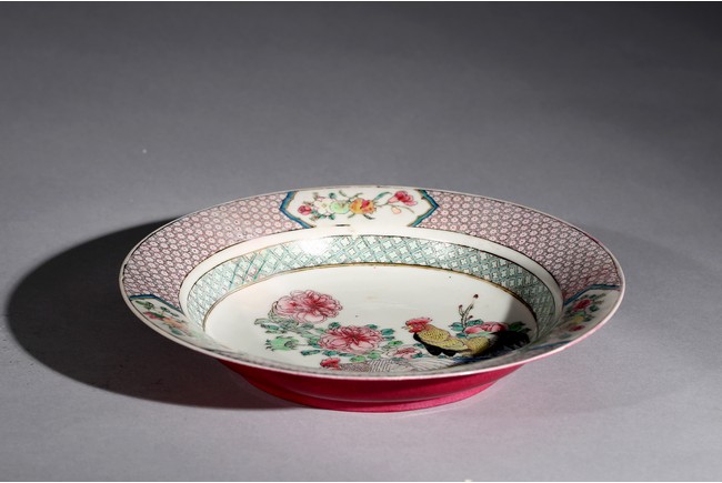 來源:紐約藏家舊藏 1984年購於紐約老牌古董店Rare Art Inc.附發票。類似雍正粉彩薄胎胭脂紅盤, 可參考G. C. Williamson所著The Book of Famille Rose一書第31頁 Provenance: Private collection, New York. Purchased from Rare Art Inc. in 1984. Please refer to a related Yongzheng period famille rose ruby back egg shell dish, illustrated in G. C. Williamson ‘The Book of Famille Rose’, London, 1927, pl. 31.