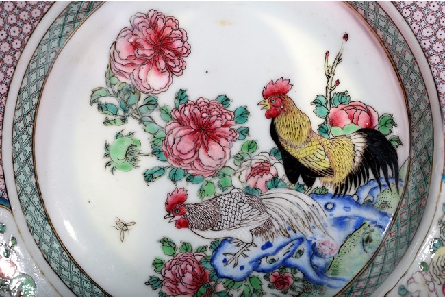 The interior is exquisitely decorated with the scene of two roosters setting upon rockwork next to large leafy peony blossoms to the background, all within a light green ground floral band beneath floral diaper band on the inverted rim interrupted by three irregular shaped roundels enclosing leafy finger citron sprigs, the reverse suffused with rich ruby red enamel. Qing Dynasty Yongzheng period.