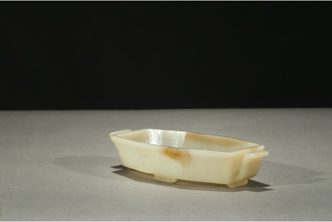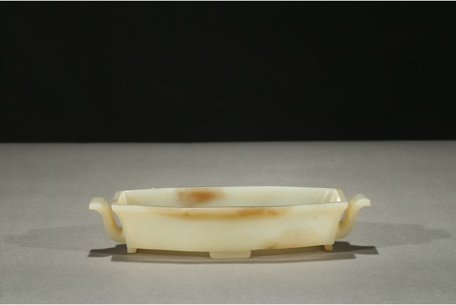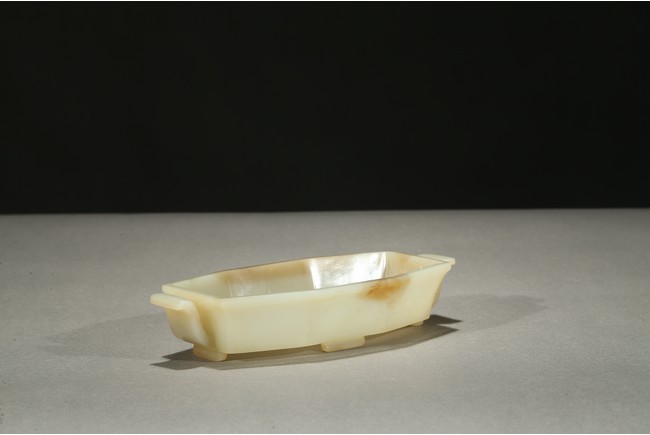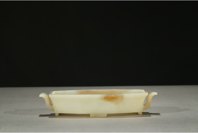 The shaped rectangular washer carved with two s shaped handles and supported on four stubs, the stone is of even white tone with areas of russet inclusions.