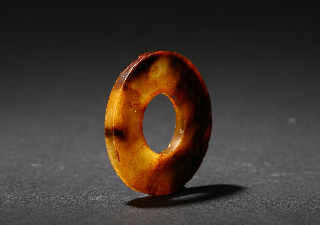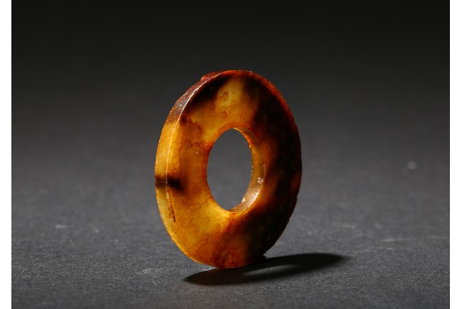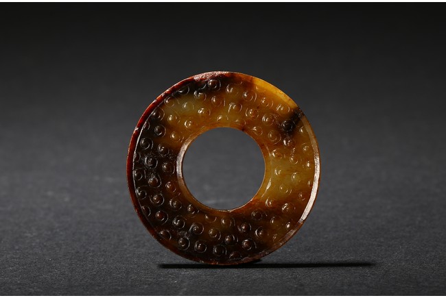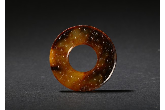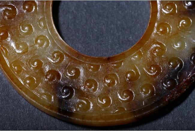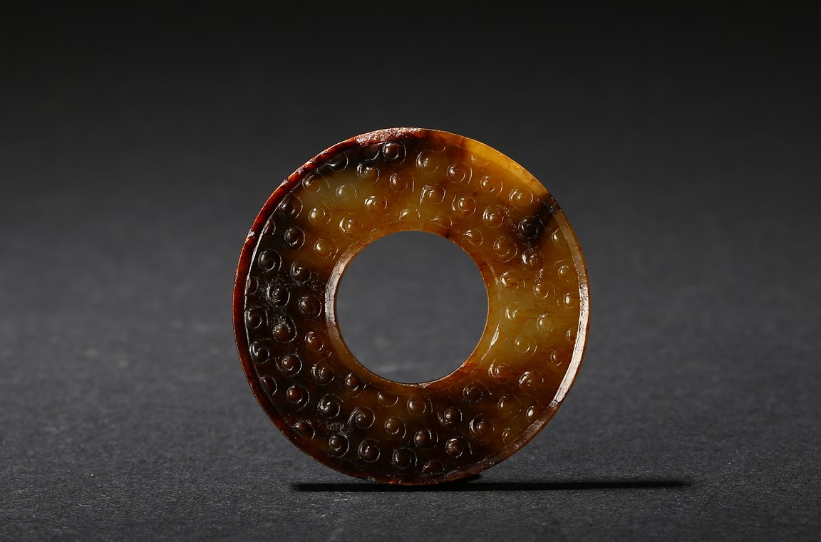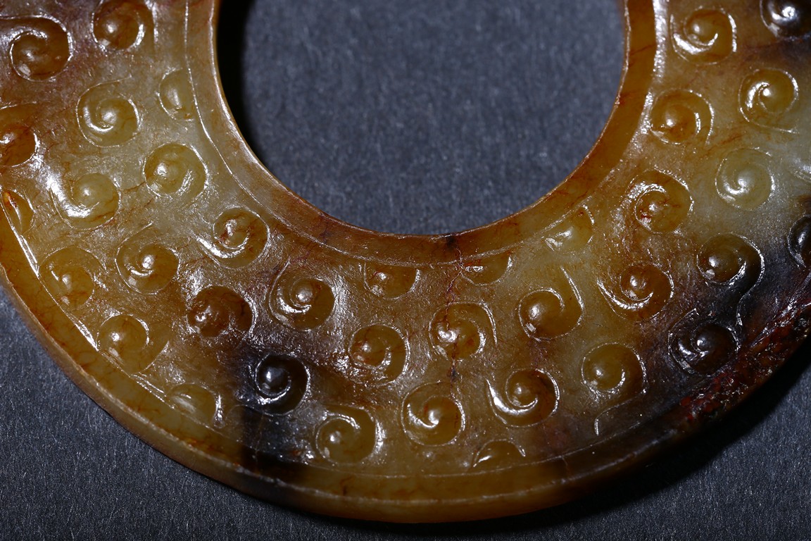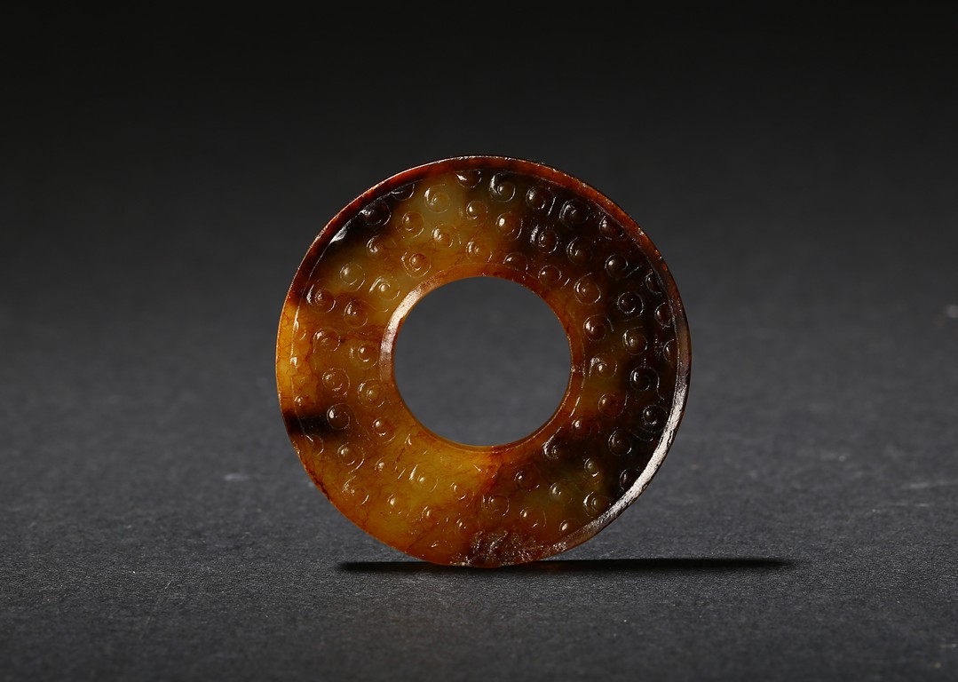 Carved on each side in low relief with a dense pattern of comma-shaped whorls between ridged bands at the rim and center, the stone is of mottled celadon and dark red and black tone. Warring State period.