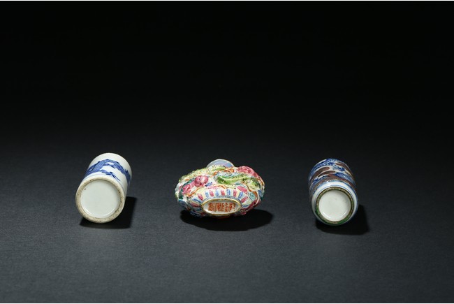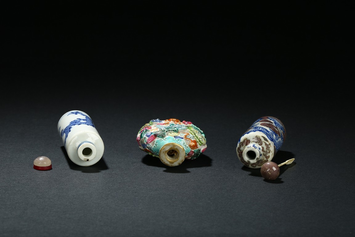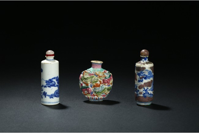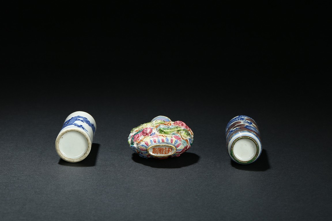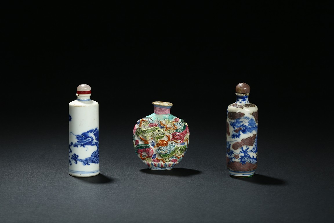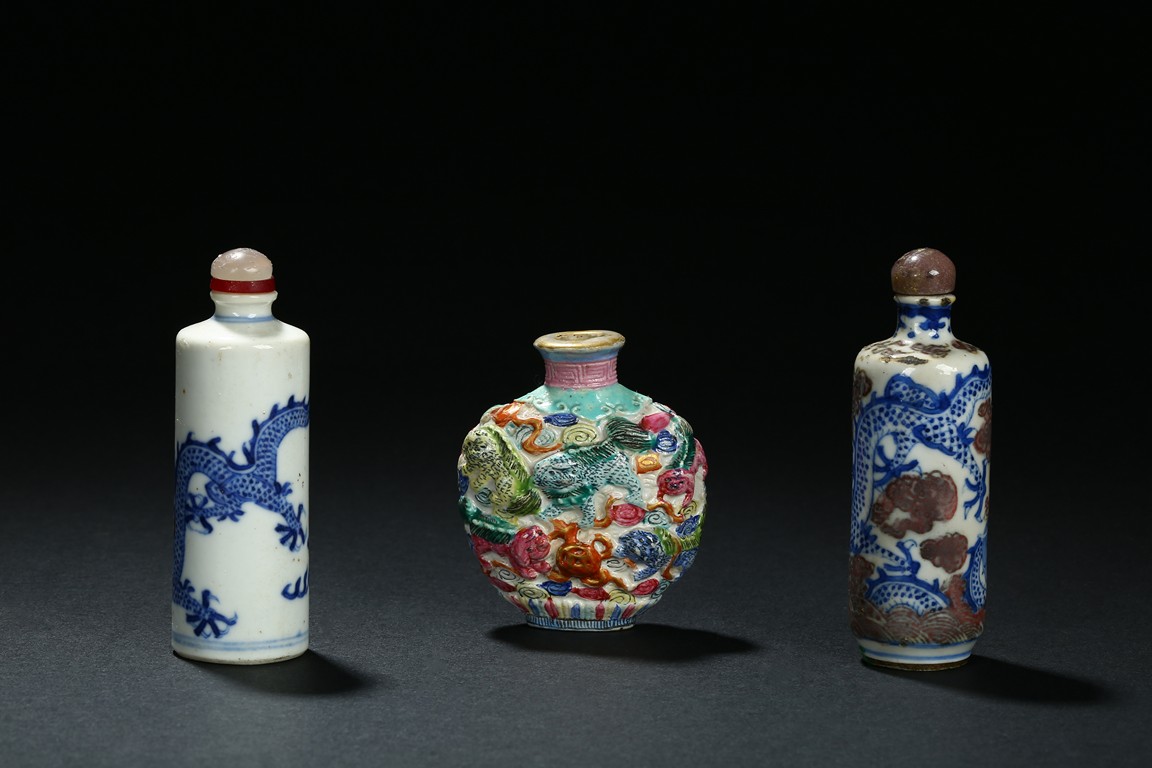 The set includes a cylindrical blue and white 'dragon' snuff bottle; a moulded ceramic 'lion' snuff bottle; and a blue and white underglaze red 'dragon' snuff bottle. Qing Dynasty period.