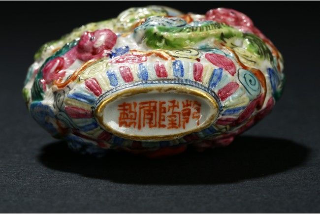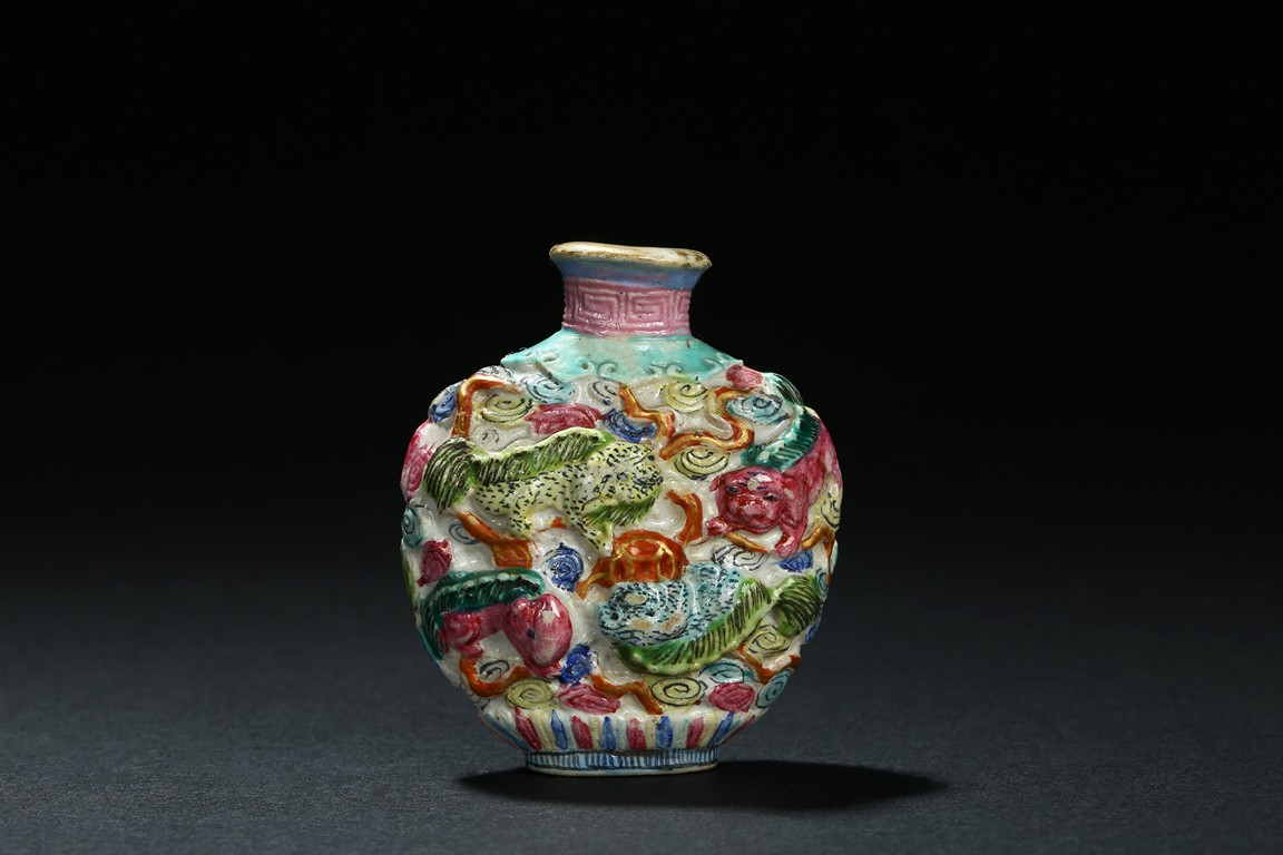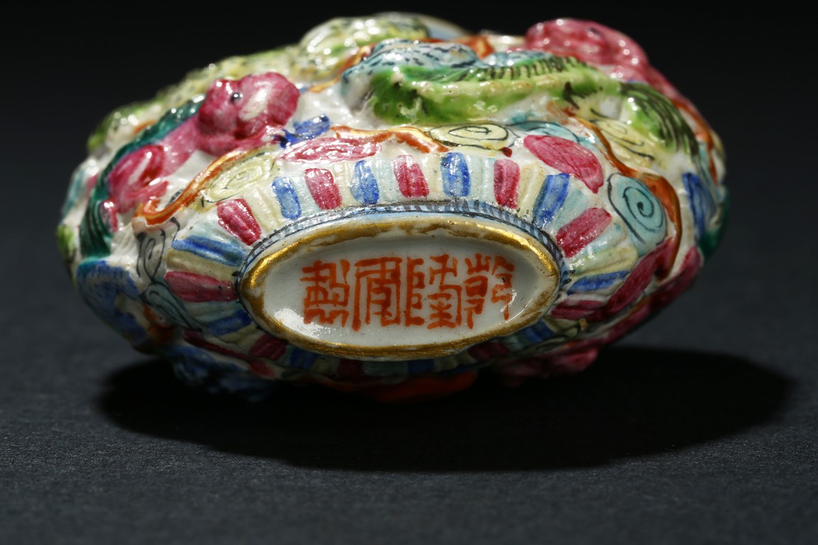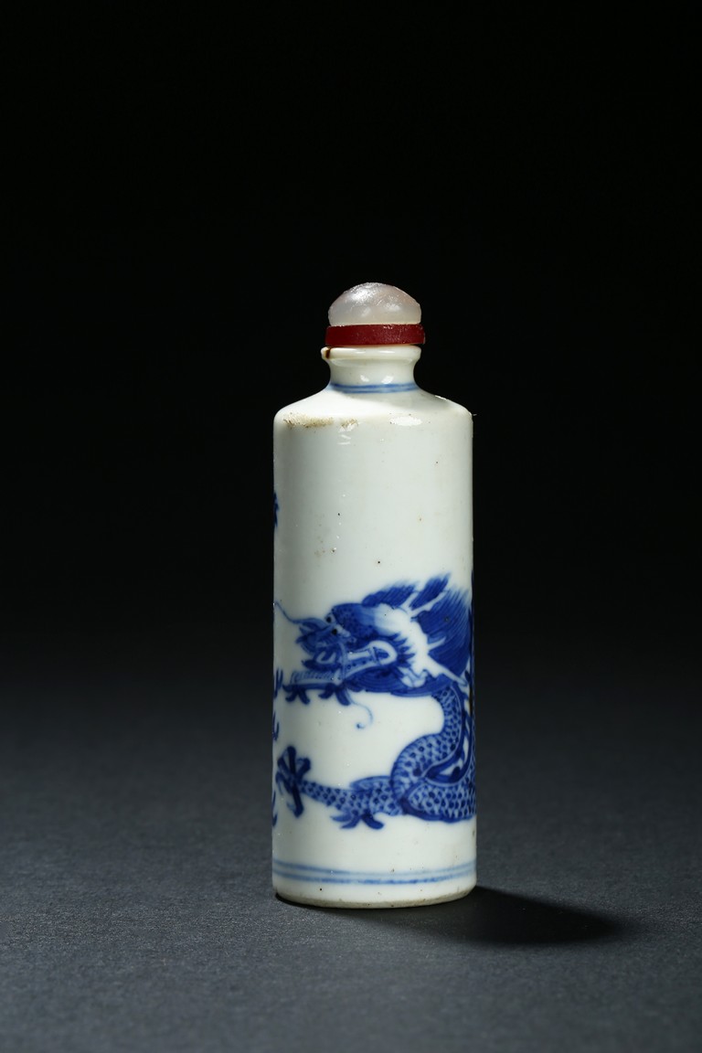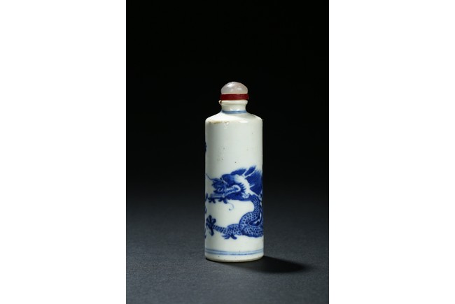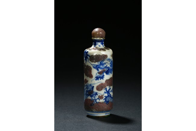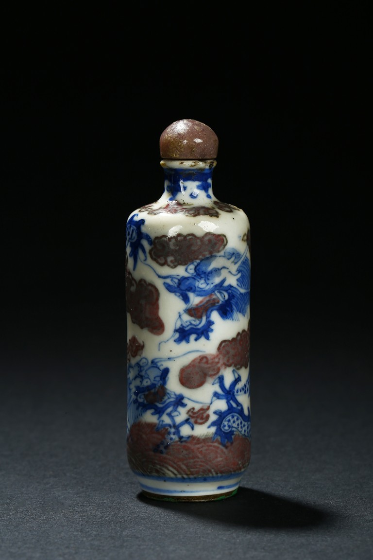 The set includes a cylindrical blue and white 'dragon' snuff bottle; a moulded ceramic 'lion' snuff bottle; and a blue and white underglaze red 'dragon' snuff bottle. Qing Dynasty period.