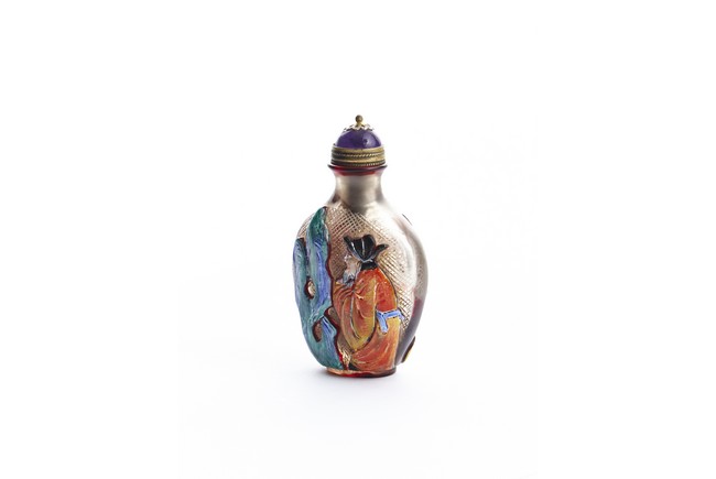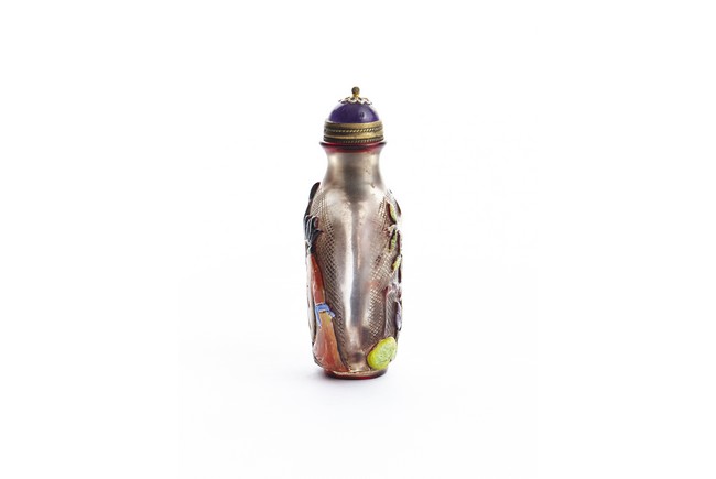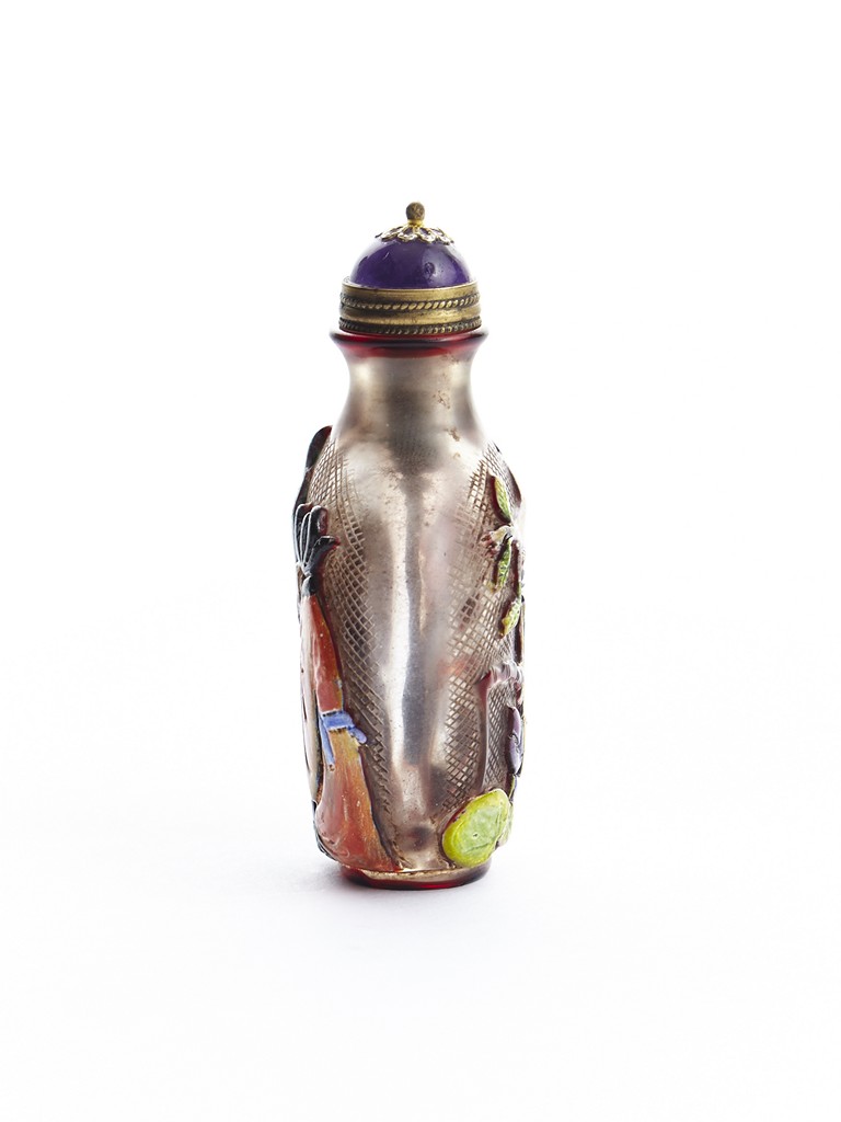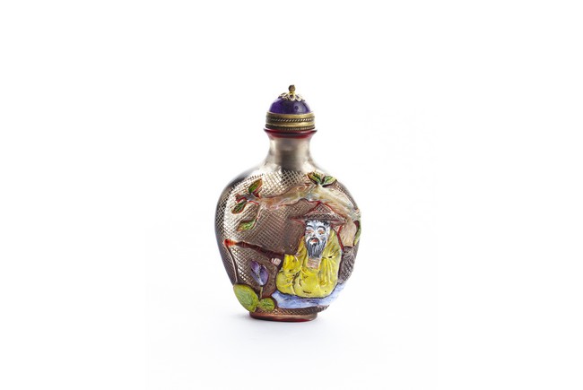 Of ovoid form, the snuff bottle is carved through with on one side with an elderly gentleman fishing under a tree, the other side with a literati by rockwork, all finely painted in various colors and reserved on network ground. The base bears mark Nei Fu.