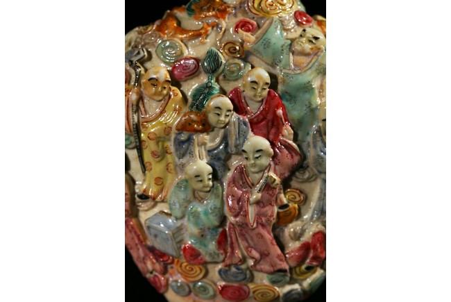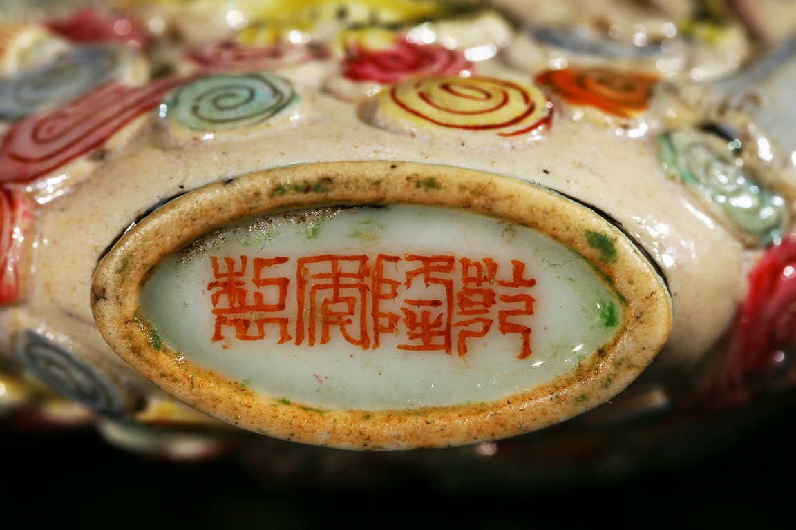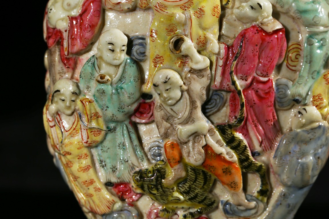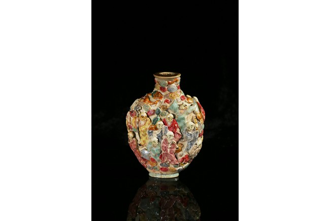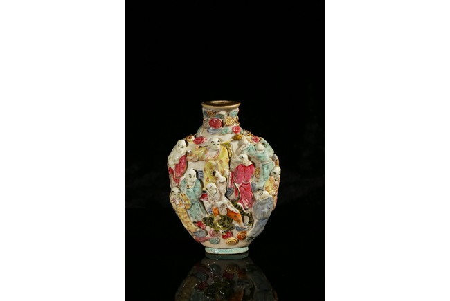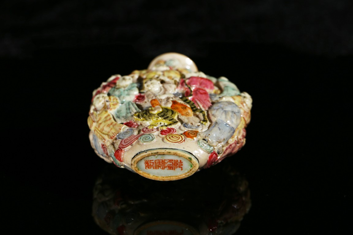 The bottle is crisply molded with a dragon and the Eighteen Luohan, each with his attribute, standing on clouds against a formalized wave ground. The mouth rim is gilt-painted. The base painted with four character 'QIANLONG' mark. Qing Dynasty period.