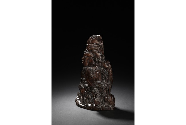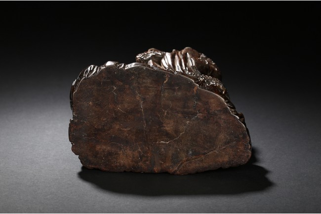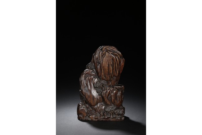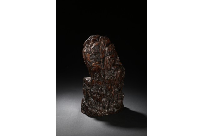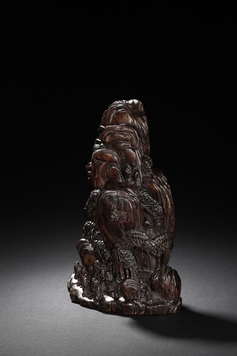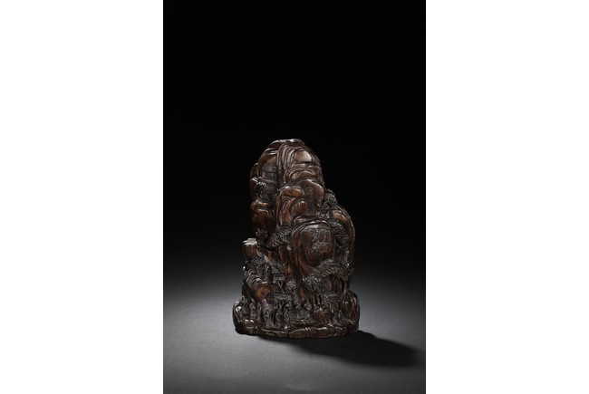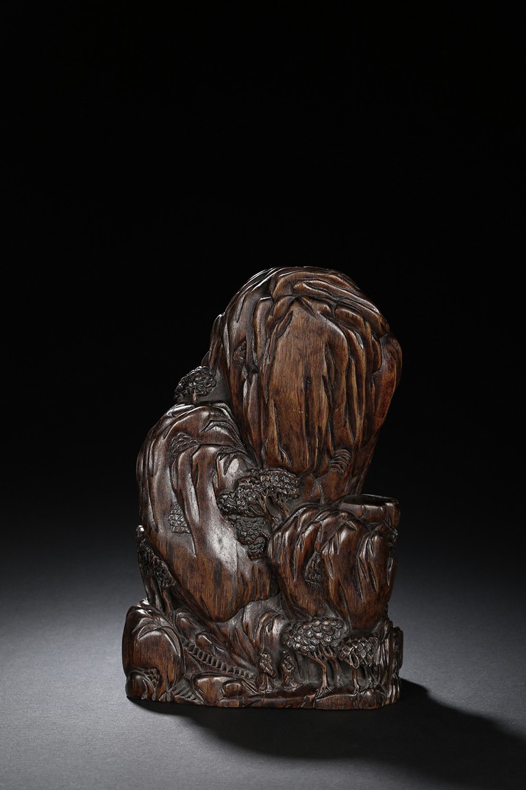 The boulder is of irregular mountain form, carved with various figures, trees, and pavilion around the boulder. Qing Dynasty period.