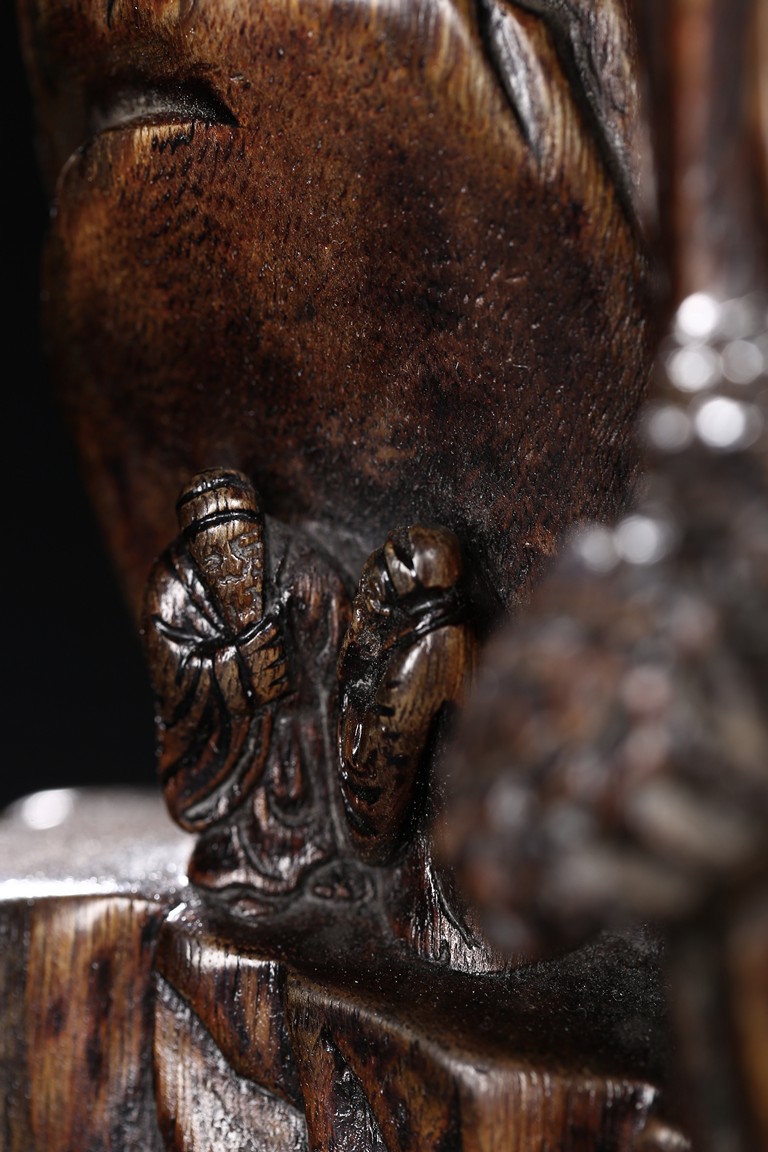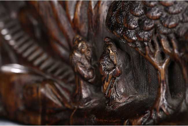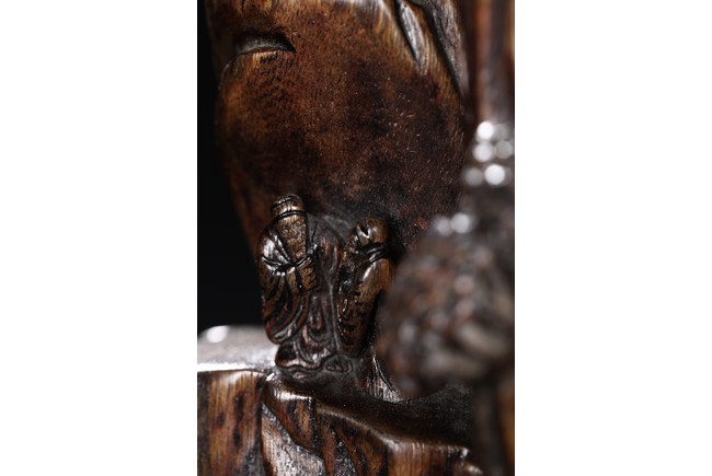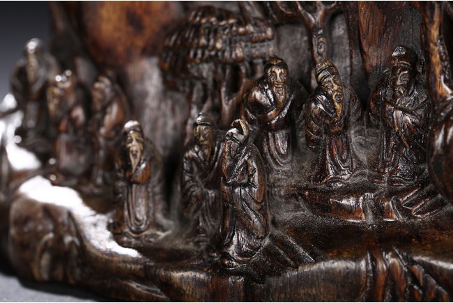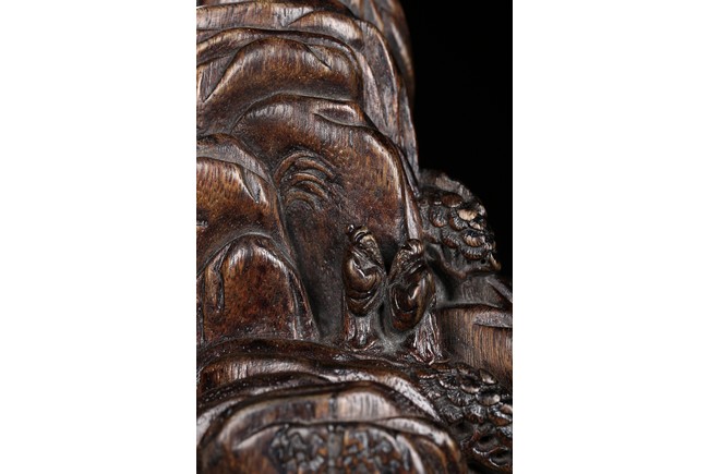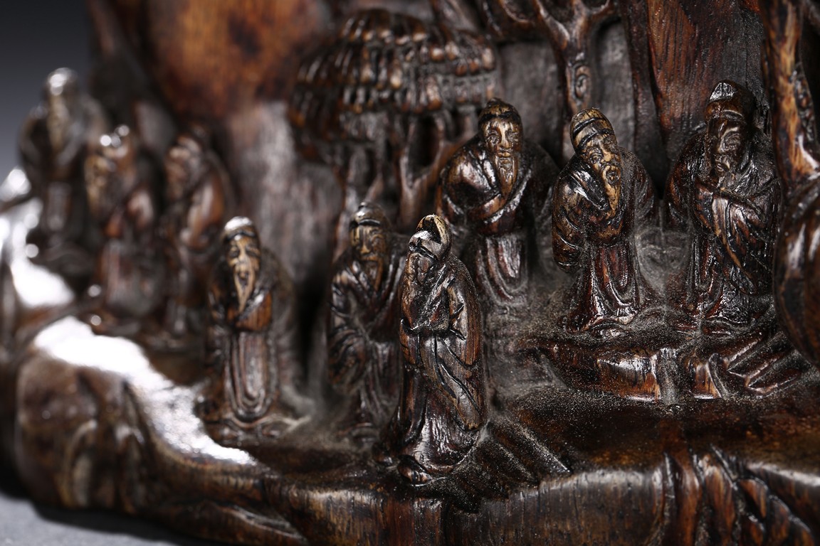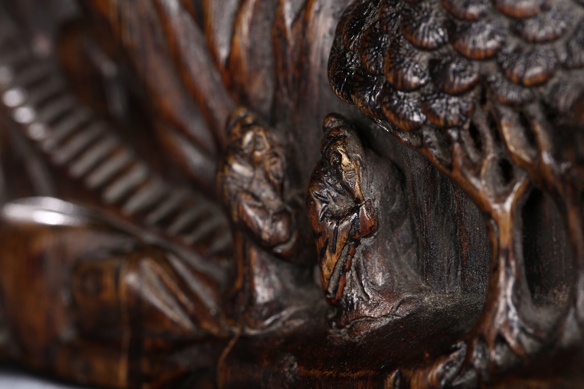 The boulder is of irregular mountain form, carved with various figures, trees, and pavilion around the boulder. Qing Dynasty period.