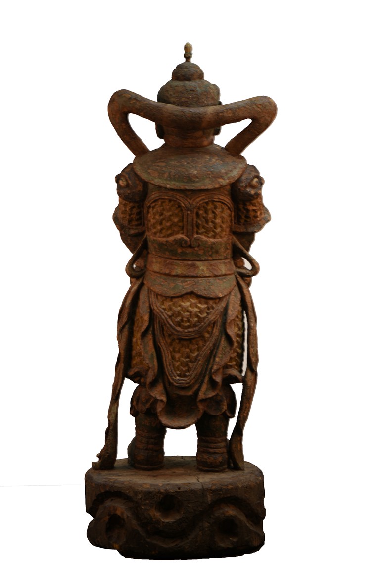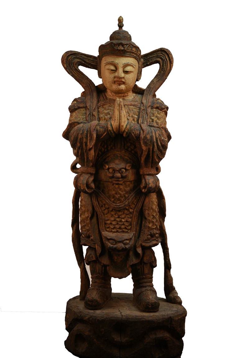 Shown standing upon a wooden base, wearing heavy armour, hands clasped in one, with ribbon across shoulder, the face with serene expression. Qing Dynasty period.
