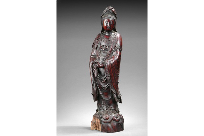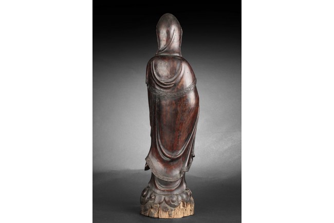 Standing gracefully on the ocean wave, her right hand with a vase pouring downwards, her left hand assisting, looking downwards in serene expression, the Guanyin dressed in in loose and long robe, wearing a long cowl and ornaments. Qing Dynasty period.