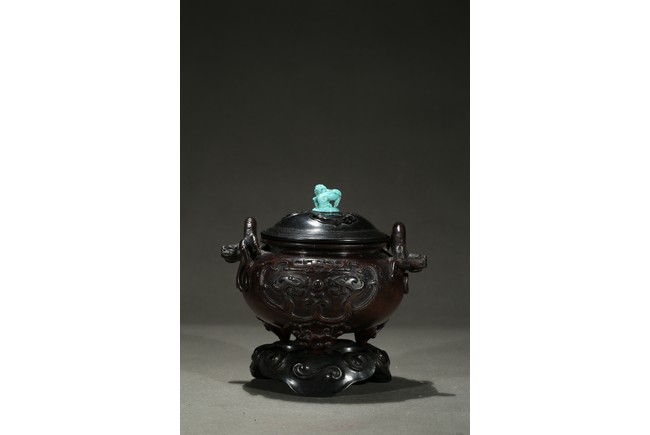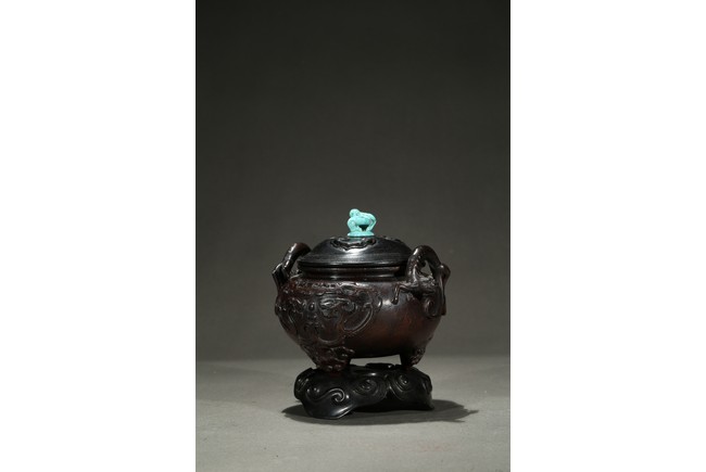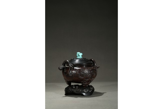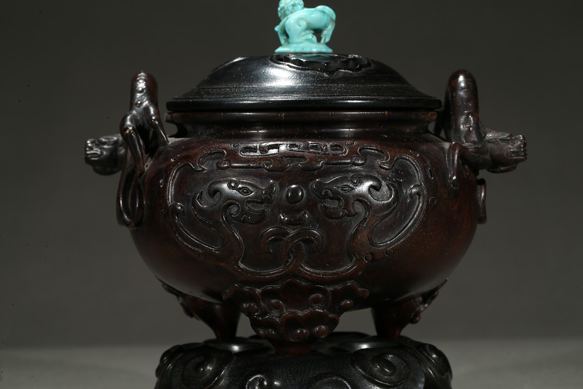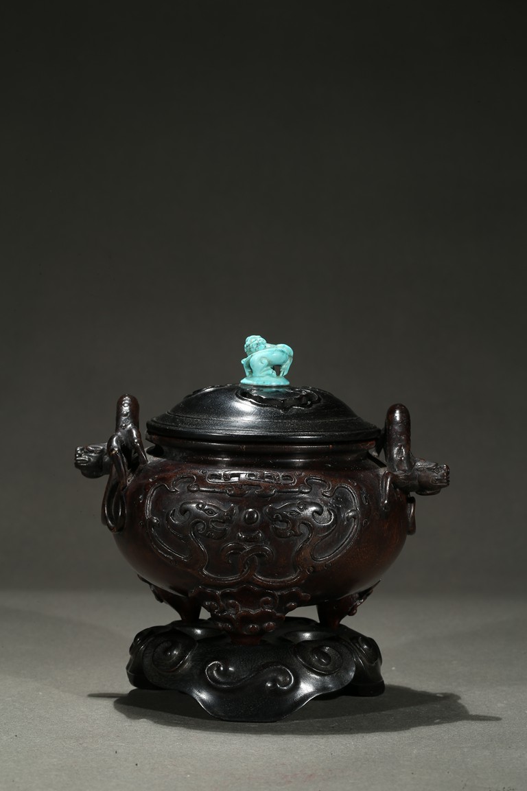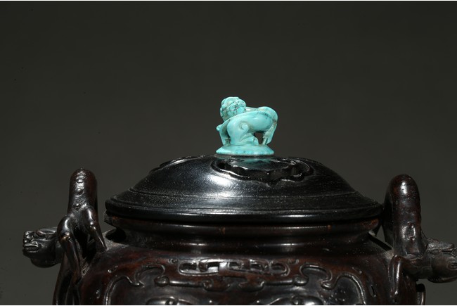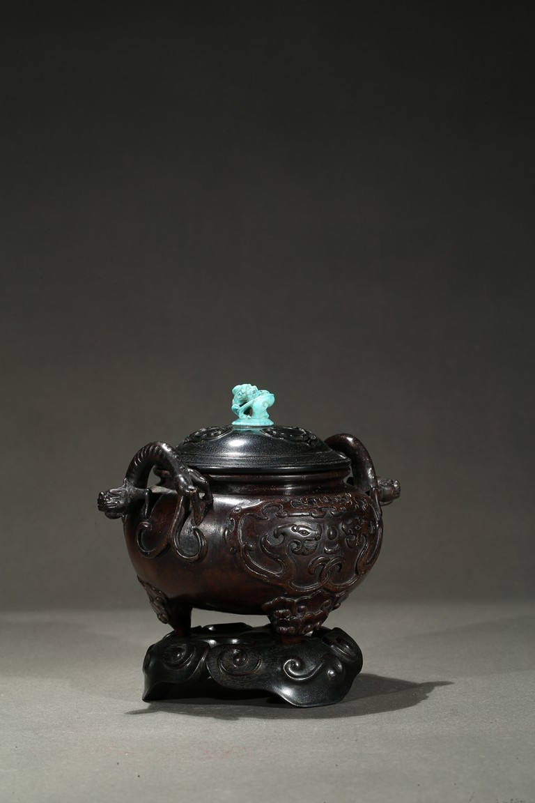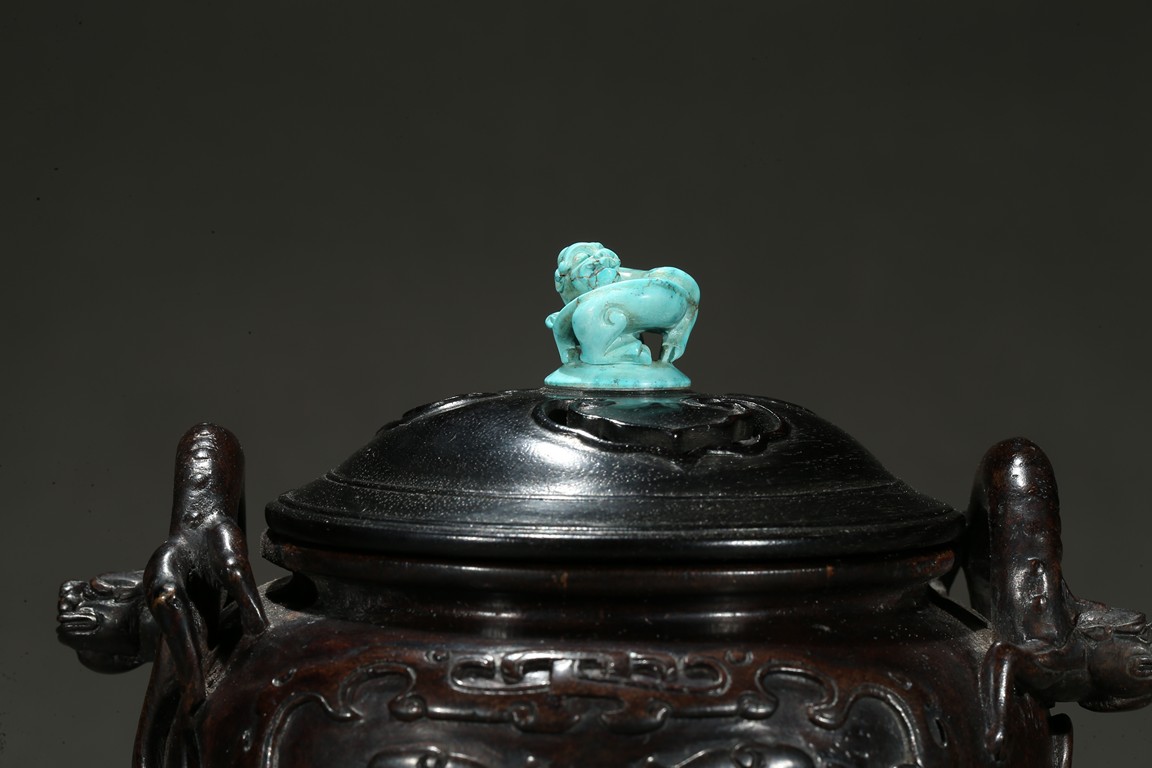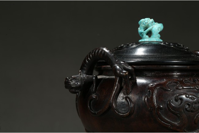 The compressed globular body carved in relief with two confronted chilong design, the handles modelled in the form of curled chilong in high relief, with a turquoise carved lion as cover finial. Qing Dynasty period.