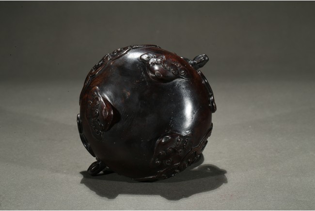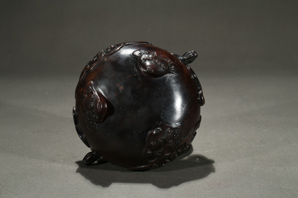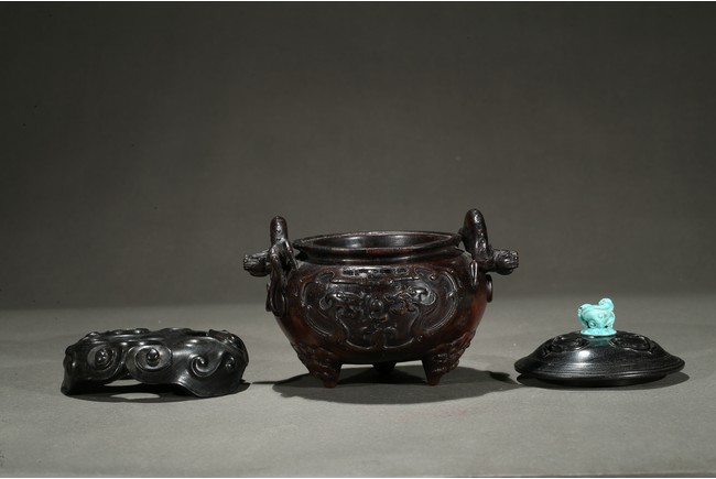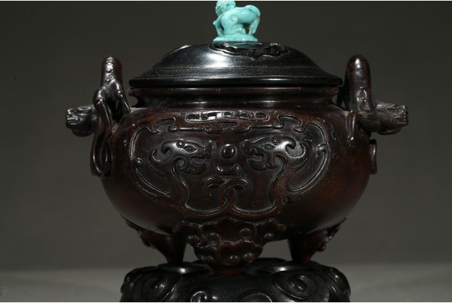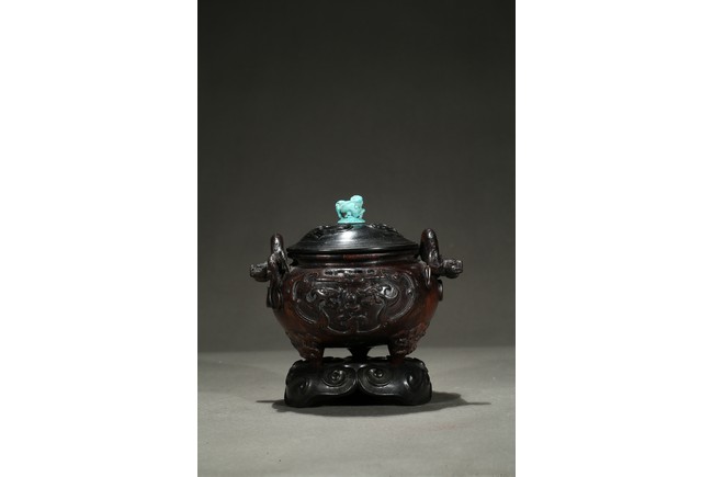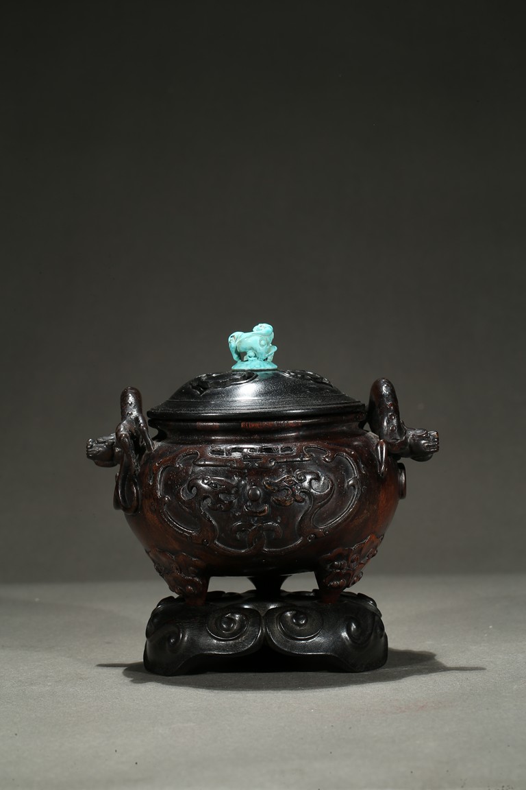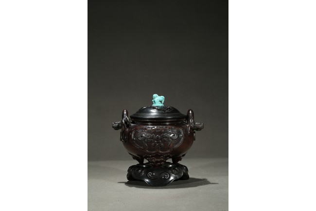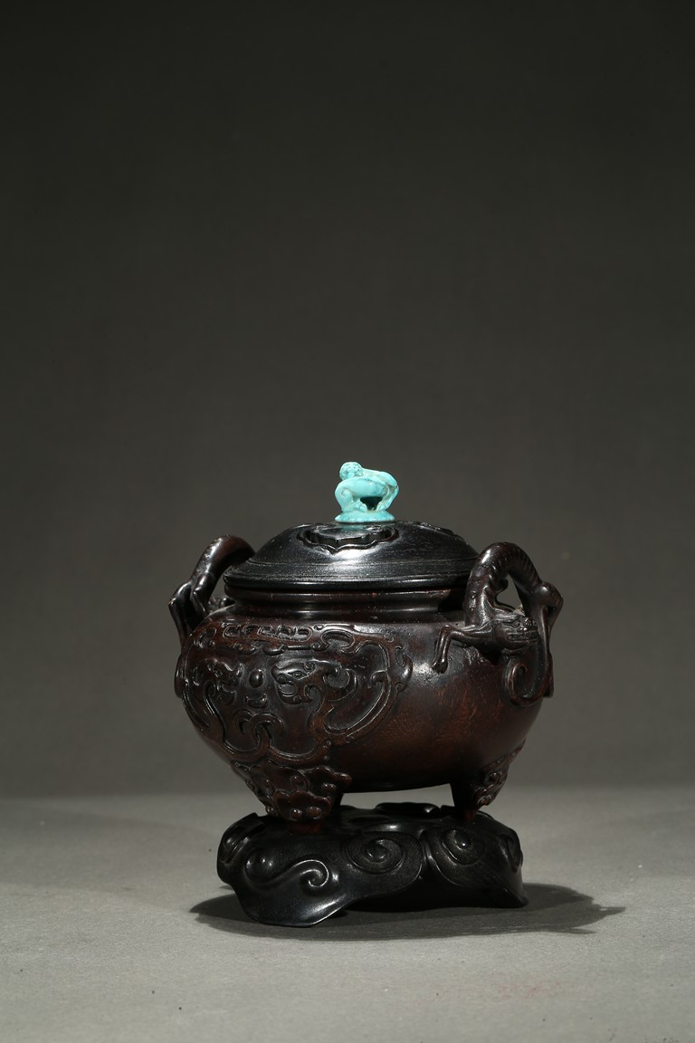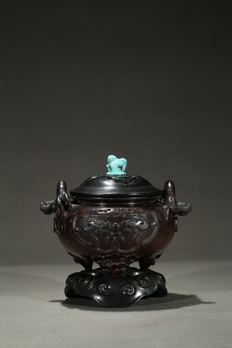 The compressed globular body carved in relief with two confronted chilong design, the handles modelled in the form of curled chilong in high relief, with a turquoise carved lion as cover finial. Qing Dynasty period.