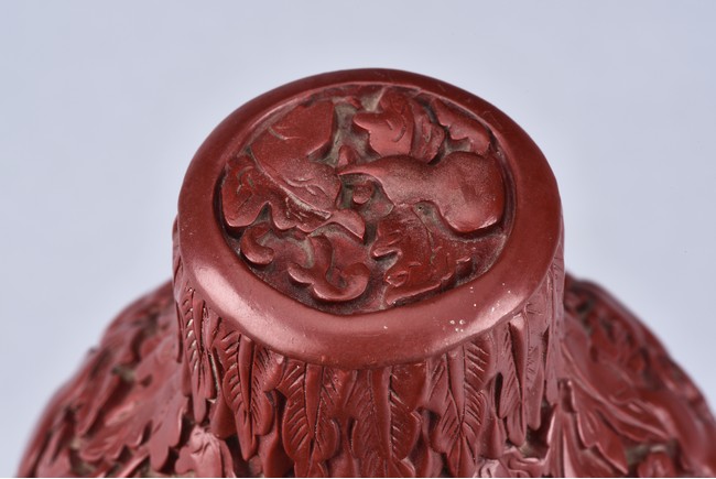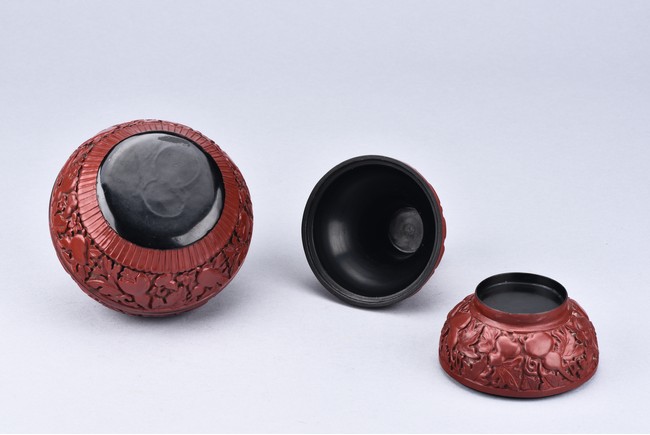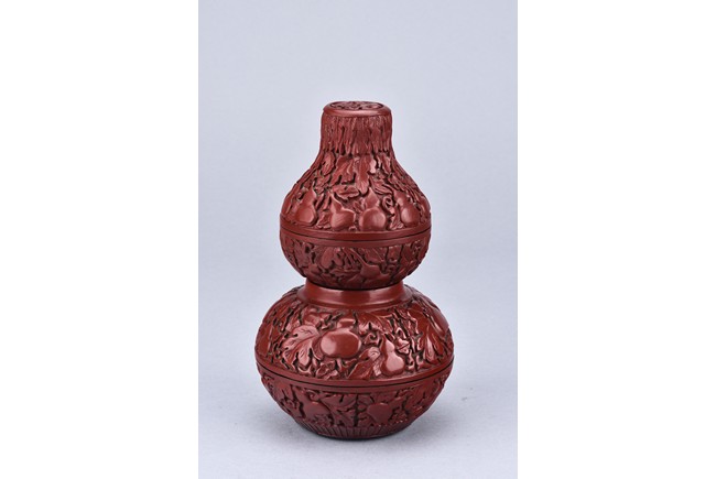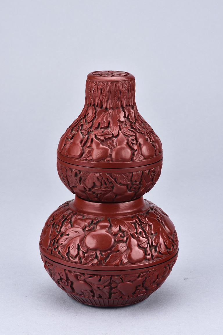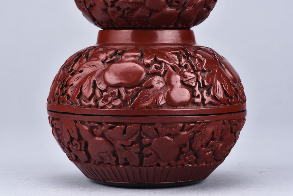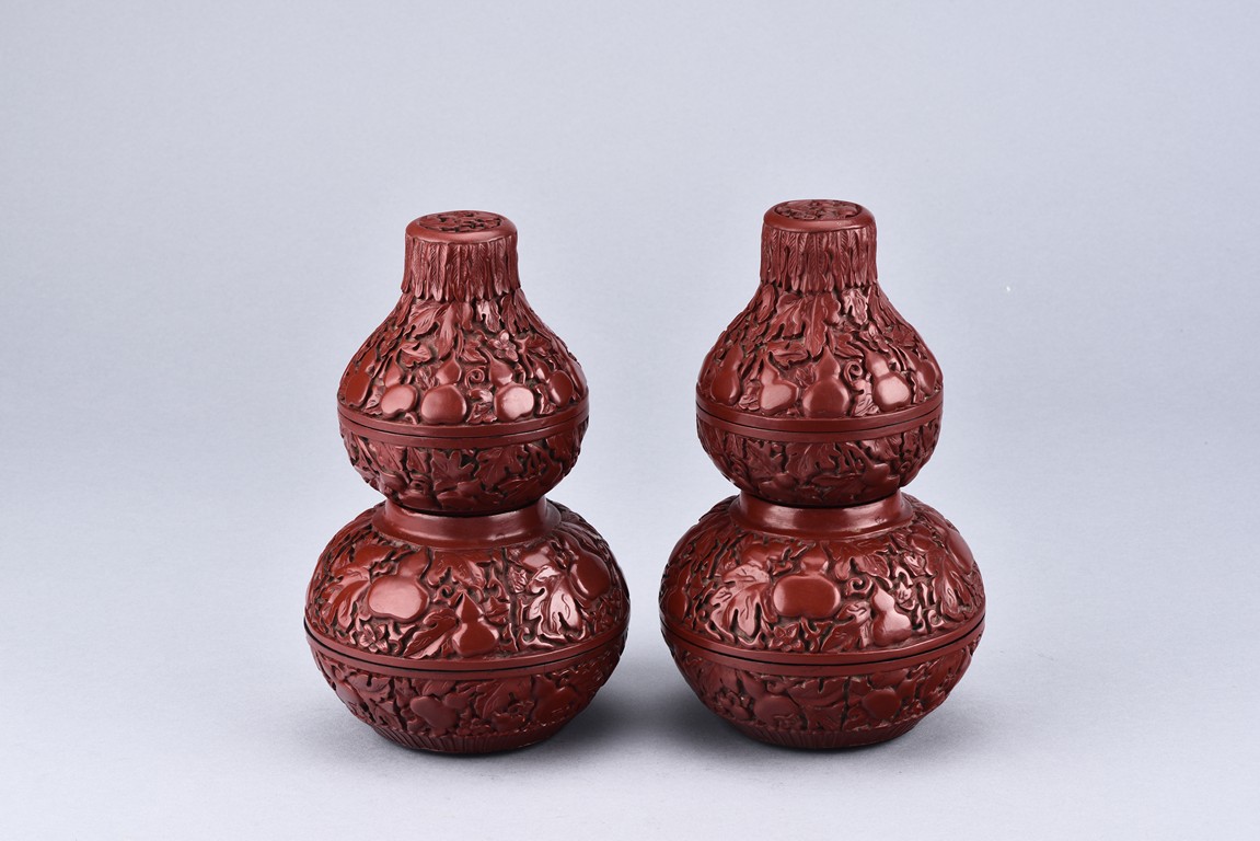 A PAIR OF DOUBLE GOURD CINNABAR LACQUER BOXES    清 剔紅葫蘆蓋盒一對