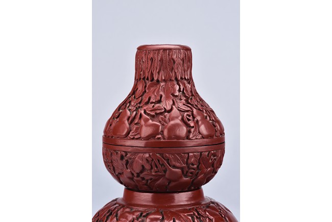 Of double gourd shape, the exterior further carved deeply with leafy double gourds, each section is detachable. Qing Dynasty period.