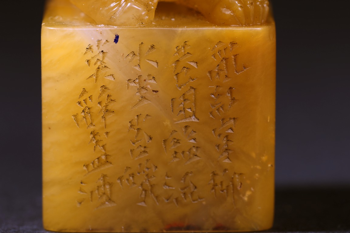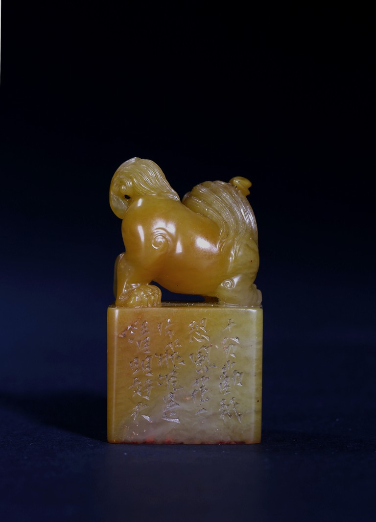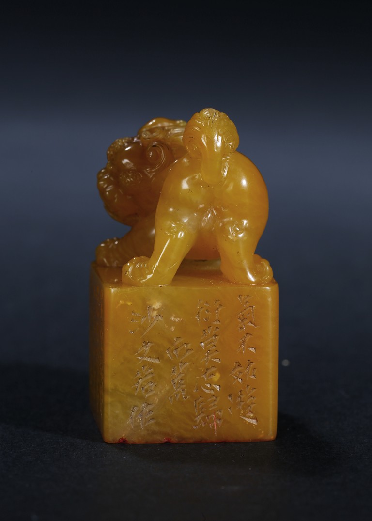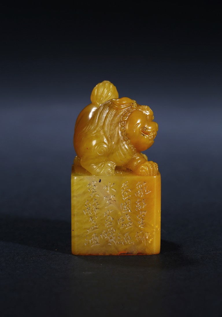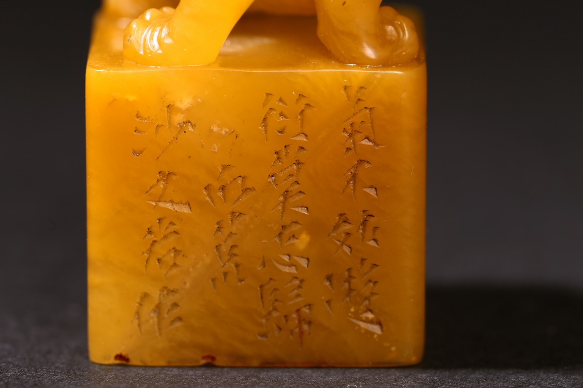 Of square section, surmounted by a well-carved buddhist lion cub with its head turned to the side and playfully holding up its hip and tails, each side of the seal finely inscribed with poetic inscriptions, the seal face inscribed with a four-character in seal script, the well-polished stone is of a warm amber-honey color. Republic period.