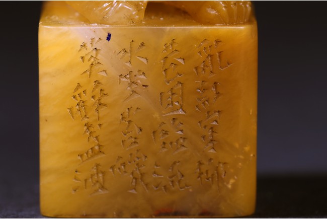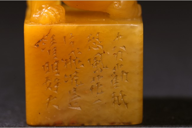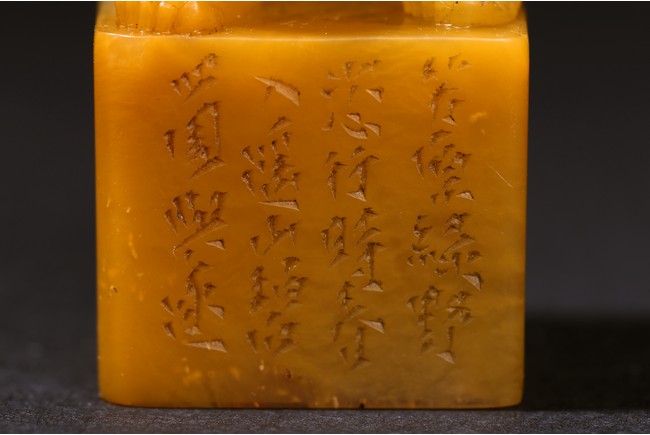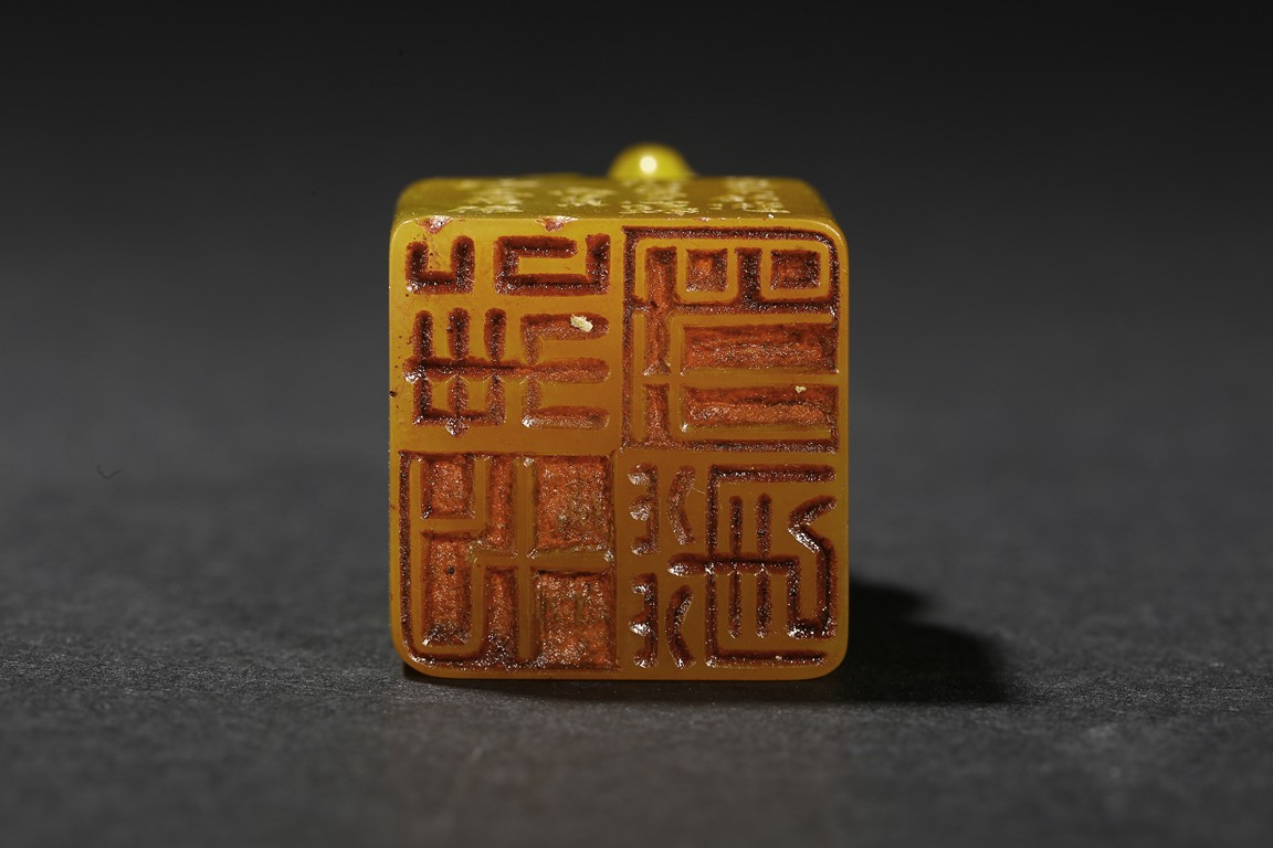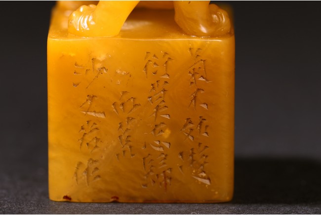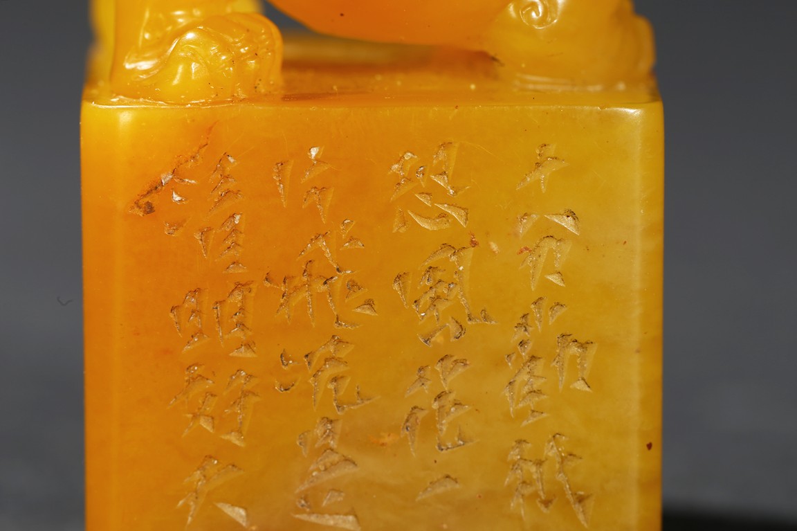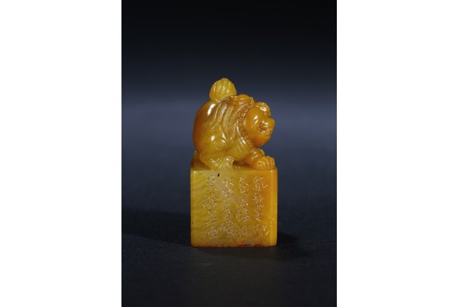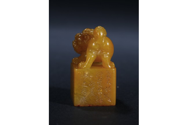 Of square section, surmounted by a well-carved buddhist lion cub with its head turned to the side and playfully holding up its hip and tails, each side of the seal finely inscribed with poetic inscriptions, the seal face inscribed with a four-character in seal script, the well-polished stone is of a warm amber-honey color. Republic period.