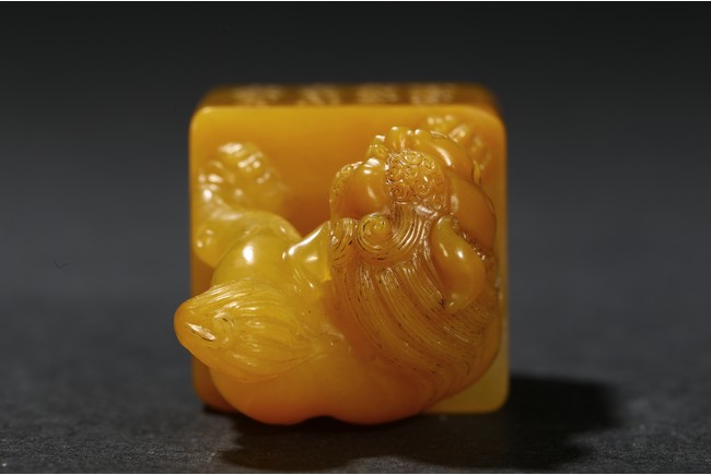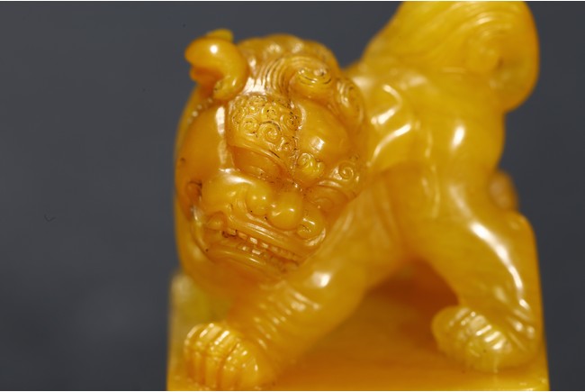 此田黃印章石質潤透凝膩,蘿蔔紋清晰密集,顏色瀅黃鮮亮,印鈕立體圓雕坐獅,俯身扭頭,後背及尾巴翹起,濃眉圓目,體態健碩,肌肉強健有力,闊鼻口略開,毛髮細緻,即威嚴兇猛,又憨態可掬。章形規整挺括,整體刻工精湛,線條流暢,栩栩如生,頗為難得。來源:洛杉磯私人收藏。 Provenance: Private collection, Los Angeles. Compare with a very similar Tianhuang 'bixie' seal (60 g), sold in Sotheby's Hong Kong on April 6, 2016, Lot 3690 可比較一極類似田黃辟邪印(60克),2016年4月售于香港蘇富比,拍品號3690,成交價2,000,000港幣