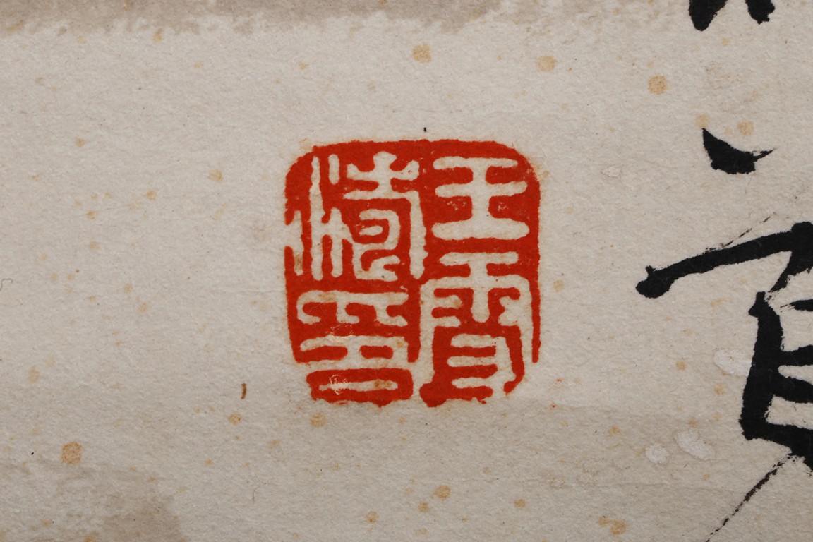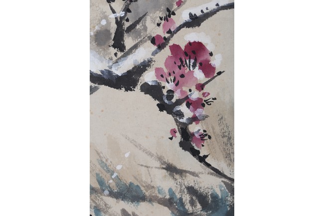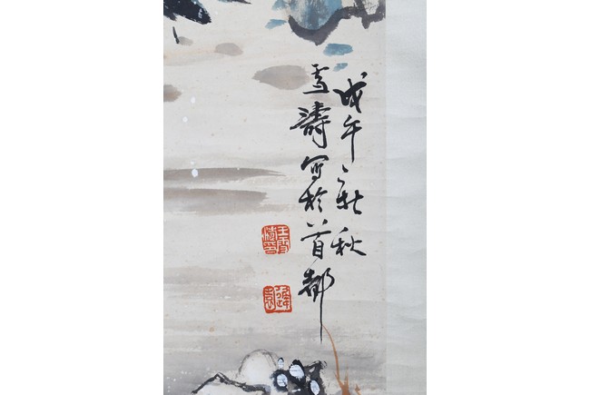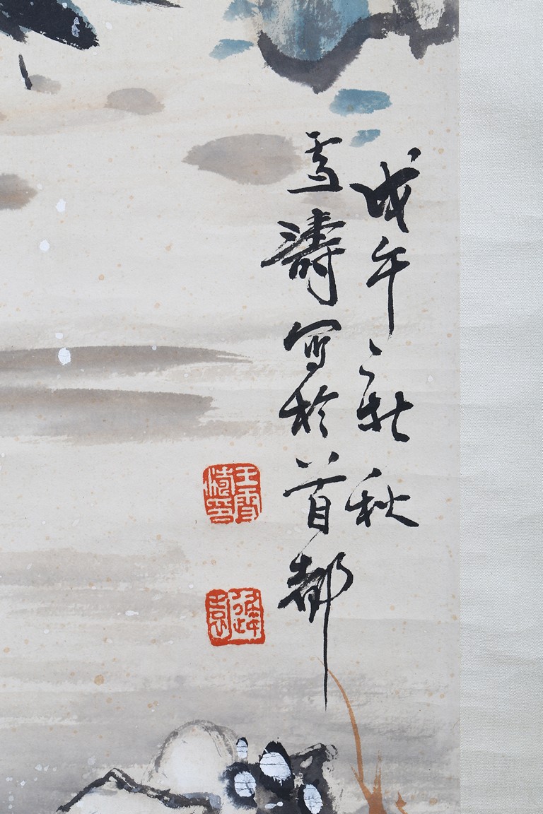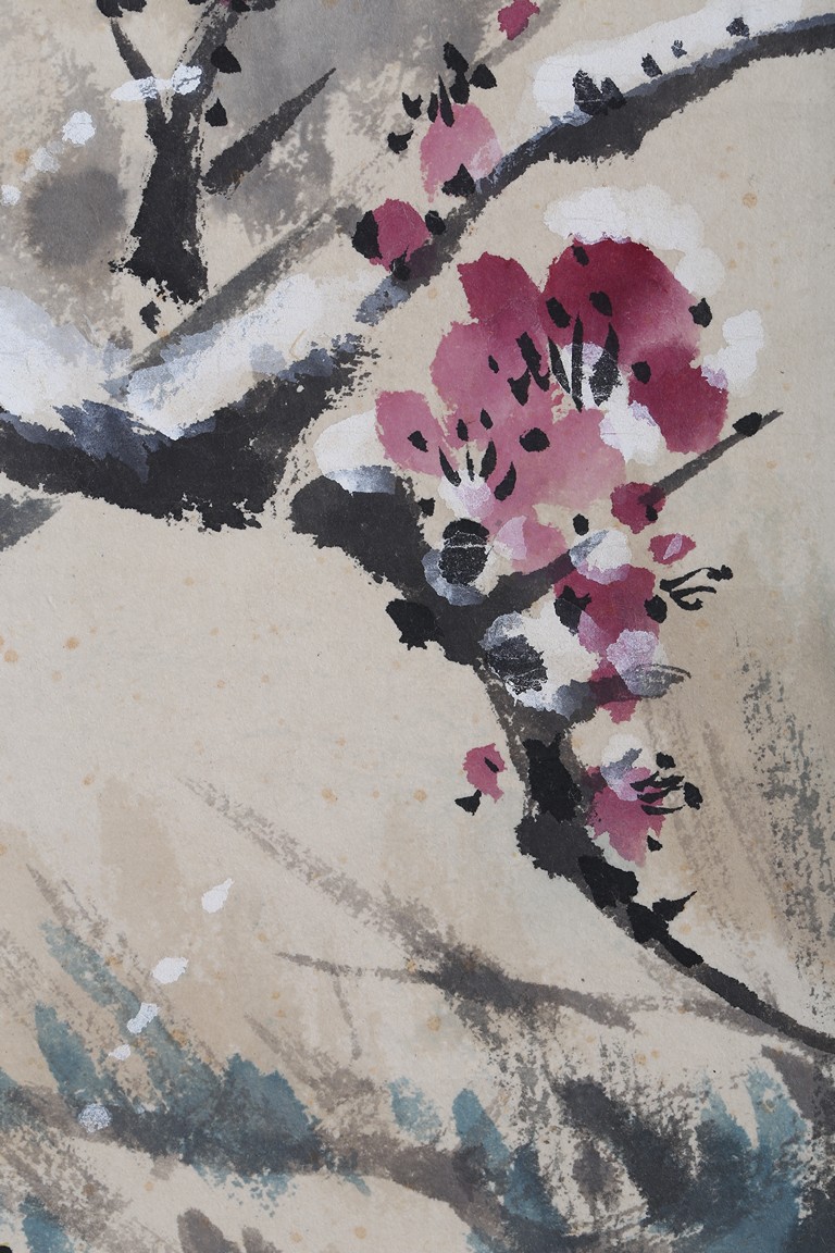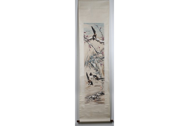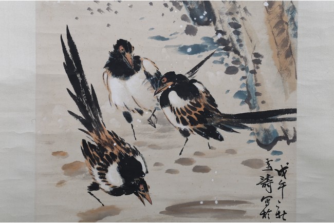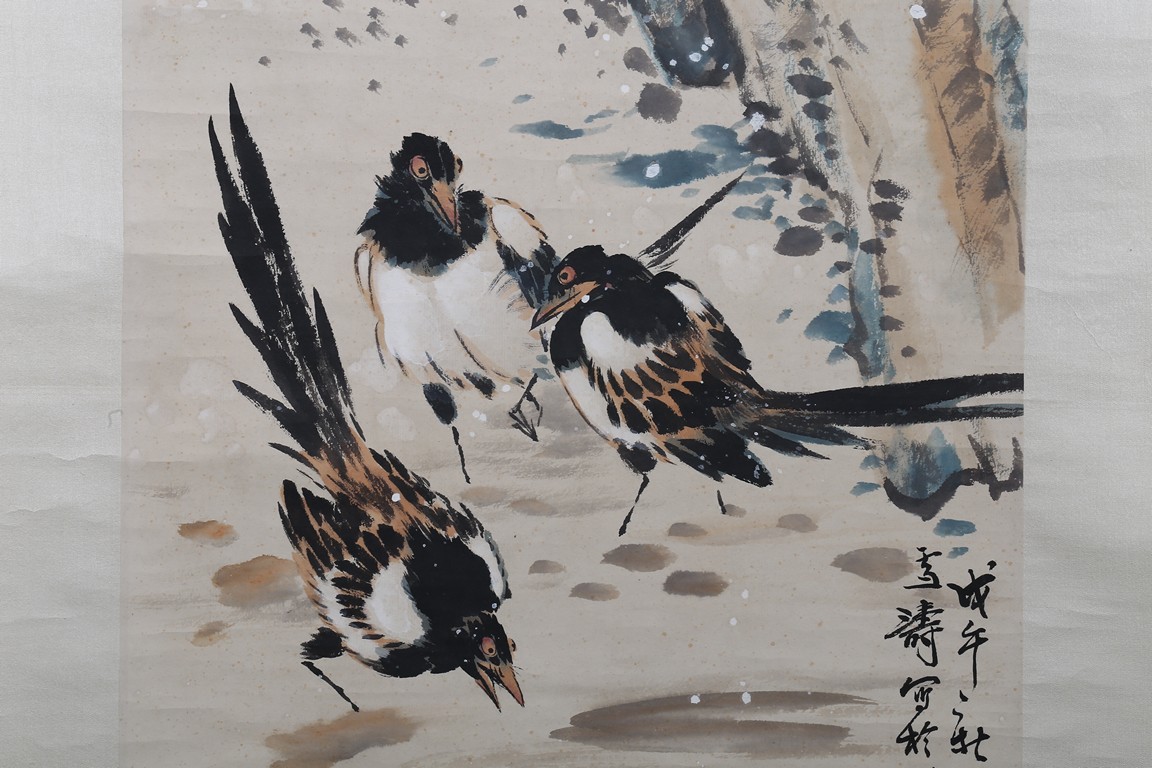 Color and ink on paper. Magpies. Hanging scroll. Inscribed and signed Xuetao and dated to Autumn of 1978, with two seals of the artist's.