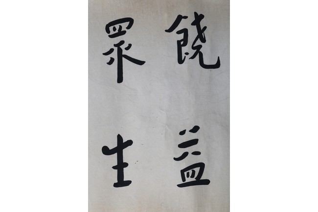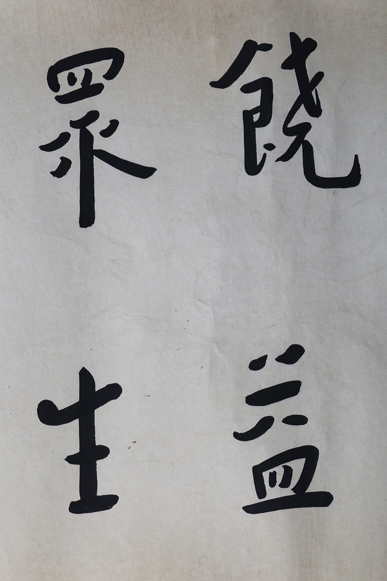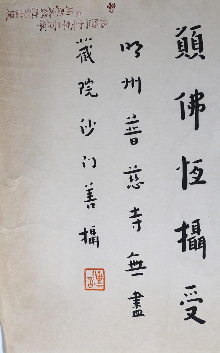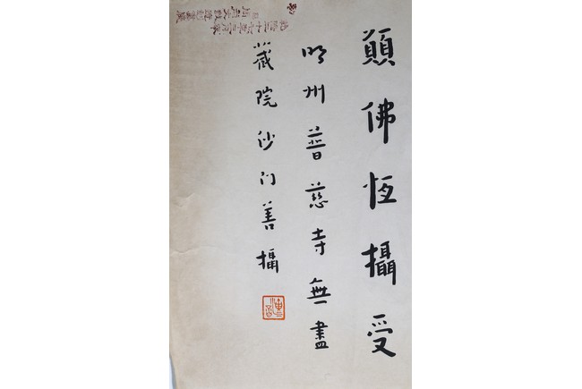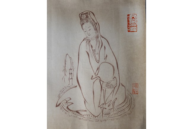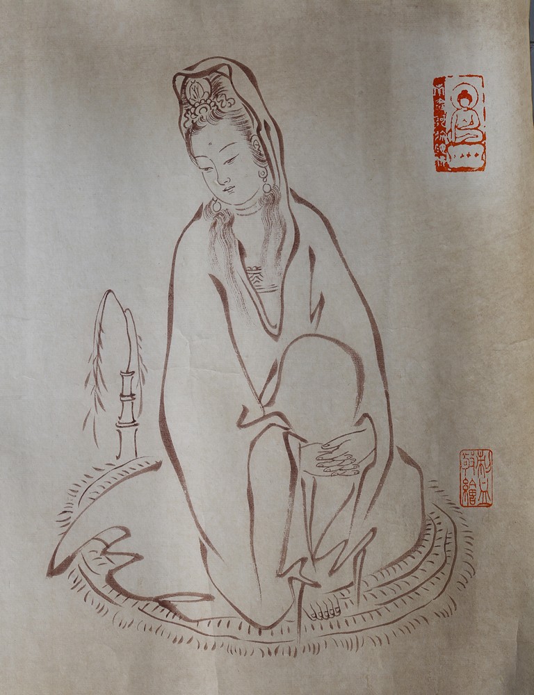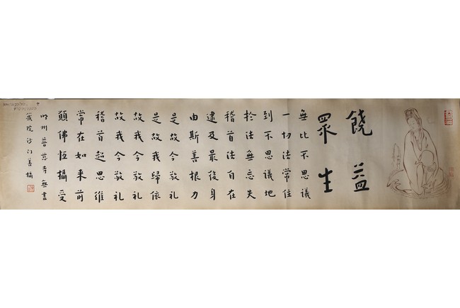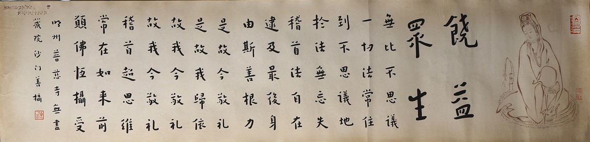 Ink on paper. Regular script calligraphy and drawing of Guanyin. Inscribed and with three seals of the artist's.