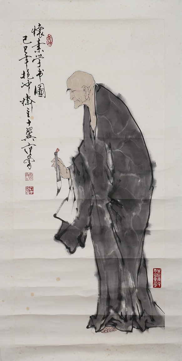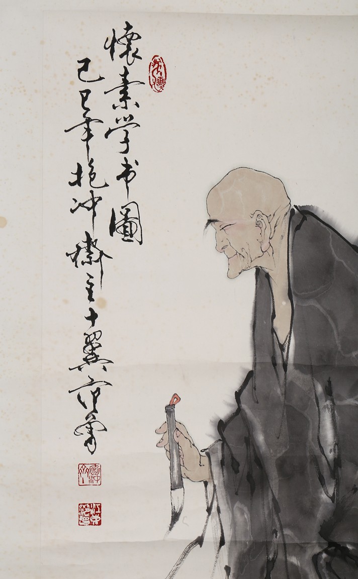 Color and Ink on paper. Huai Su Studying Calligraphy. Mounted for framing. Inscribed and signed Fan Zeng, with four seal marks, dated to the year of 1989